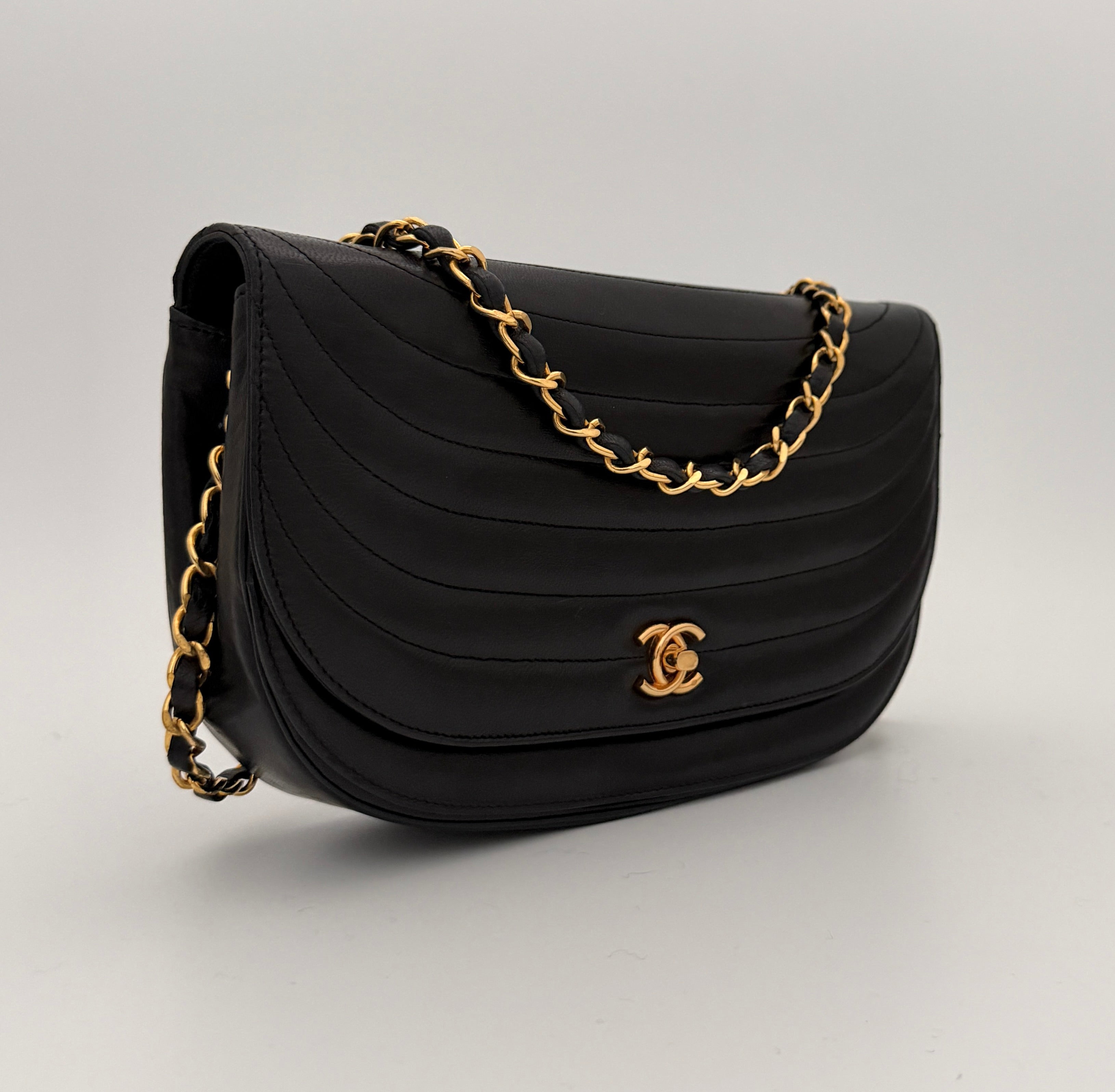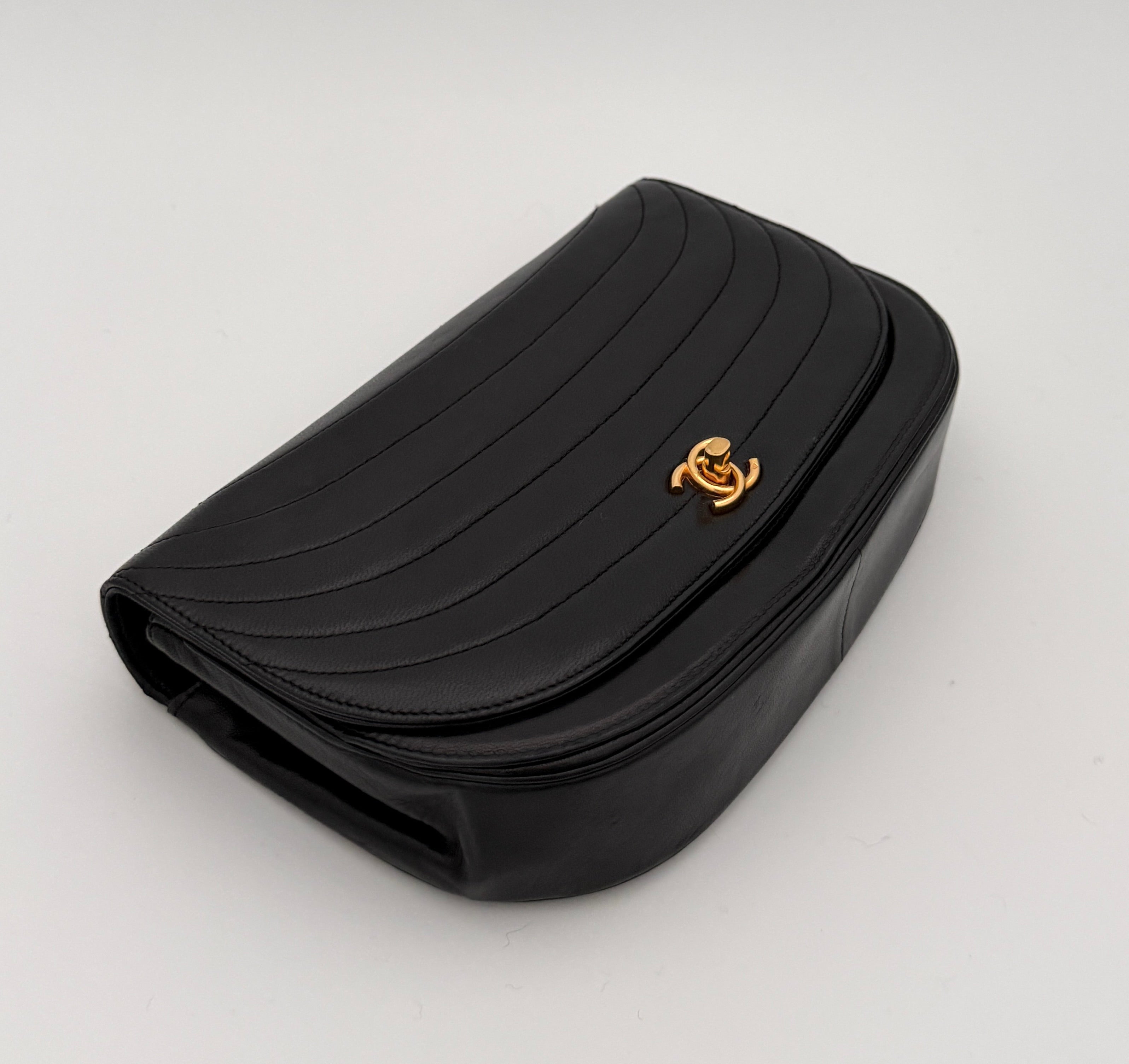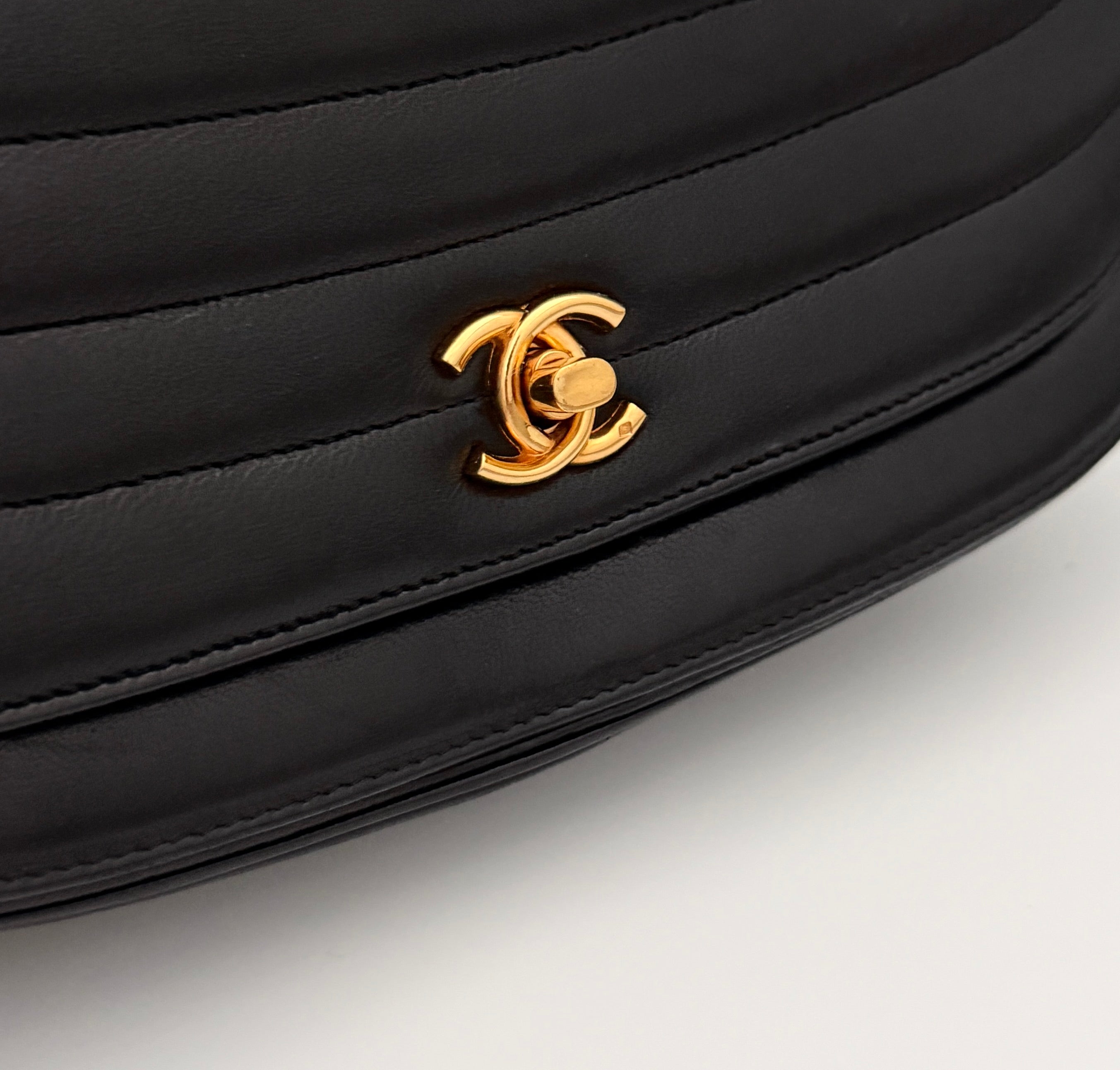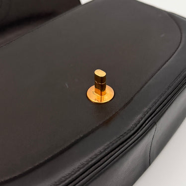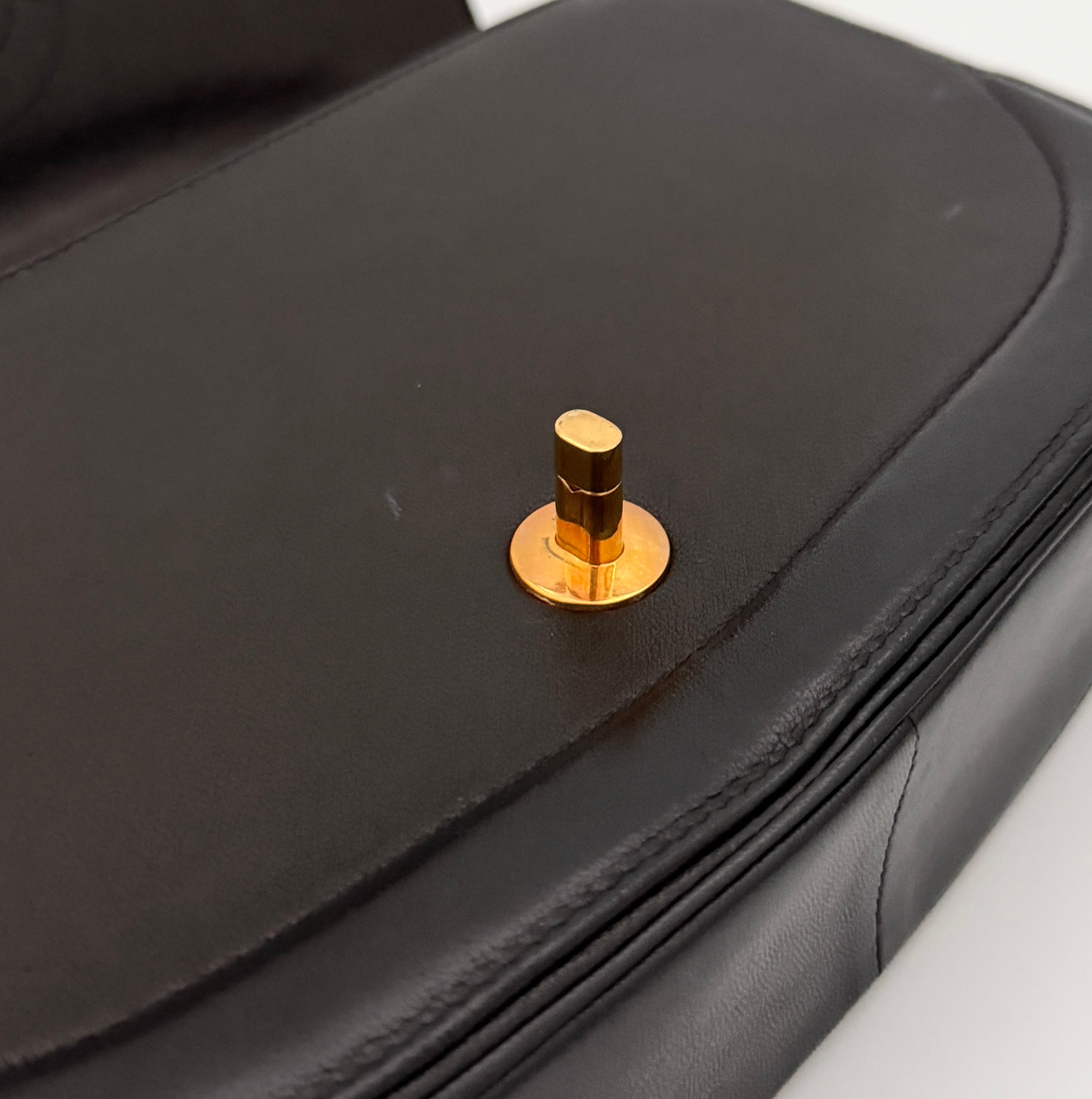 Bolso Chanel en cuero negro con detalles metálicos en dorado.
