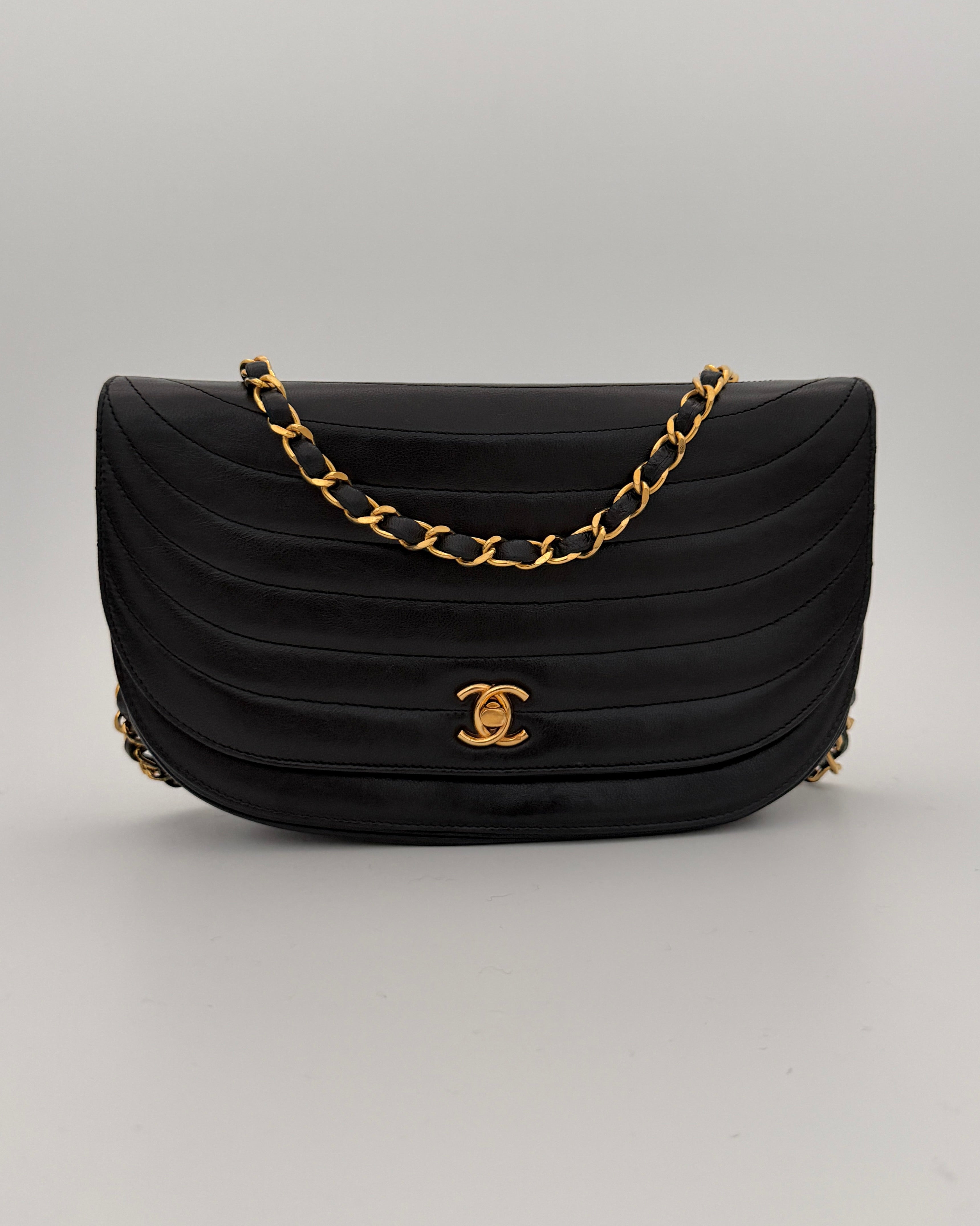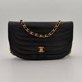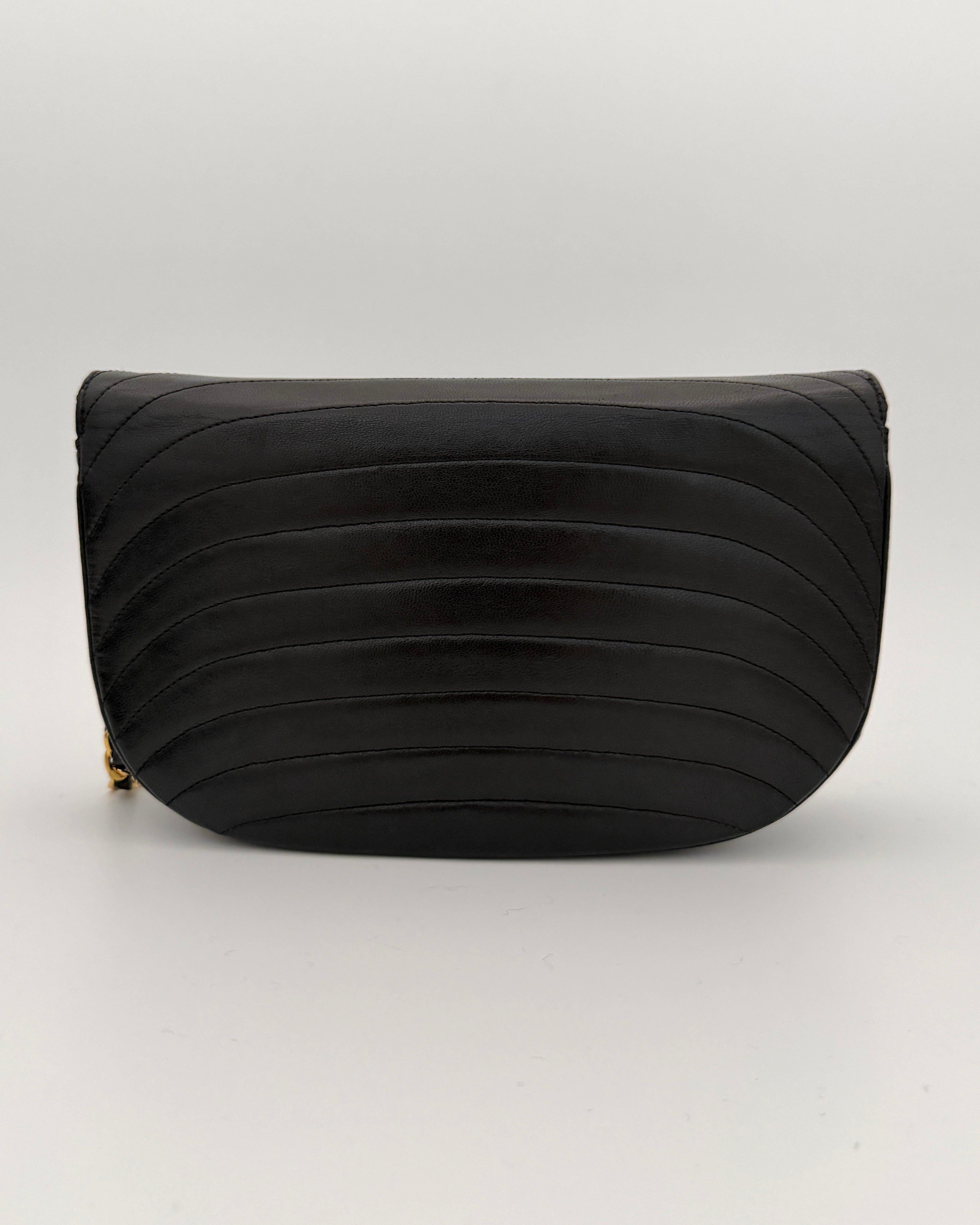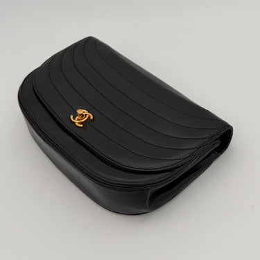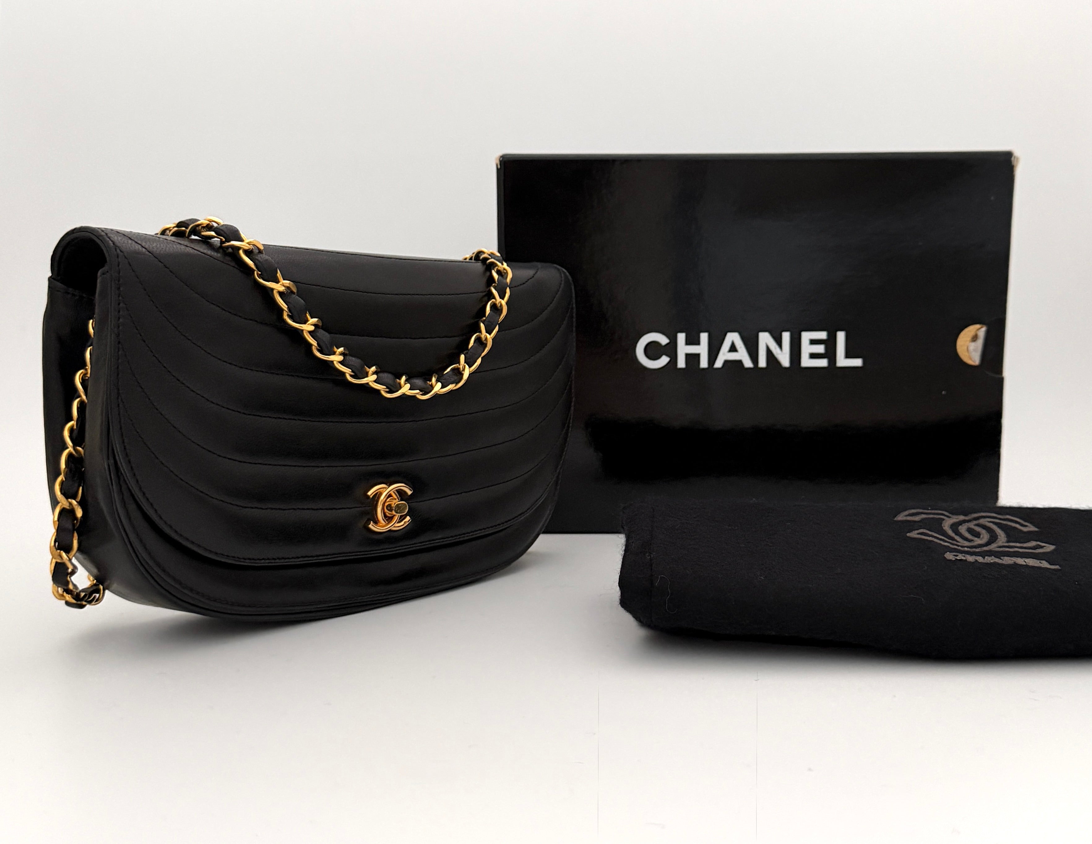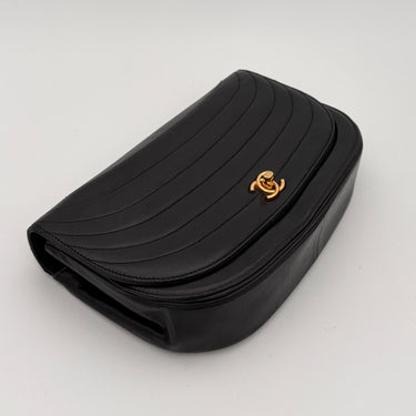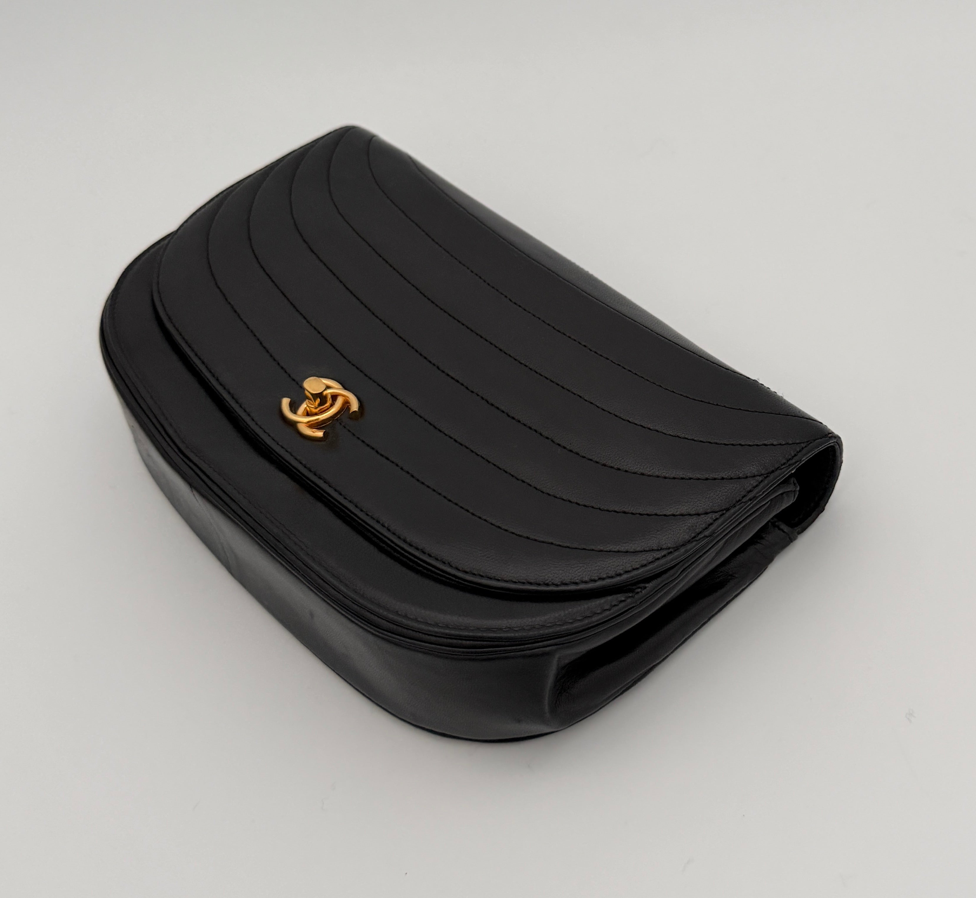 Bolso Chanel en cuero negro con detalles metálicos en dorado.