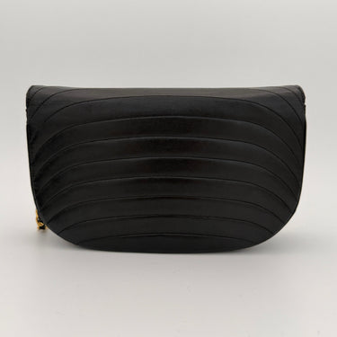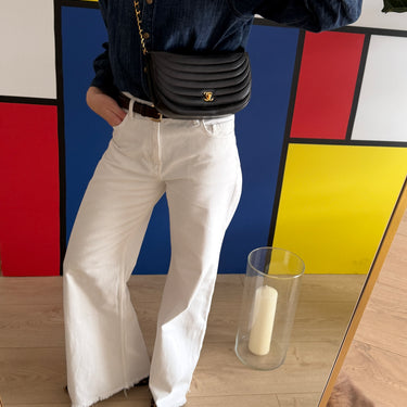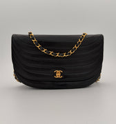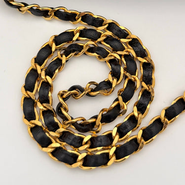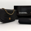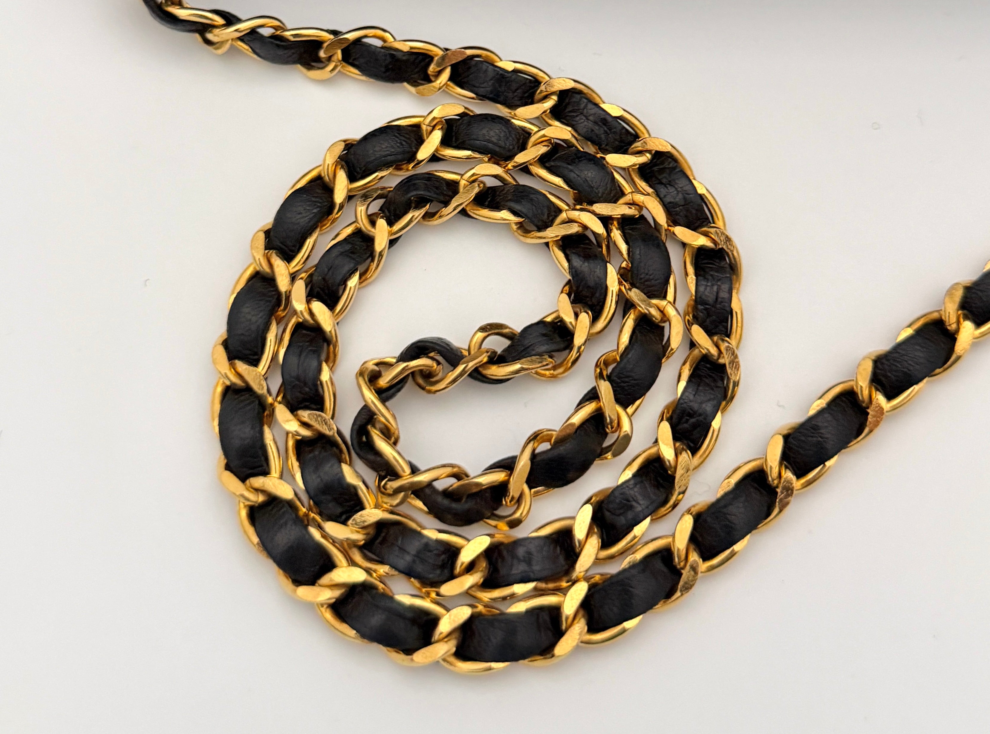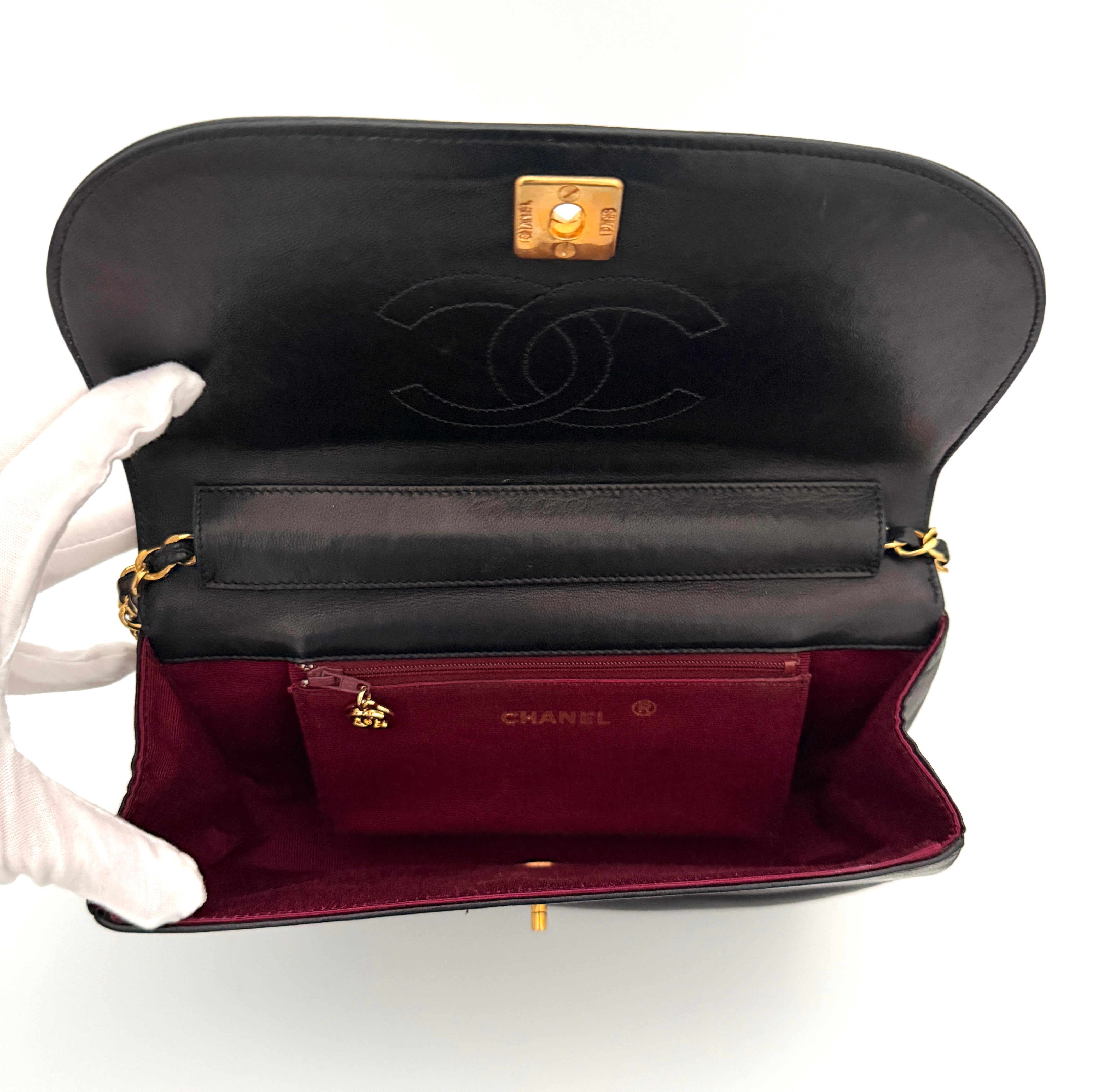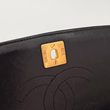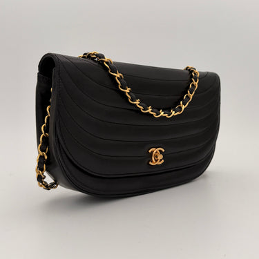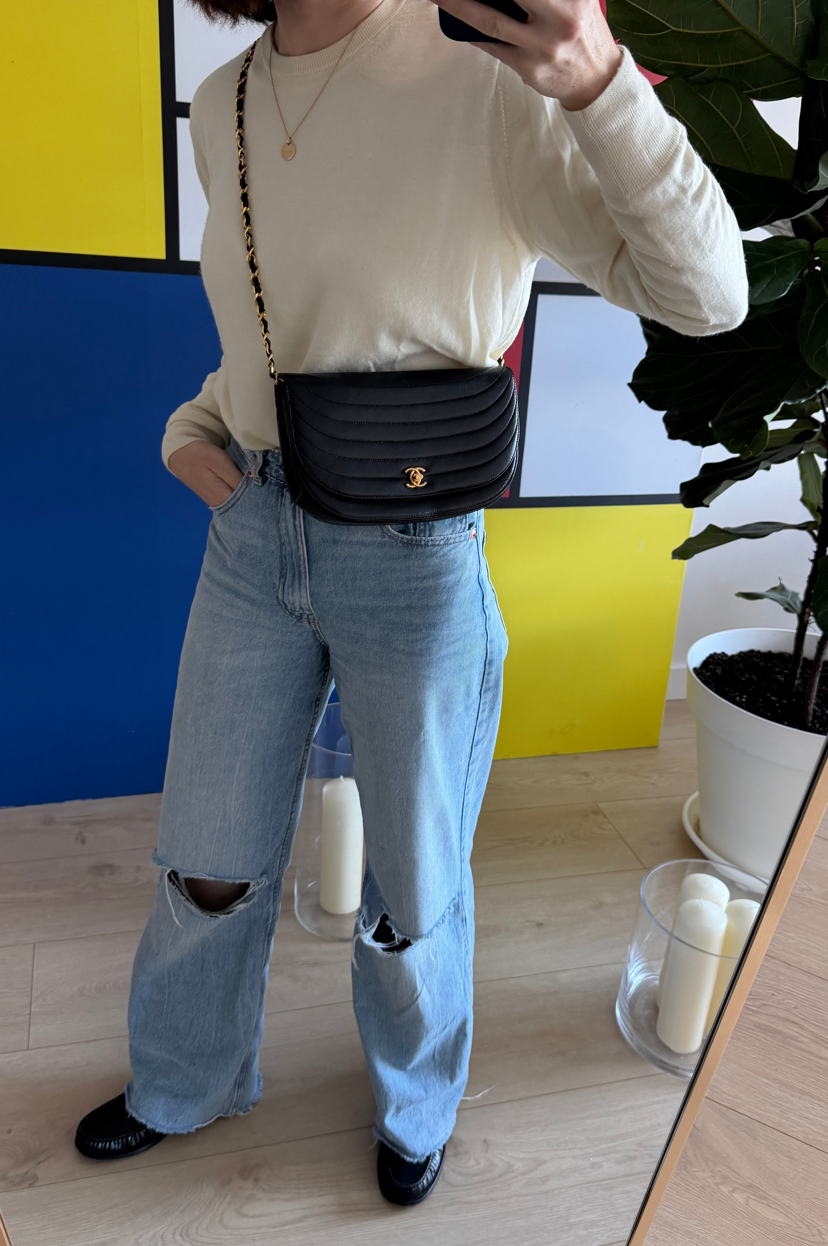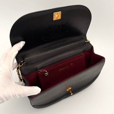 Bolso Chanel en cuero negro con detalles metálicos en dorado.