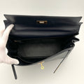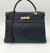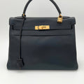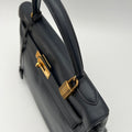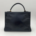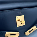 Hermès Kelly 32 en cuero color marino y partes metálicas en dorado.