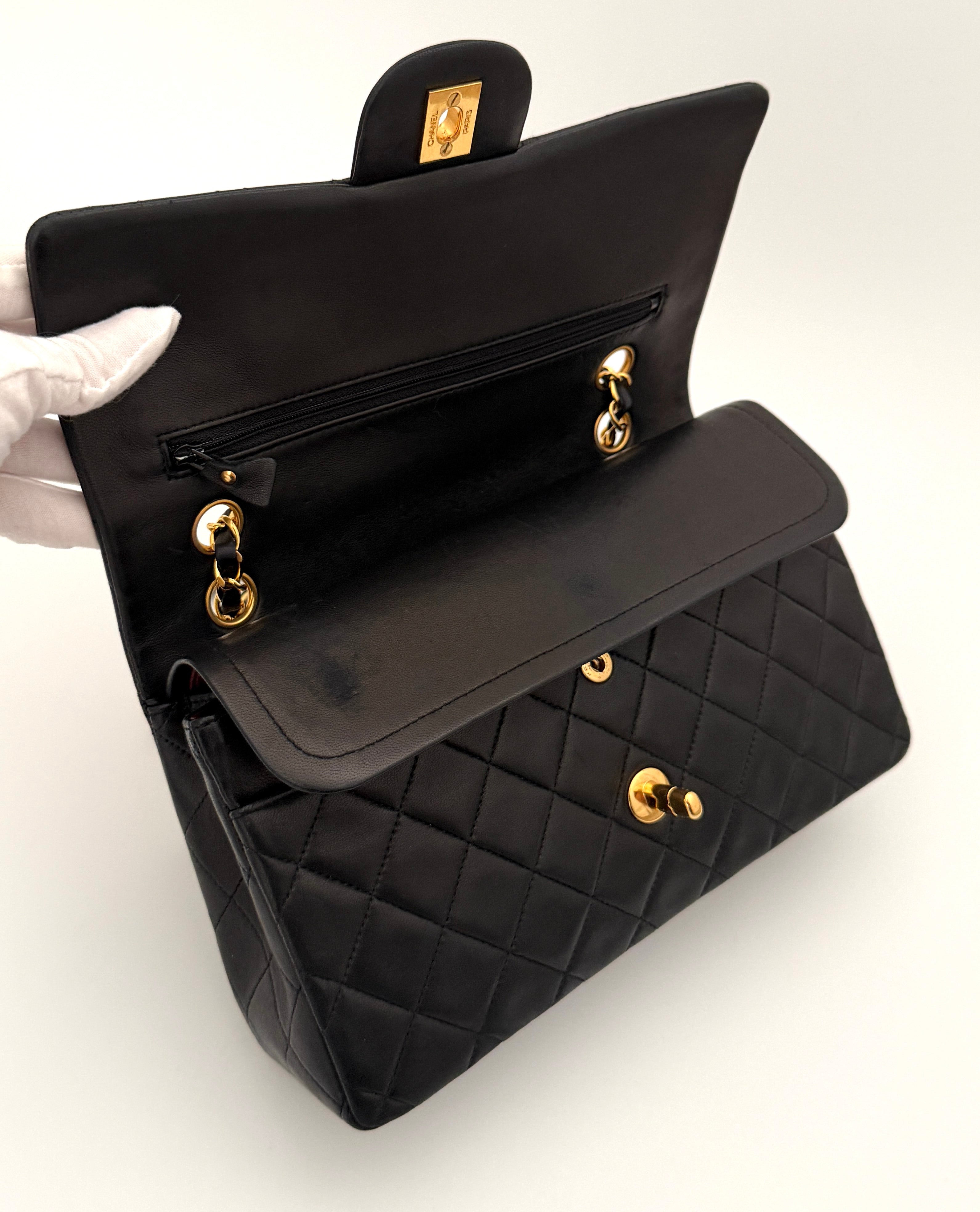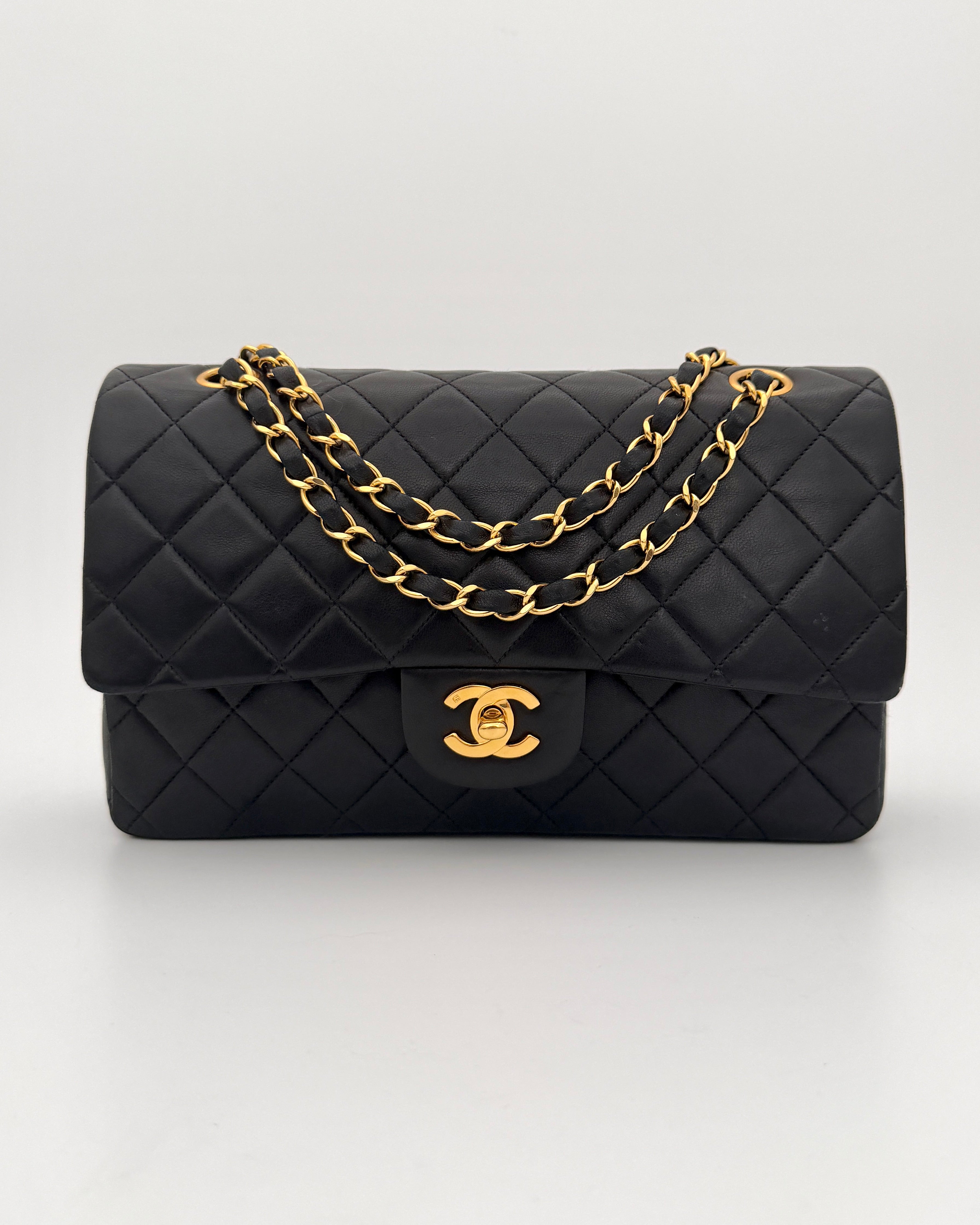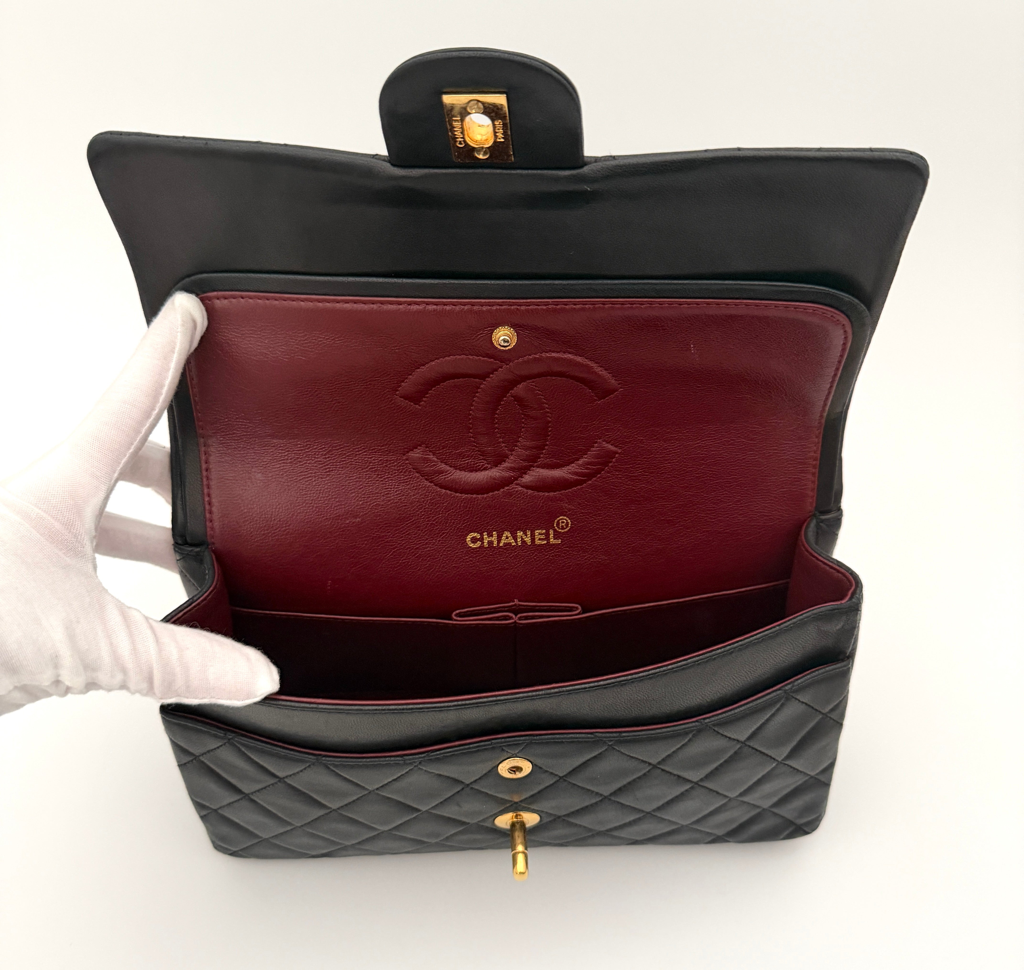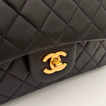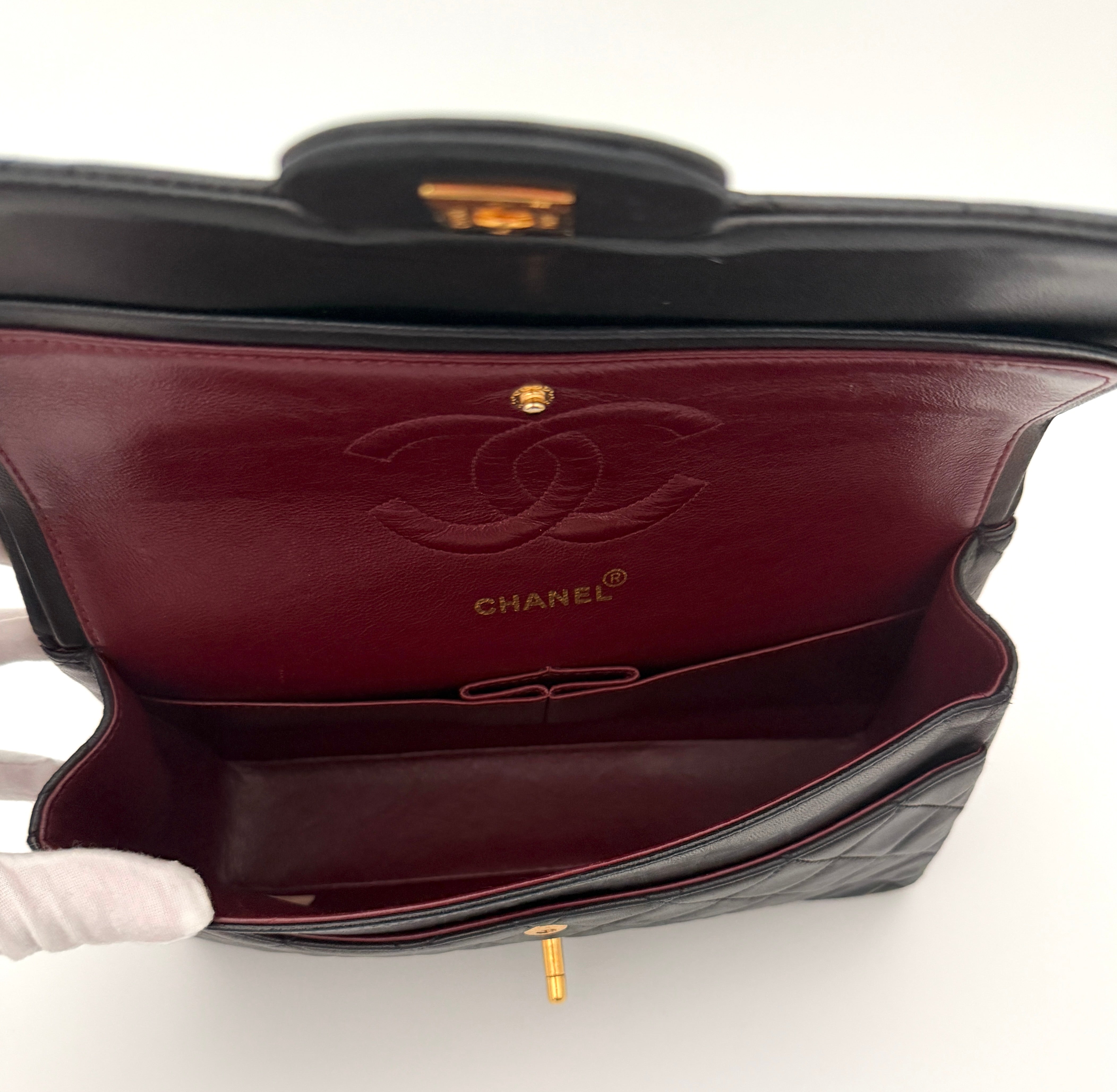 Bolso Chanel Timeless 25 de doble solapa en cuero negro con detalles metálicos en dorado.