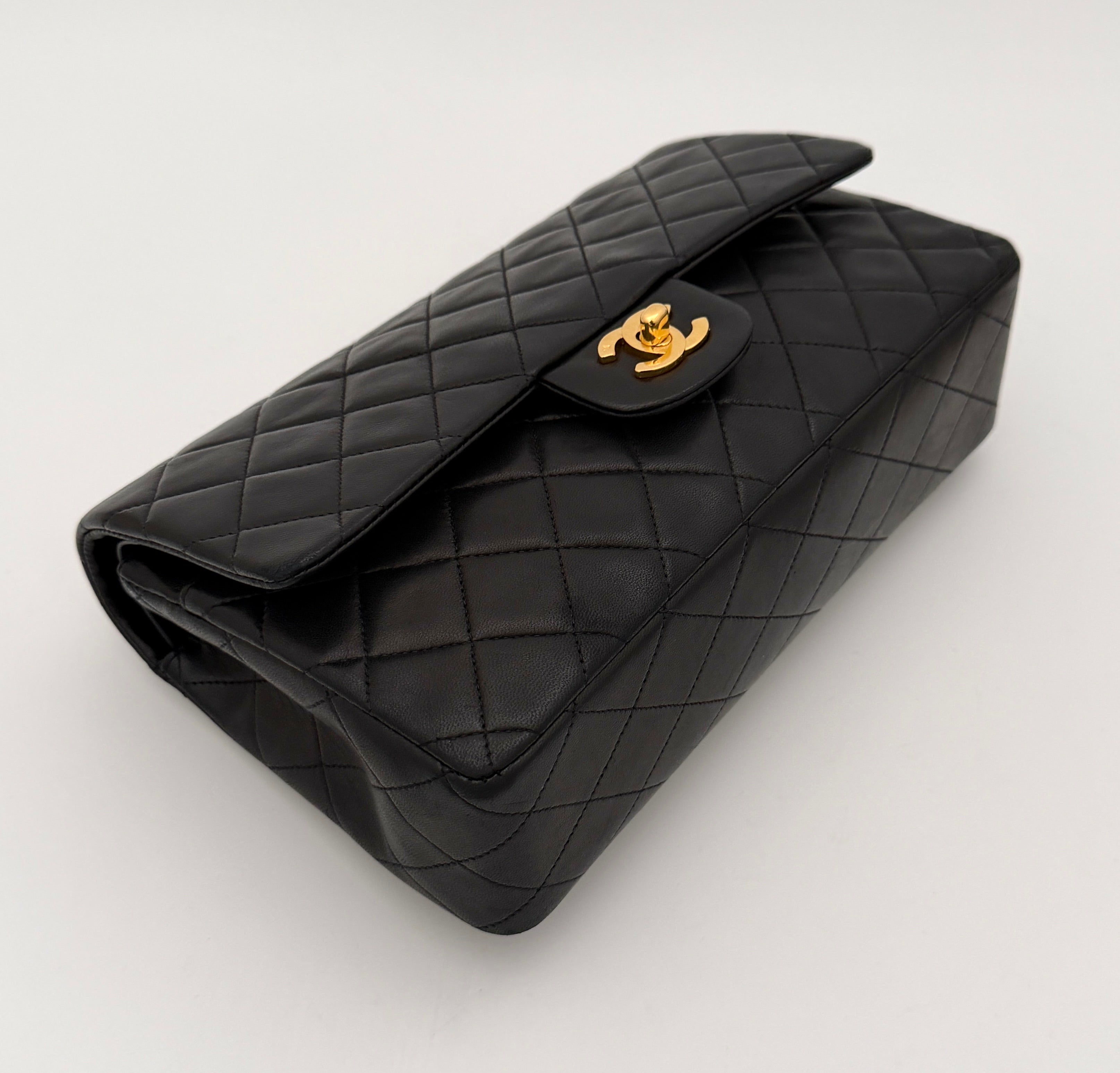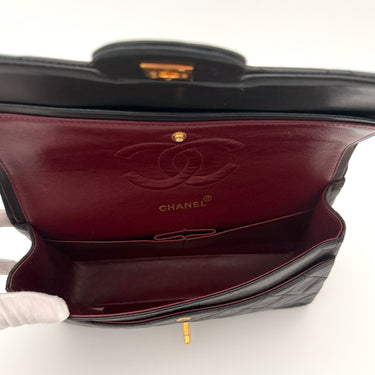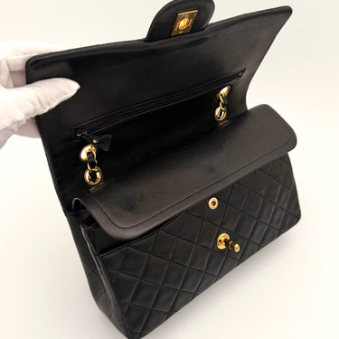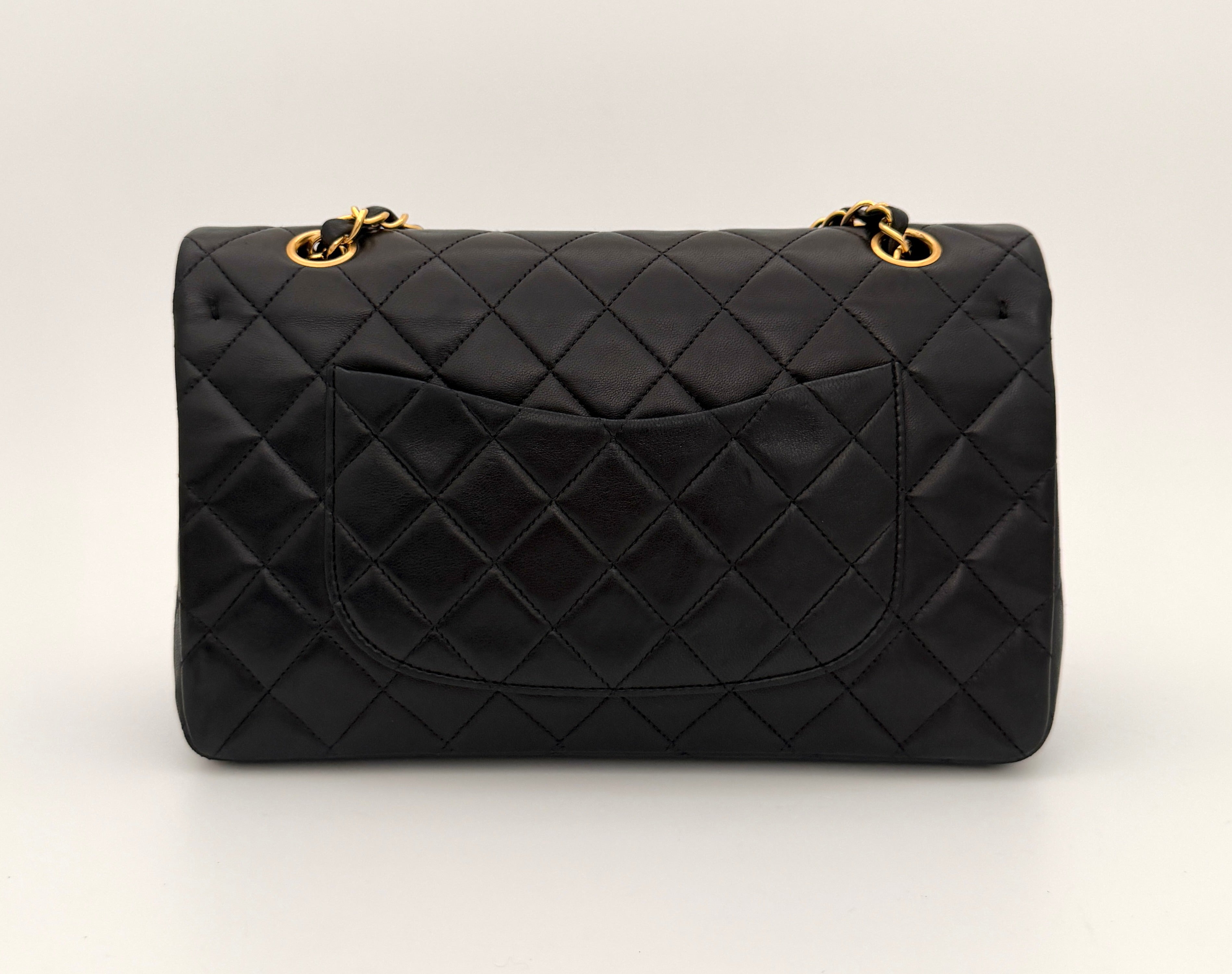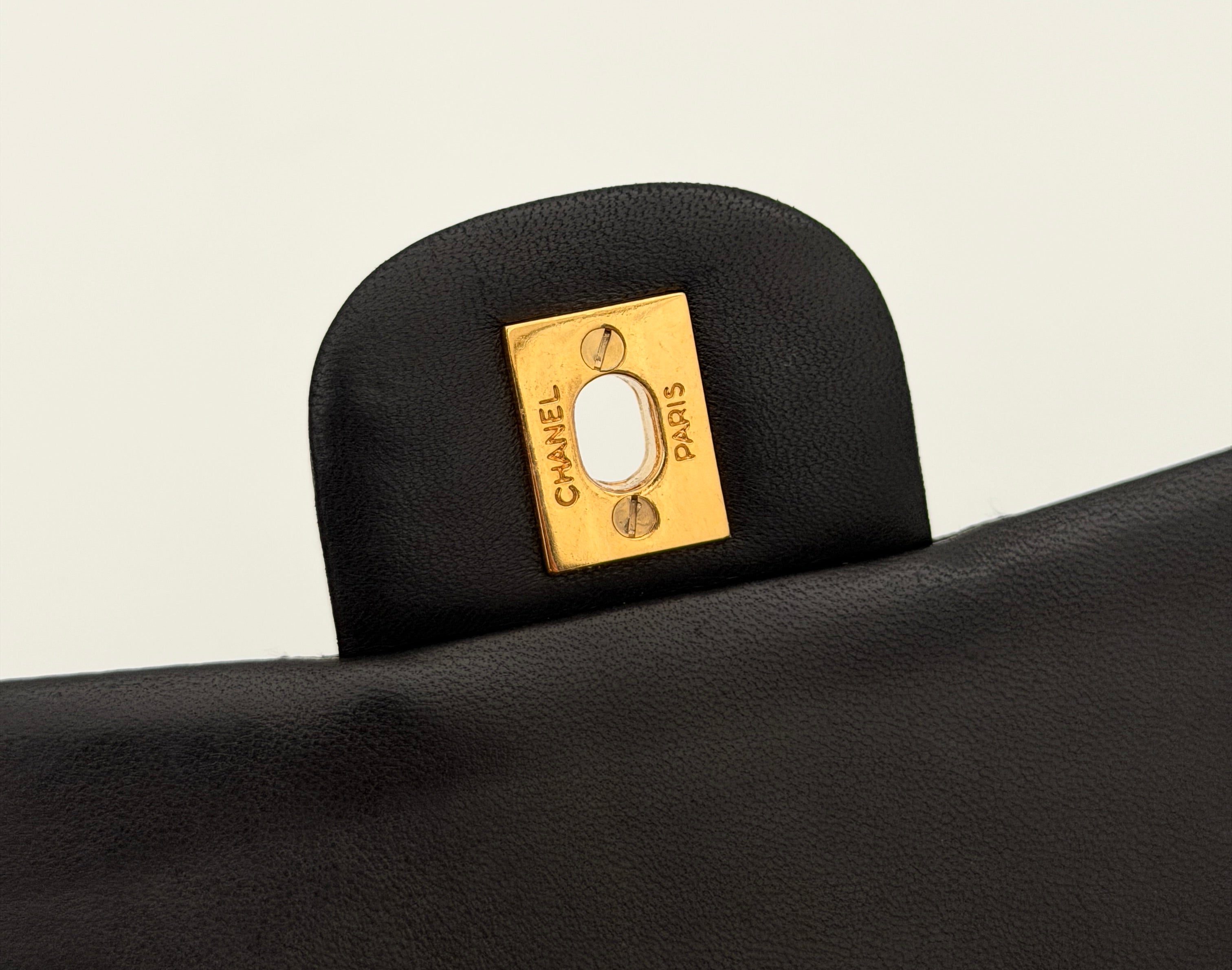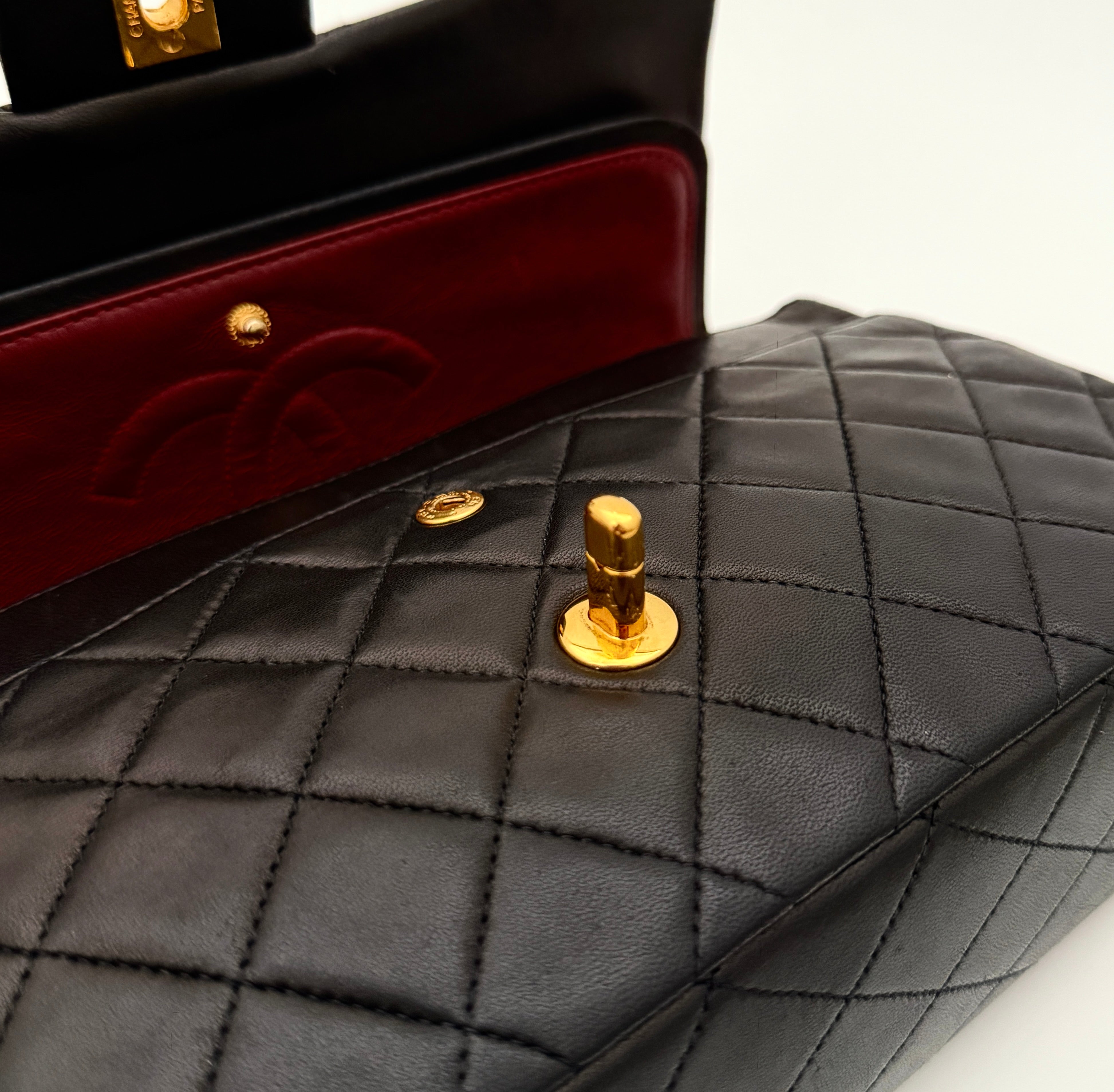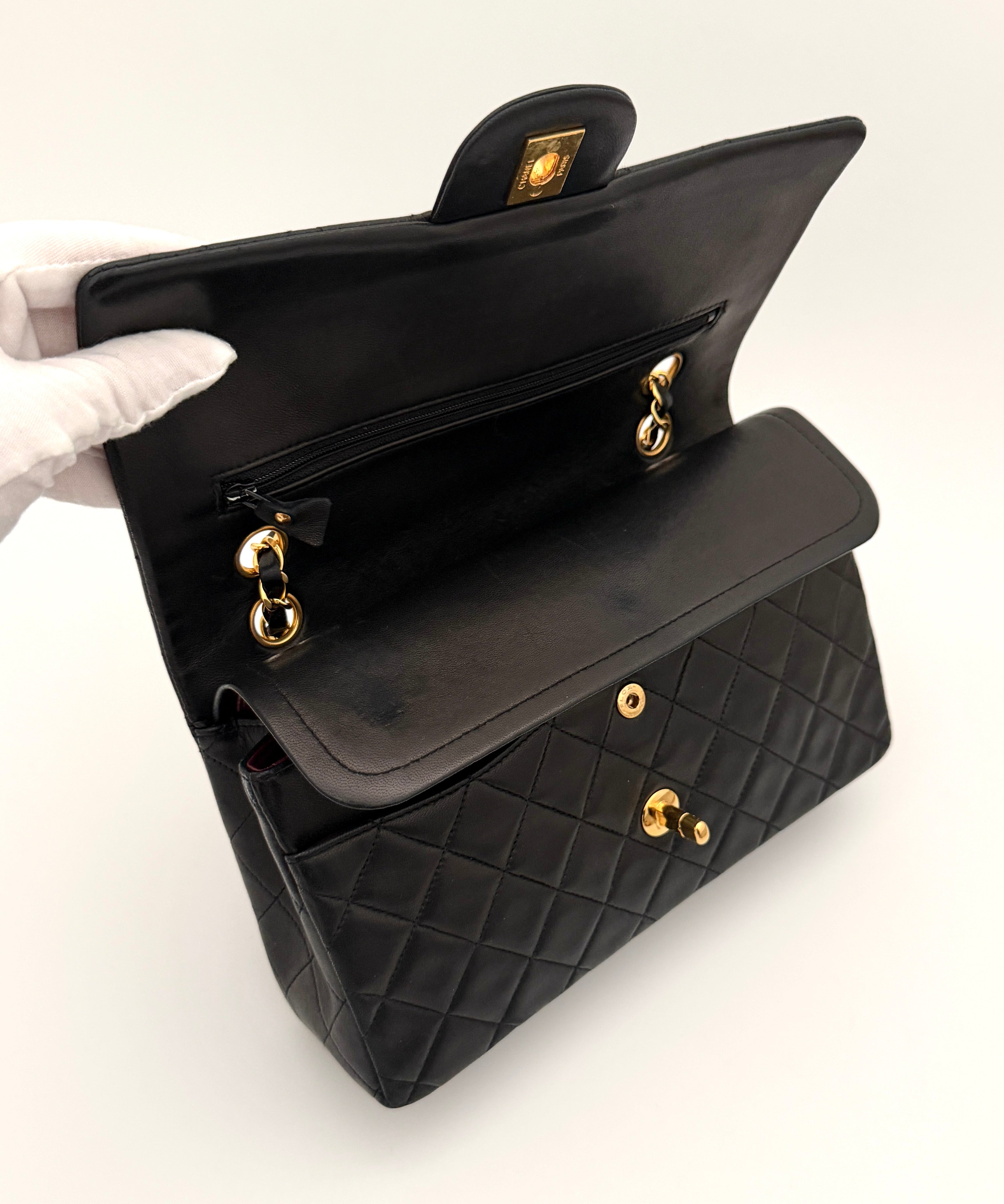 Bolso Chanel Timeless 25 de doble solapa en cuero negro con detalles metálicos en dorado.