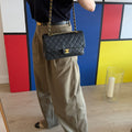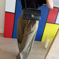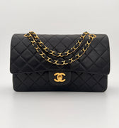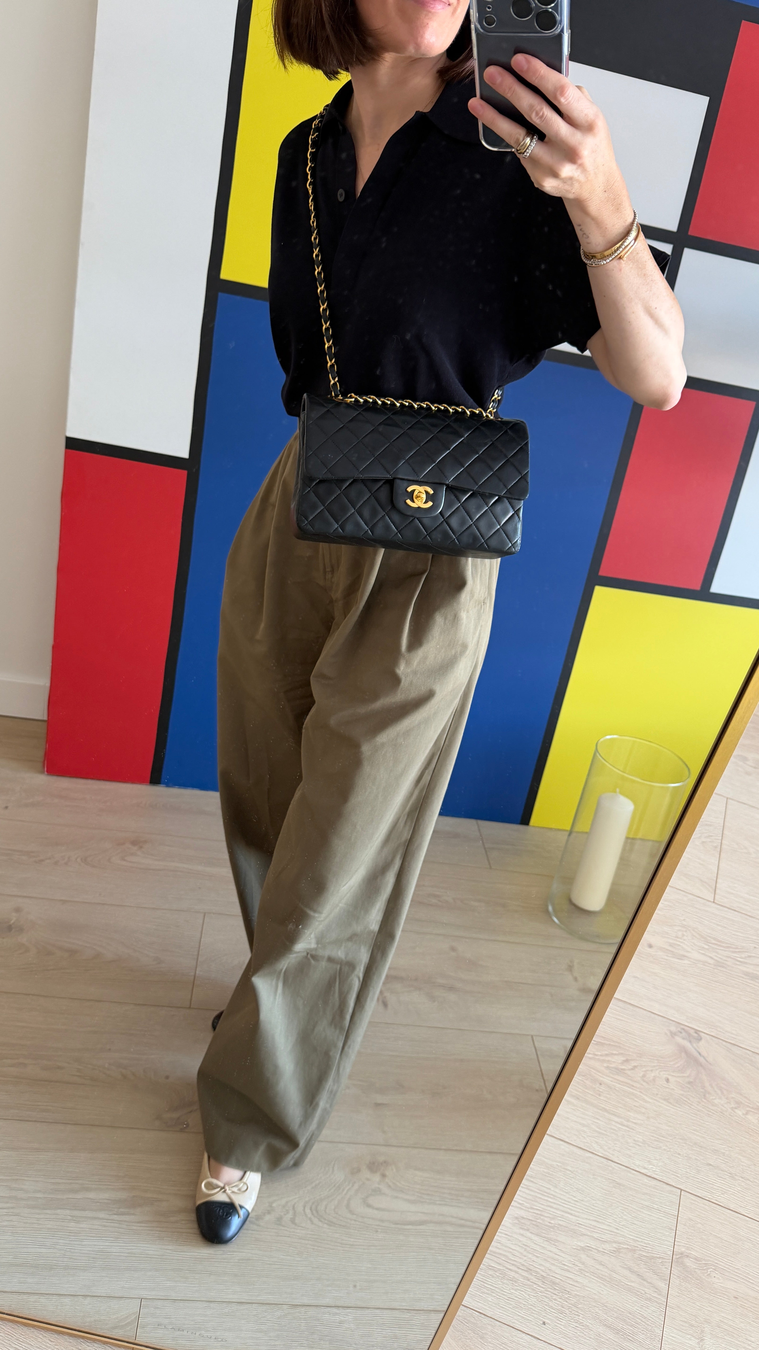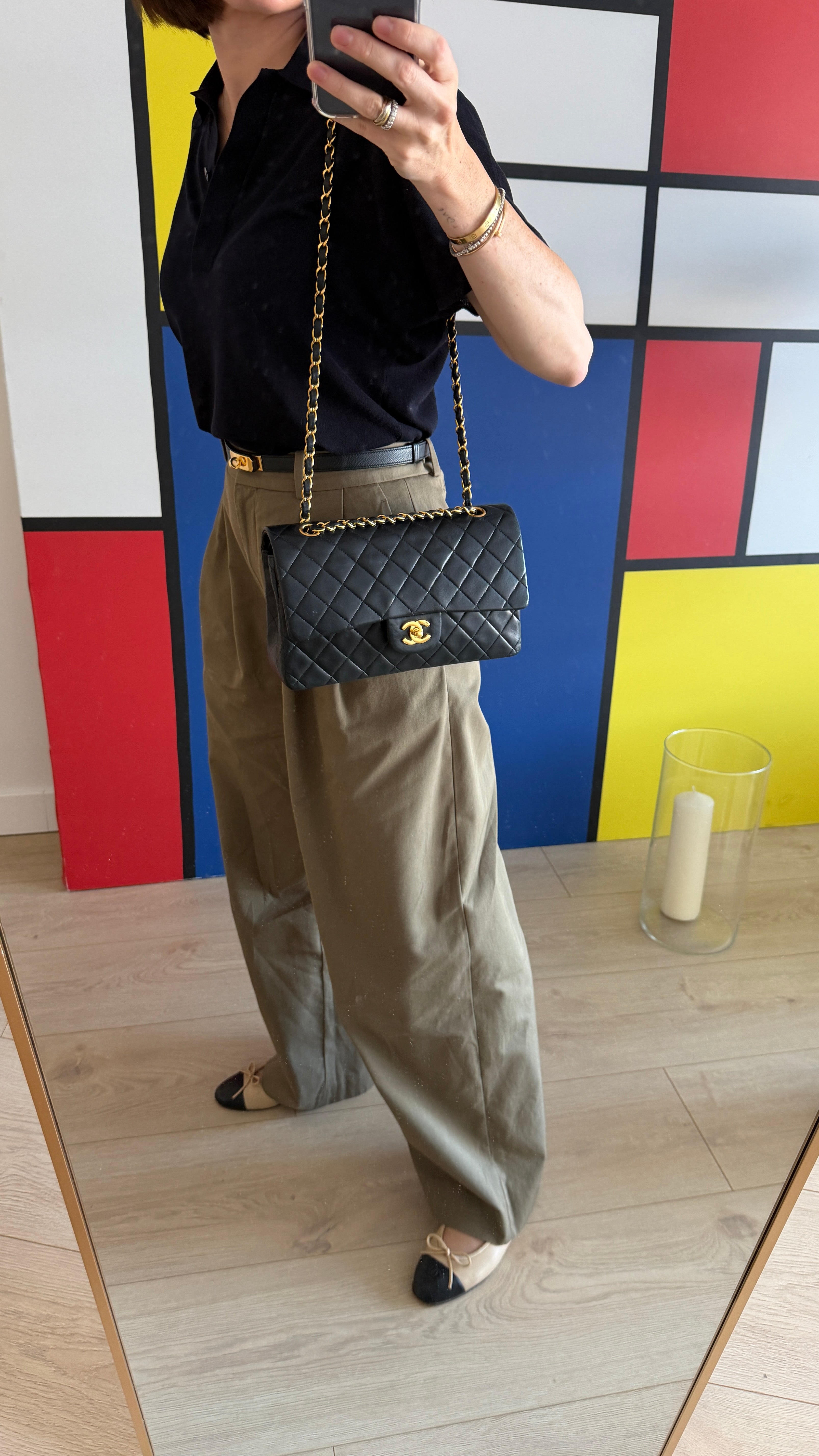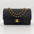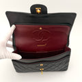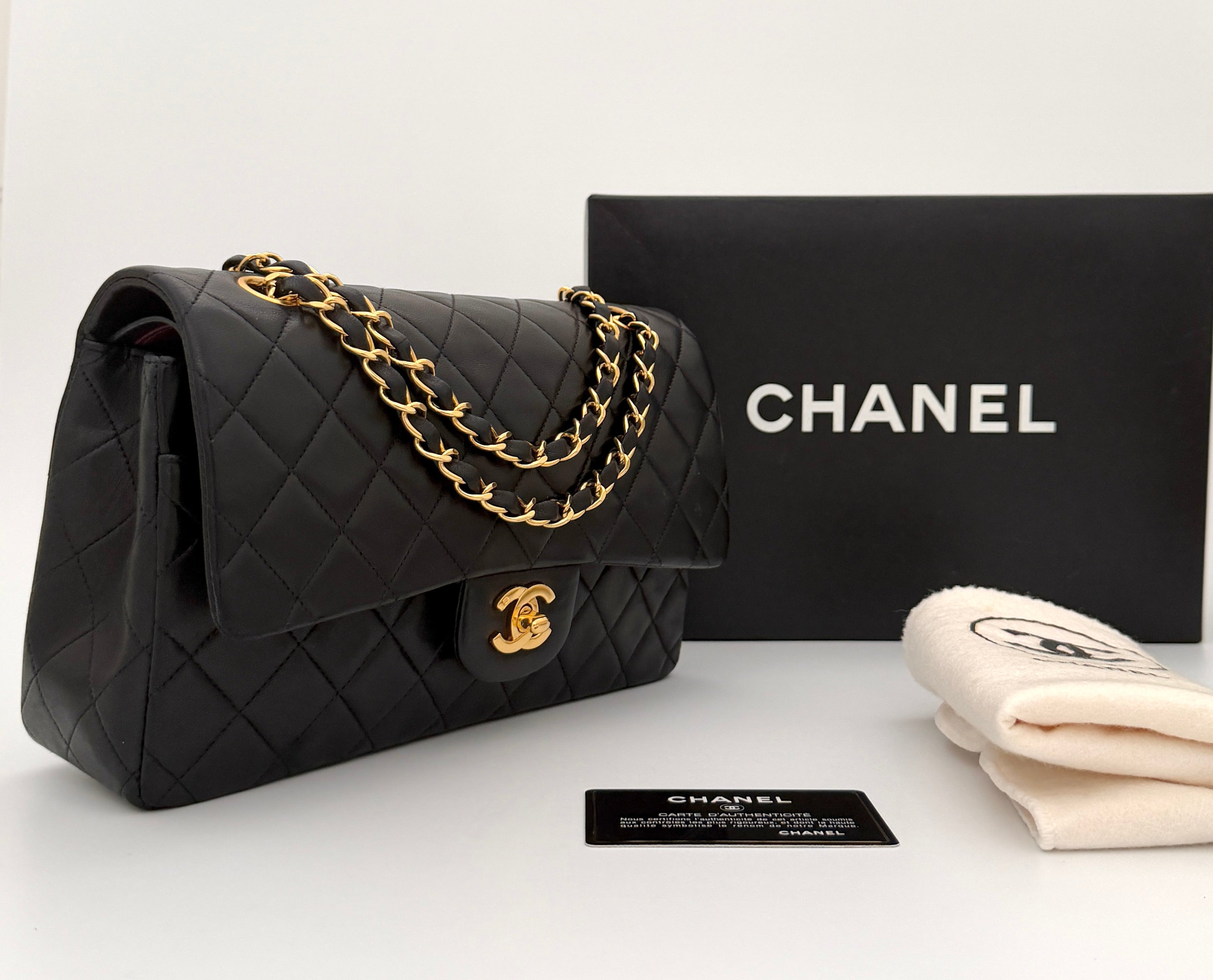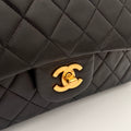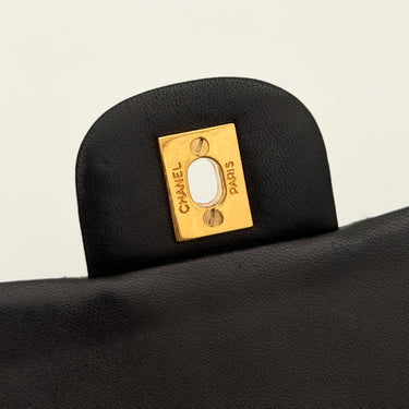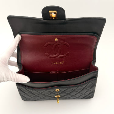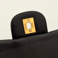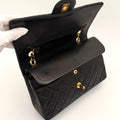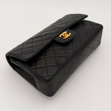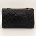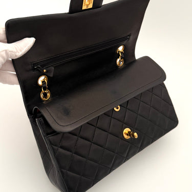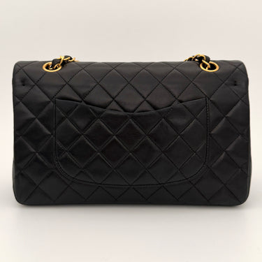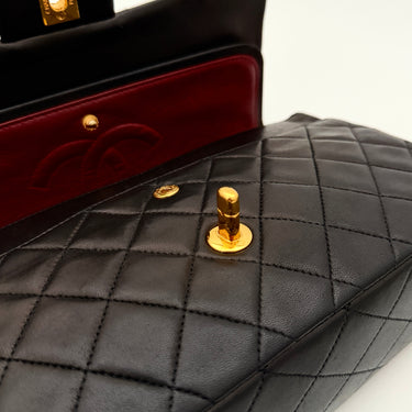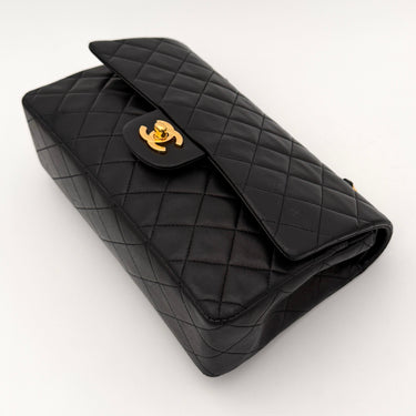 Bolso Chanel Timeless 25 de doble solapa en cuero negro con detalles metálicos en dorado.