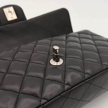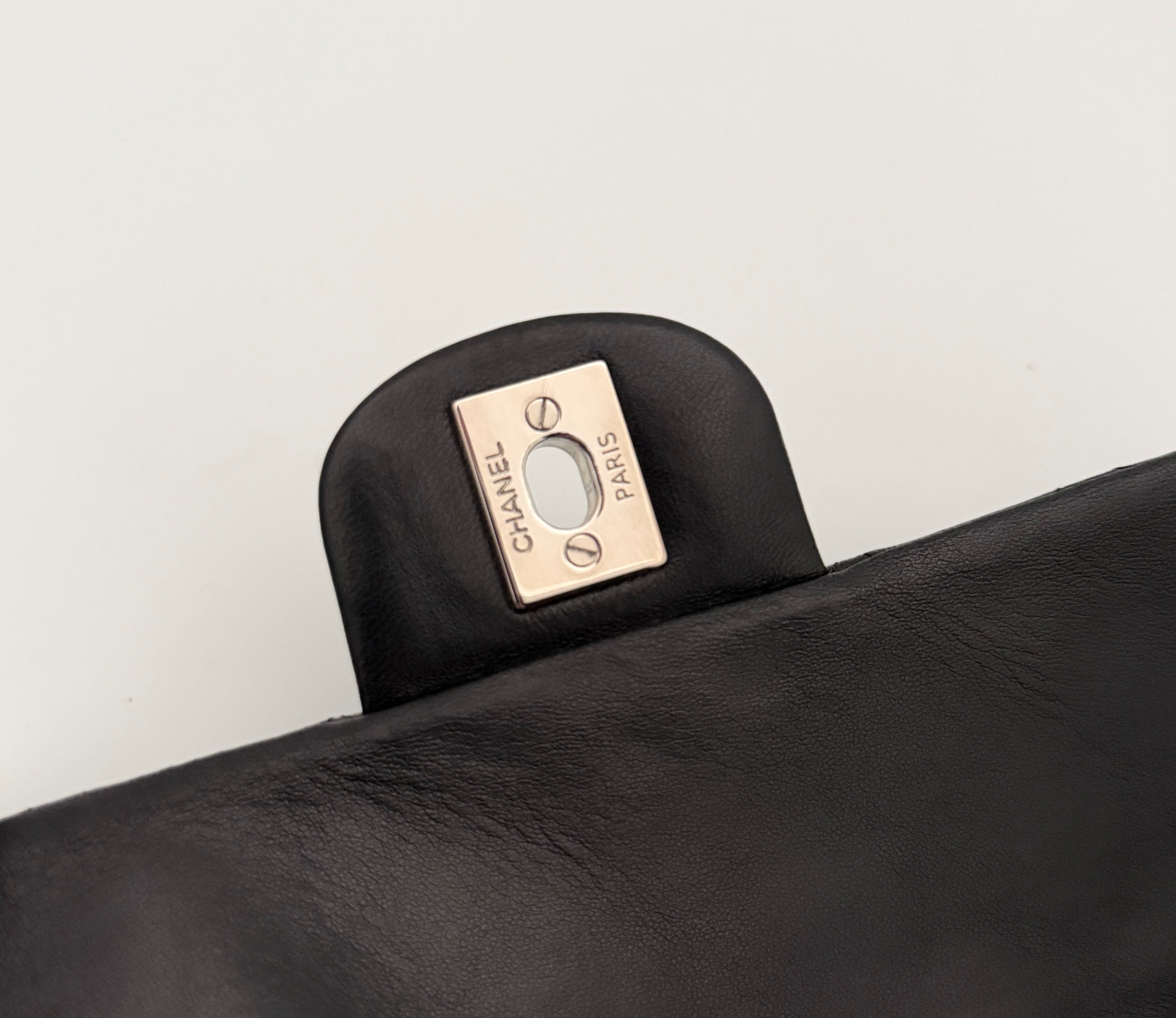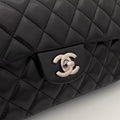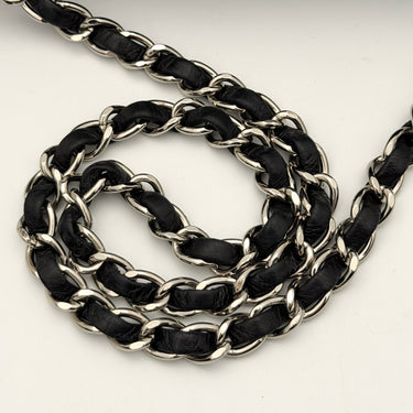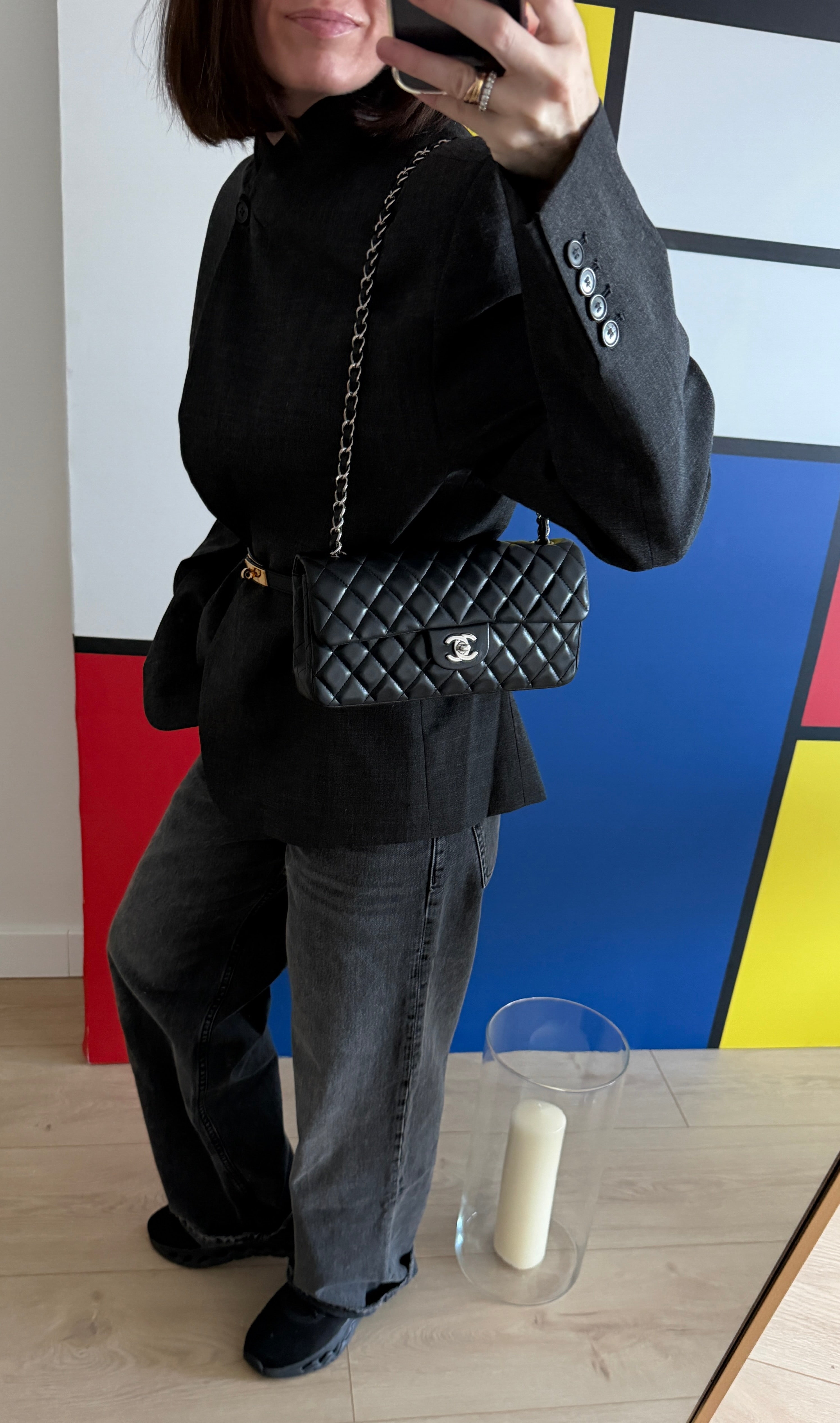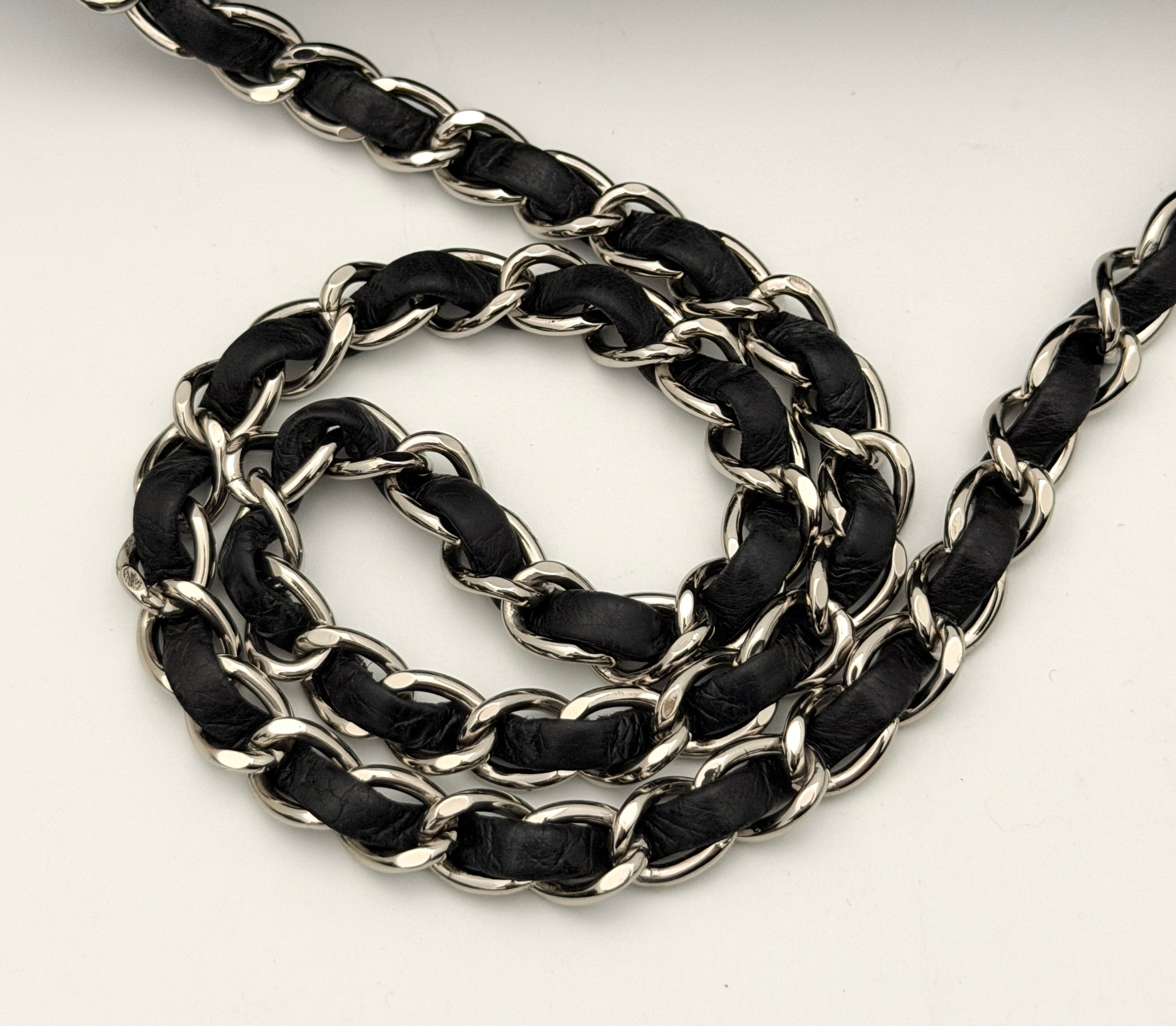 Bolso Chanel en cuero negro con detalles metálicos en plateado.