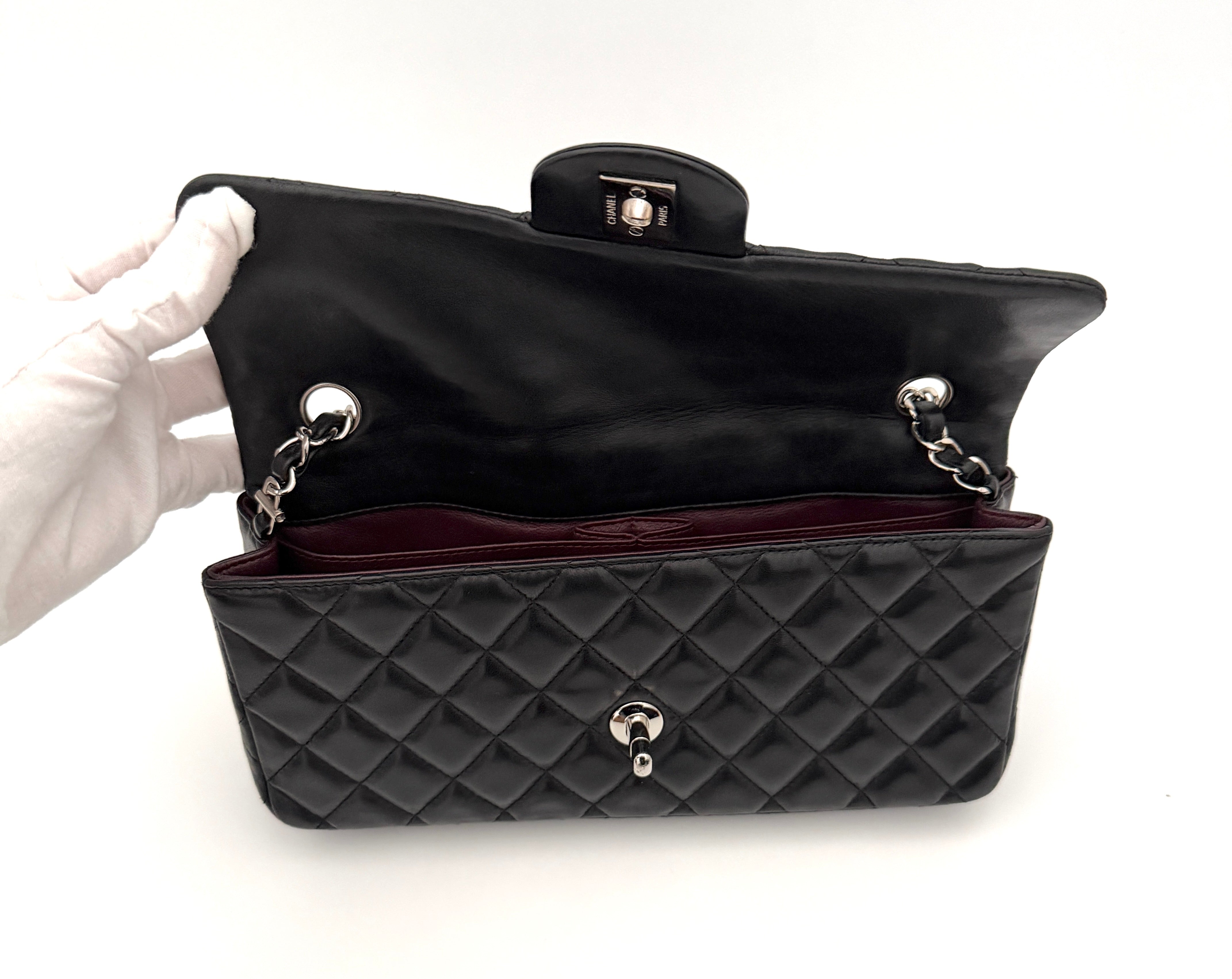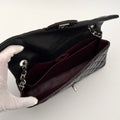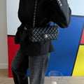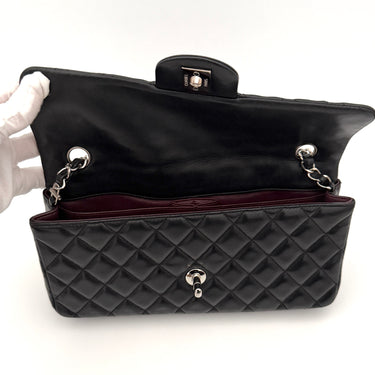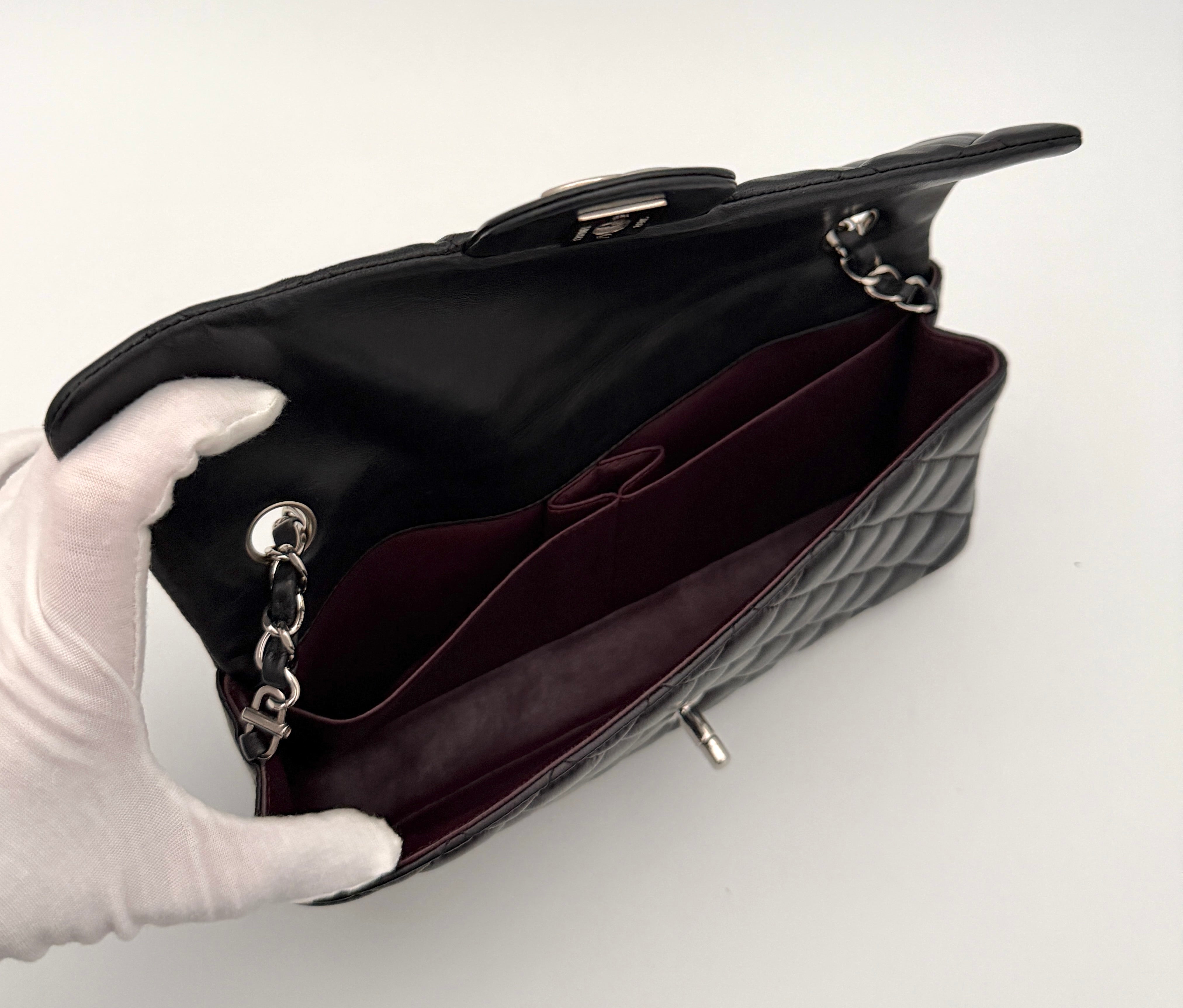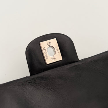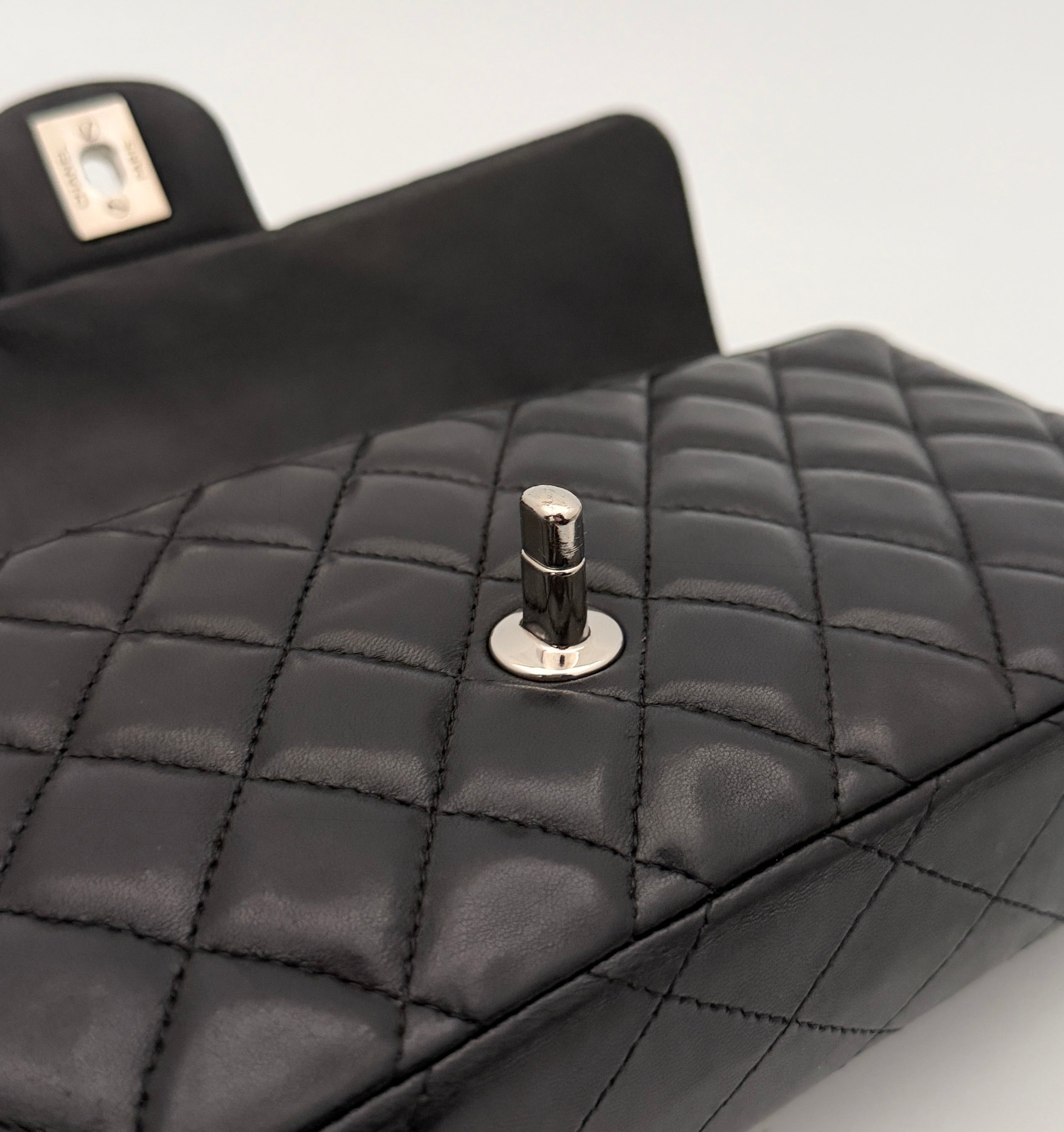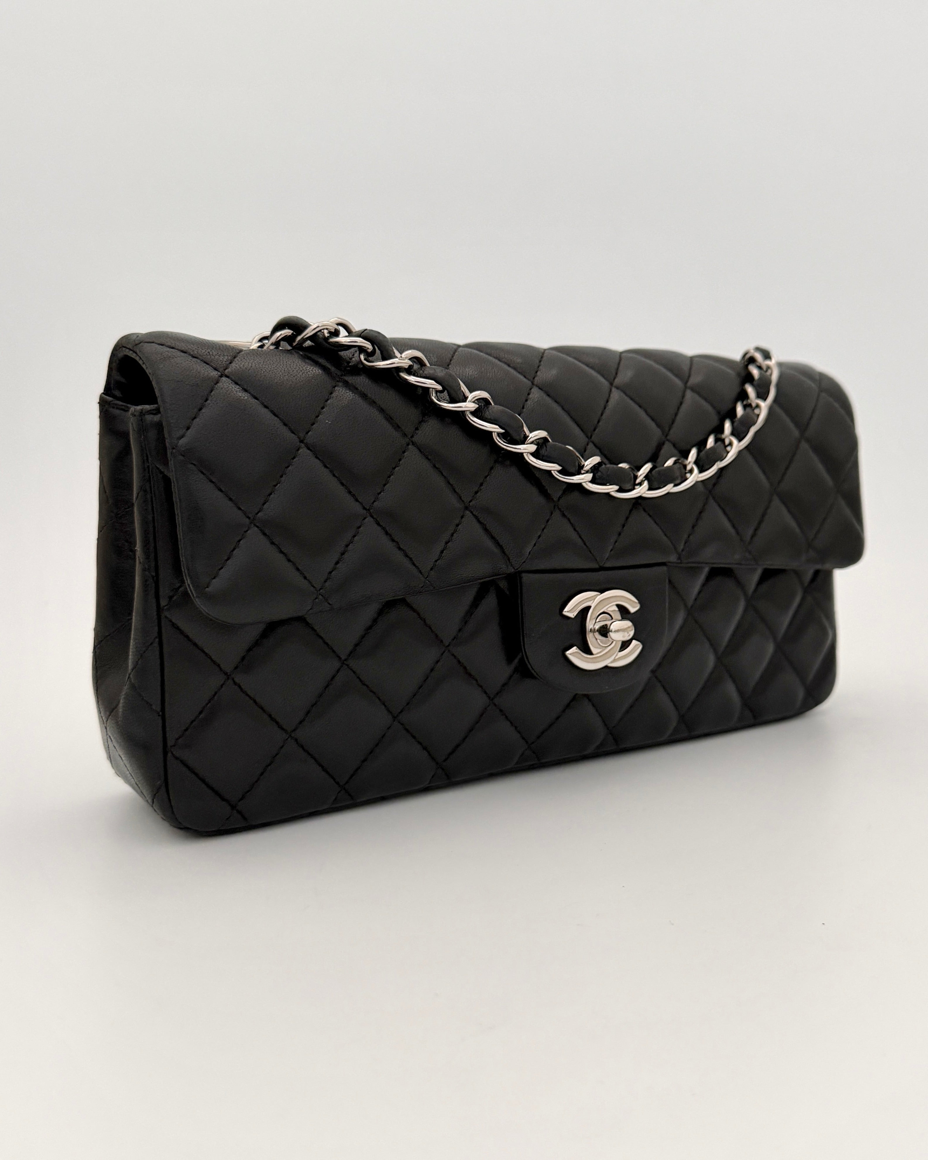 Bolso Chanel en cuero negro con detalles metálicos en plateado.