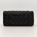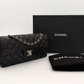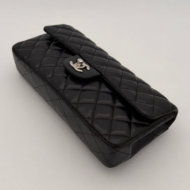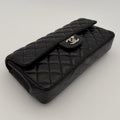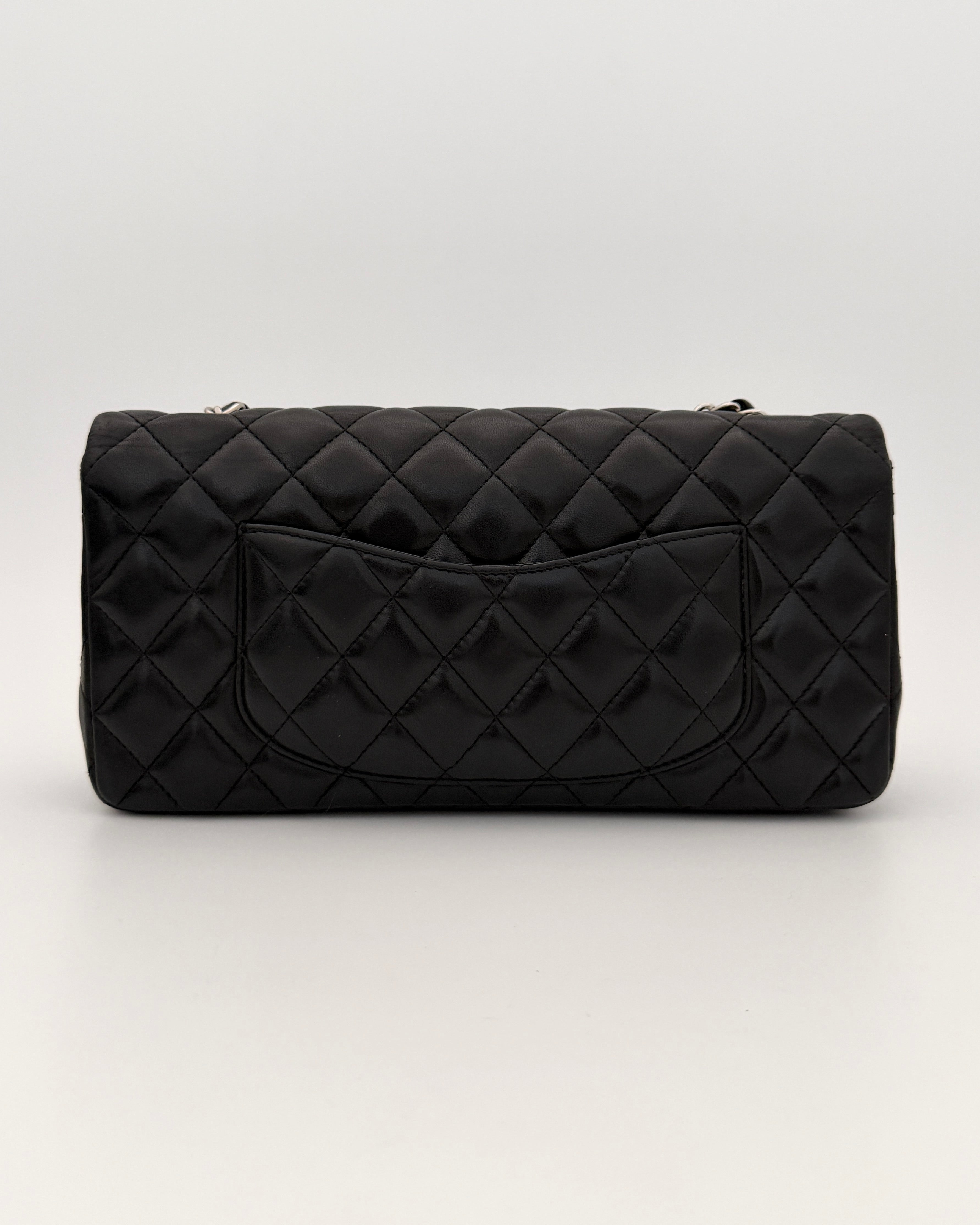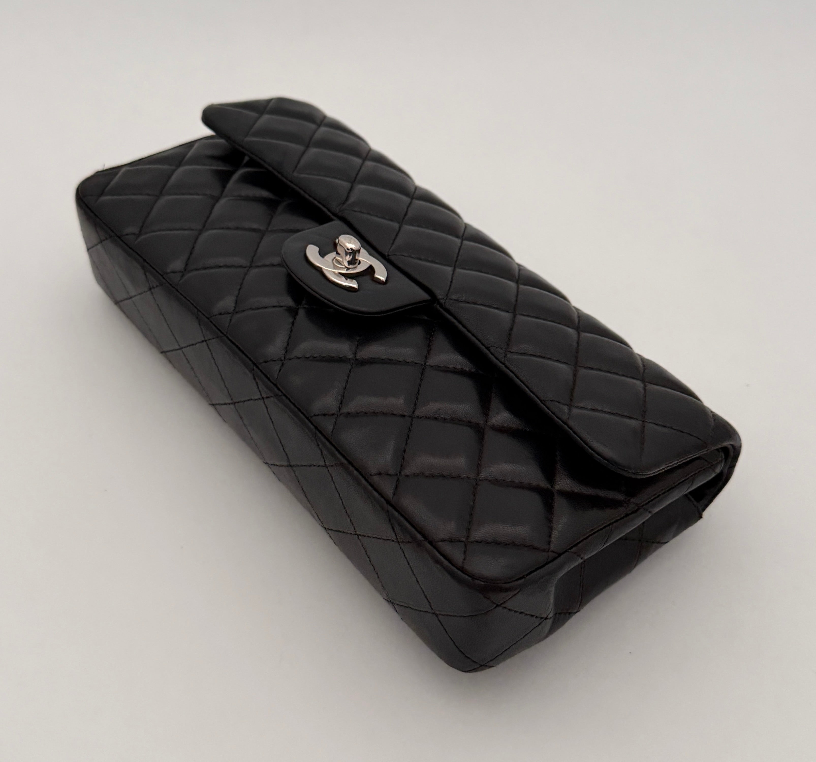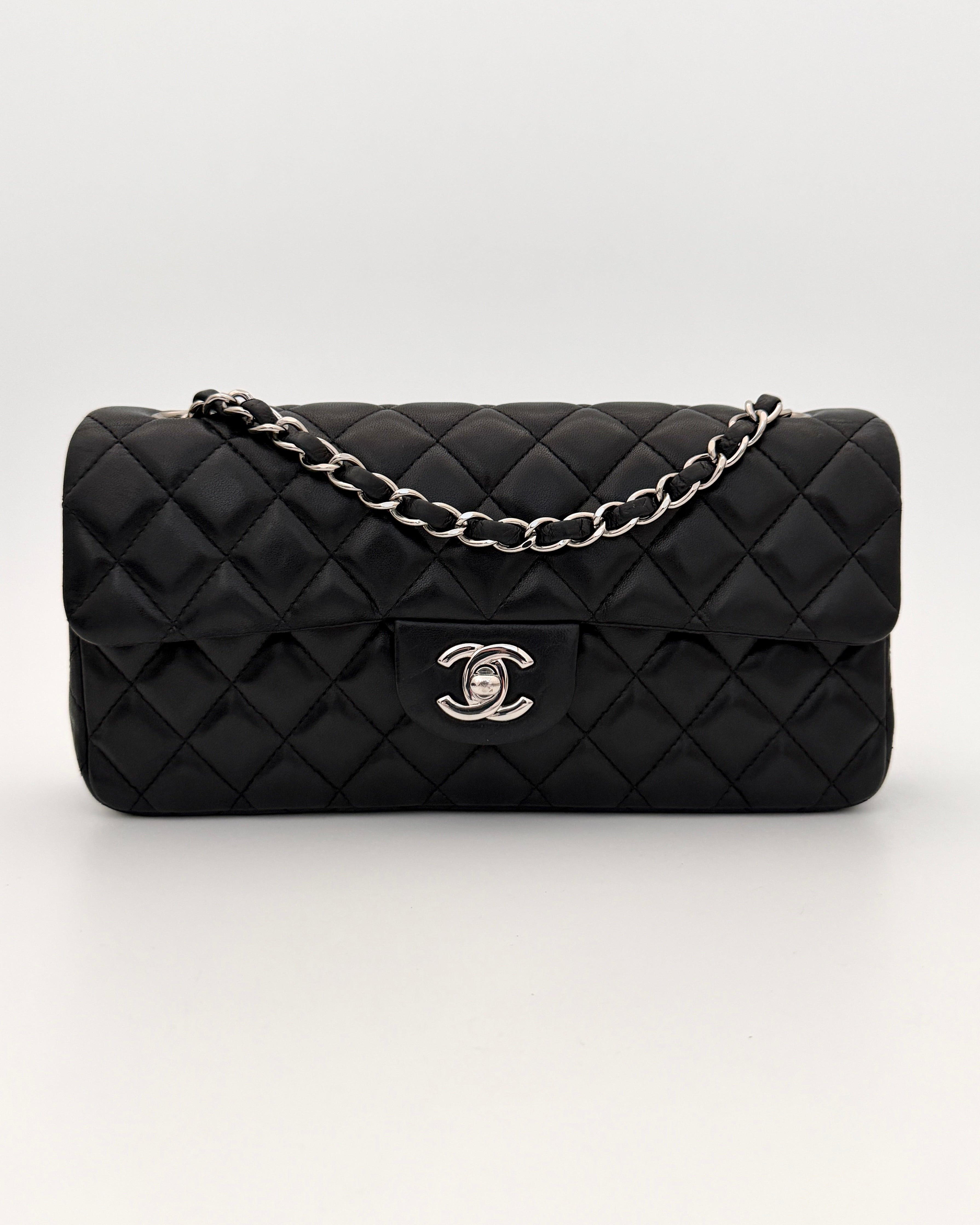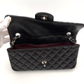 Bolso Chanel en cuero negro con detalles metálicos en plateado.