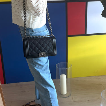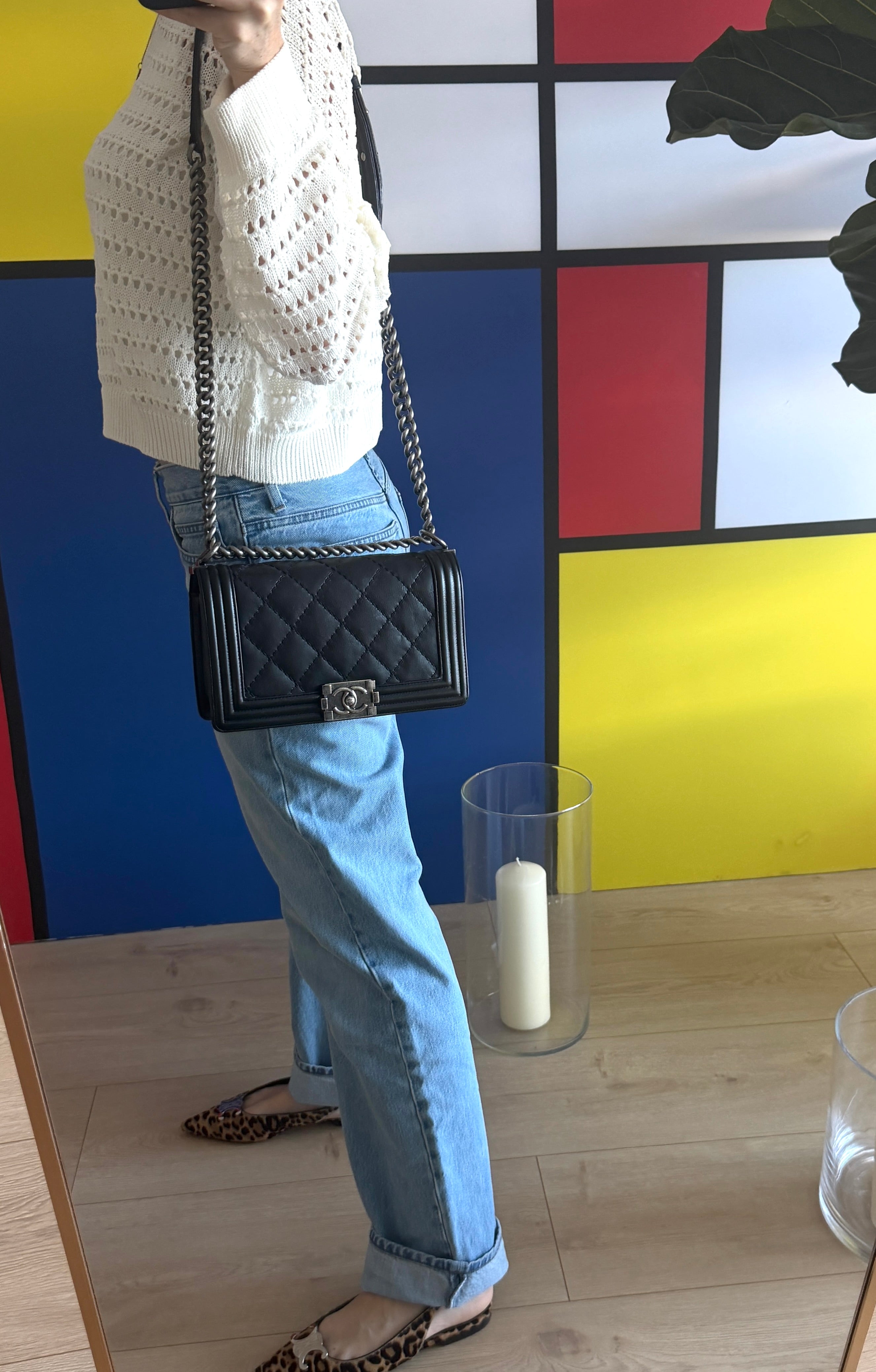 Bolso Chanel Boy mediano en cuero negro con detalles en plata con efecto envejecido.