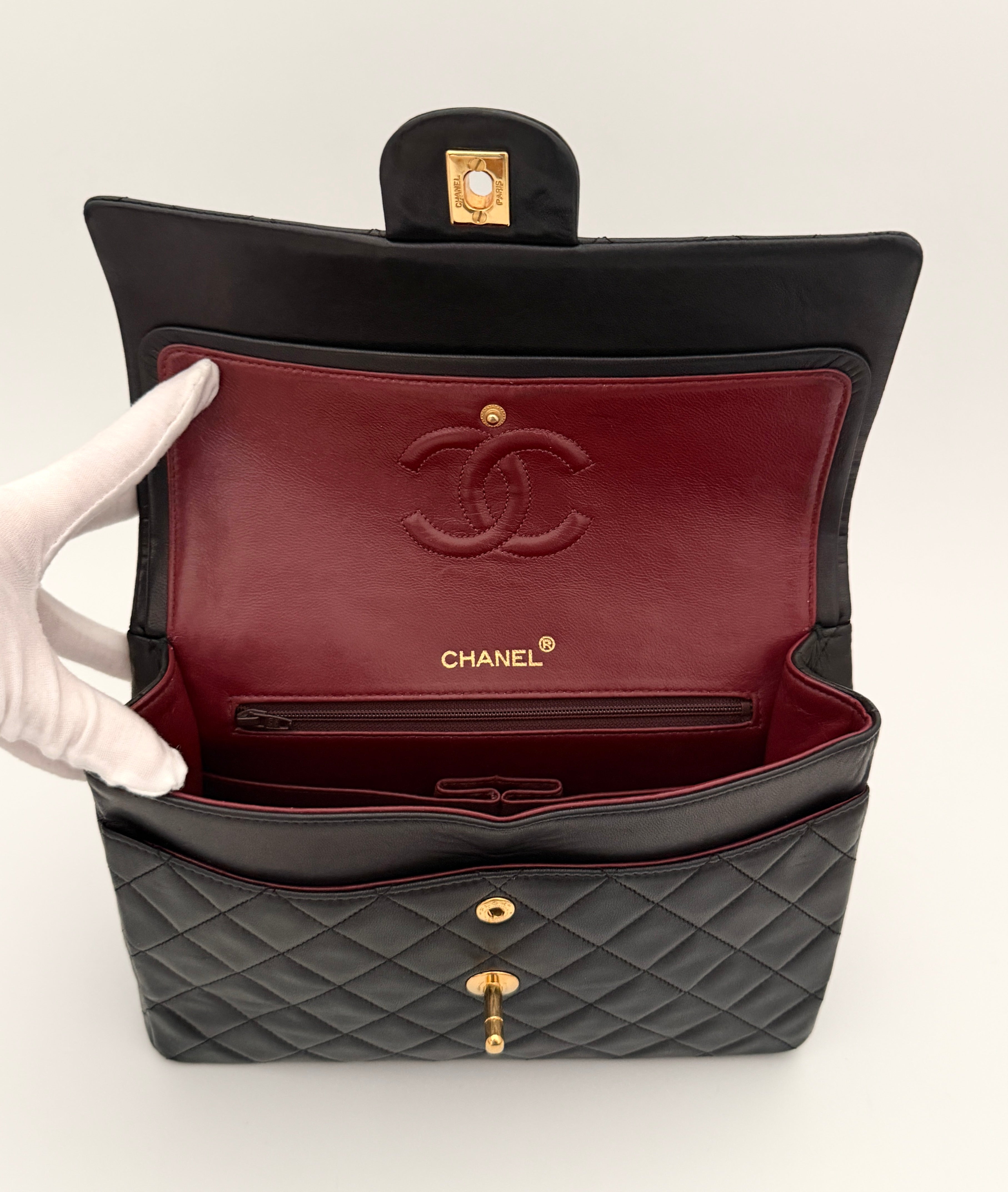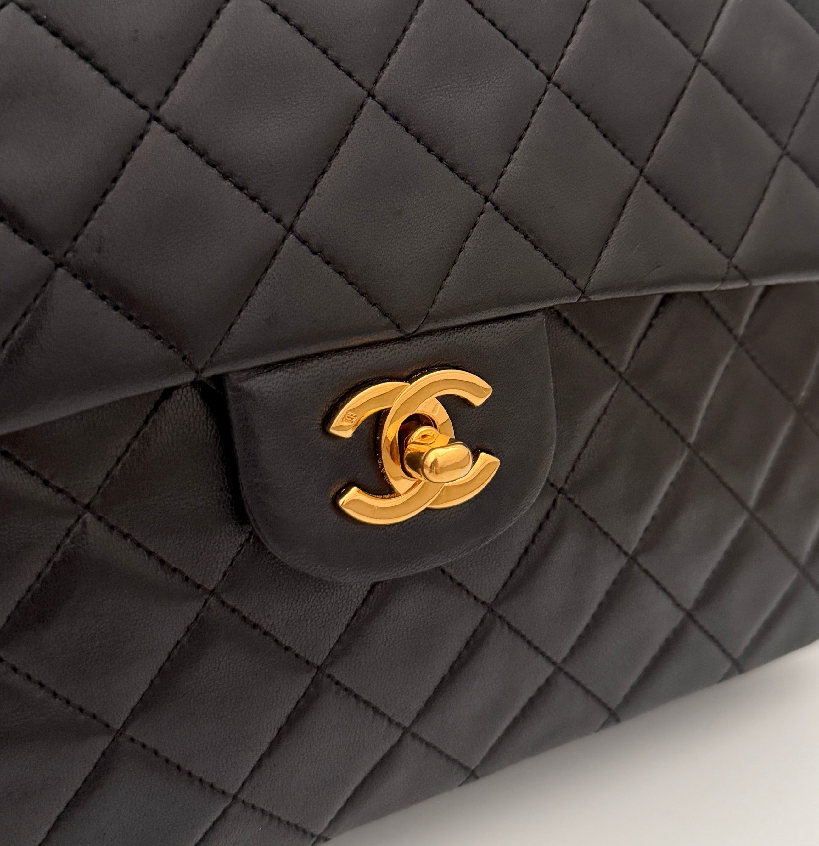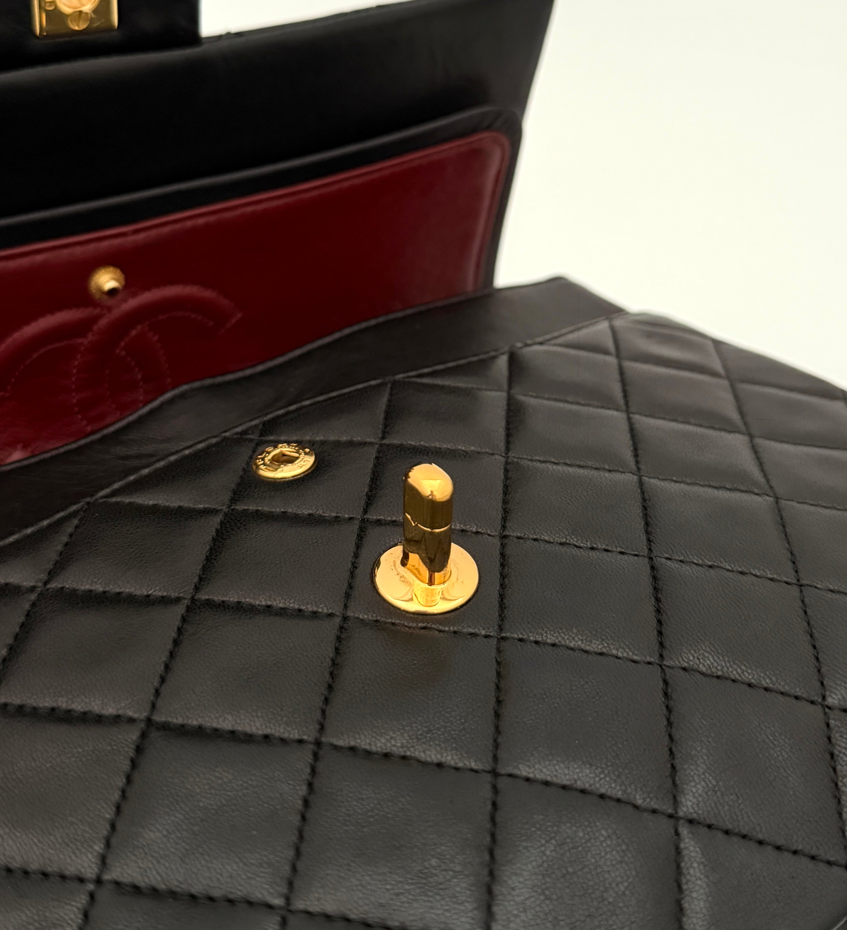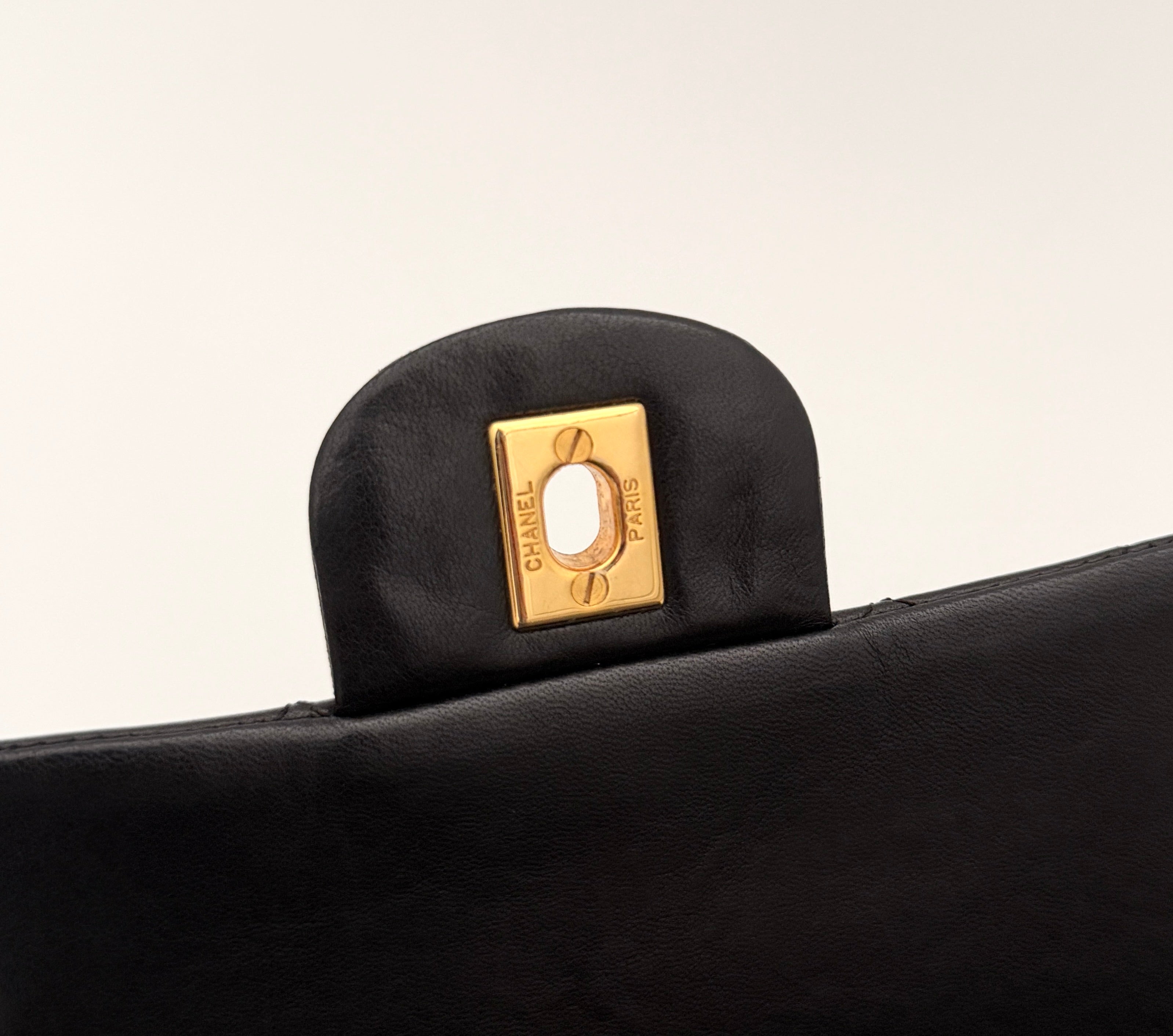Bolso Chanel de doble solapa en cuero negro con detalles metálicos en dorado.
