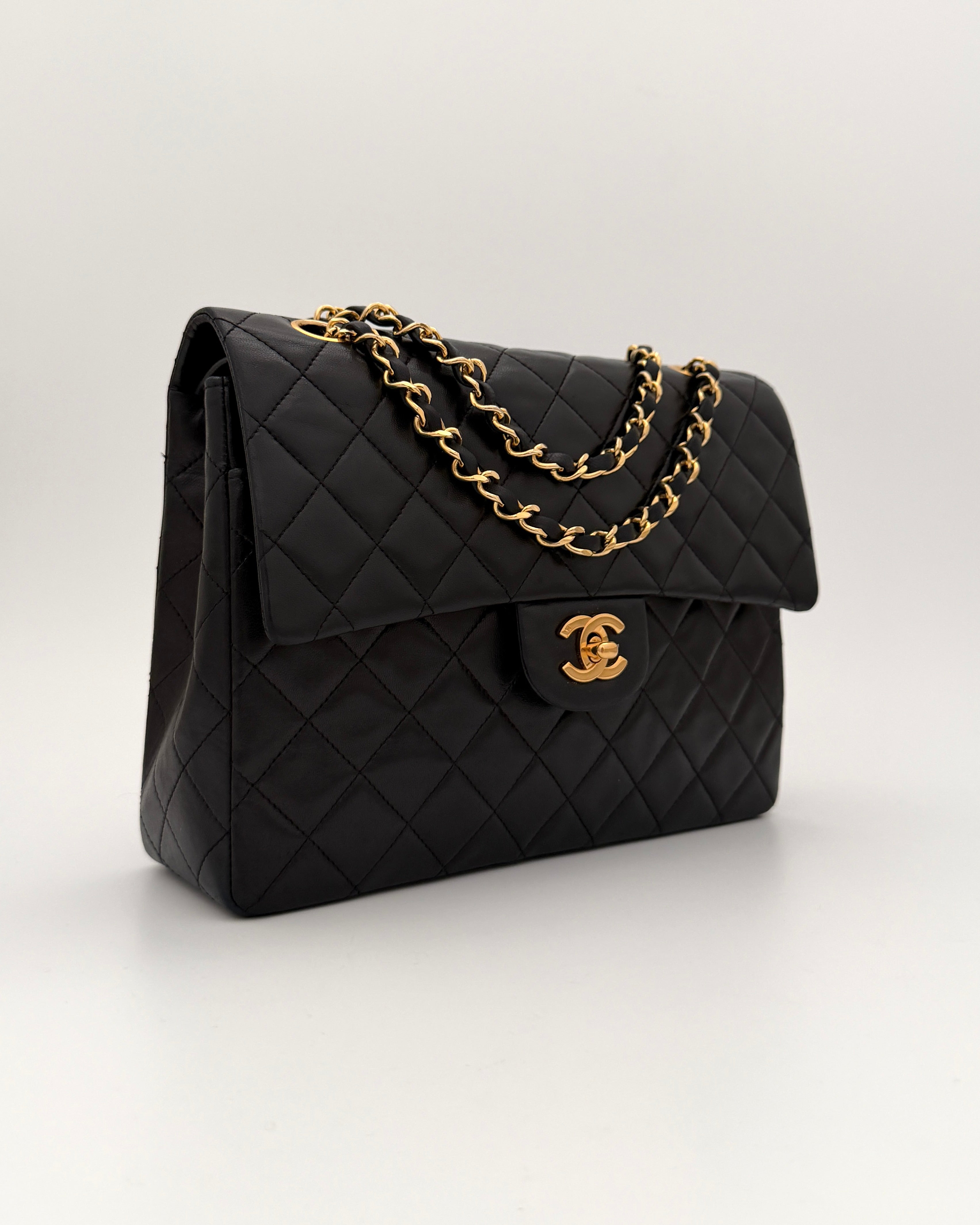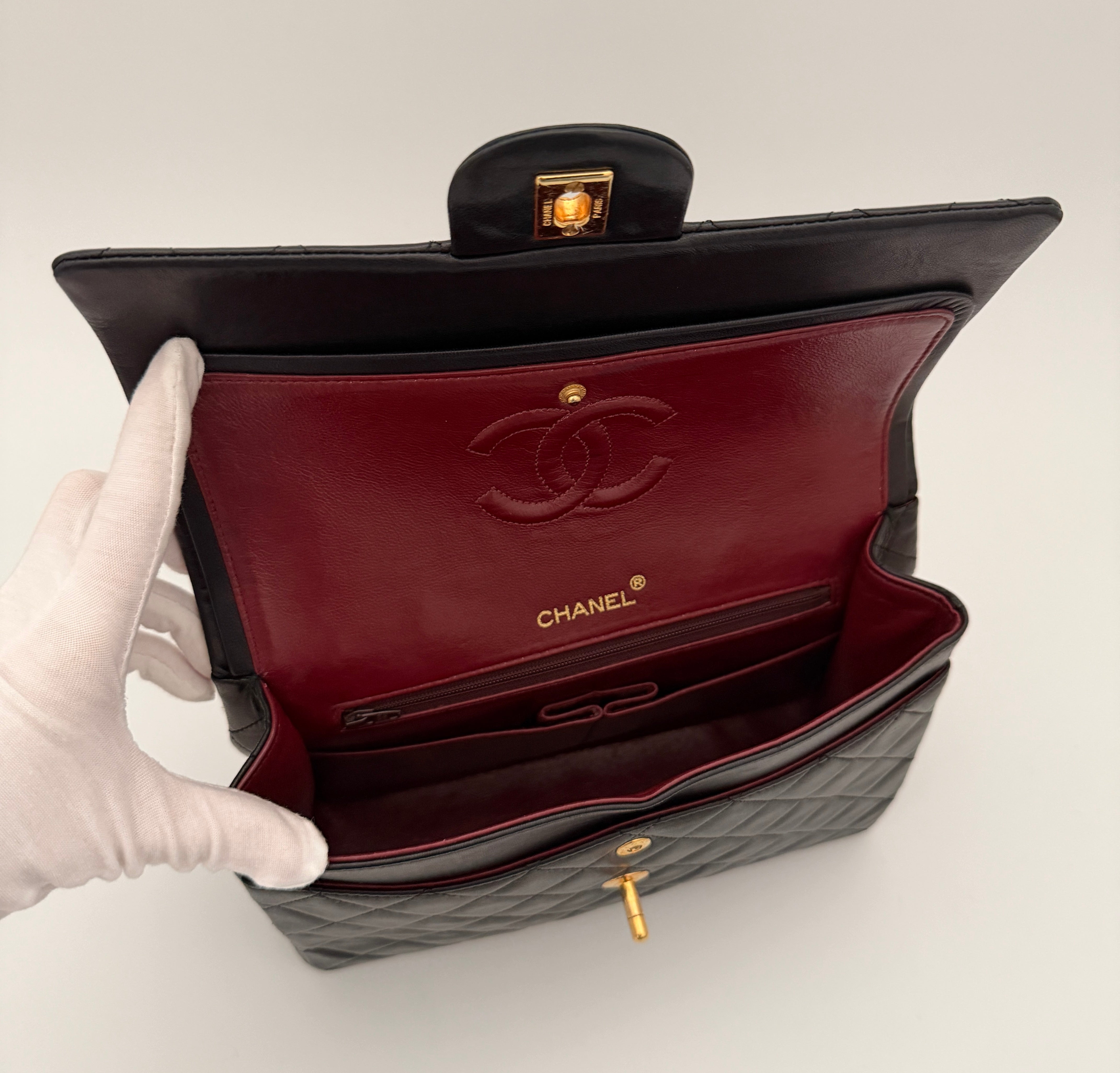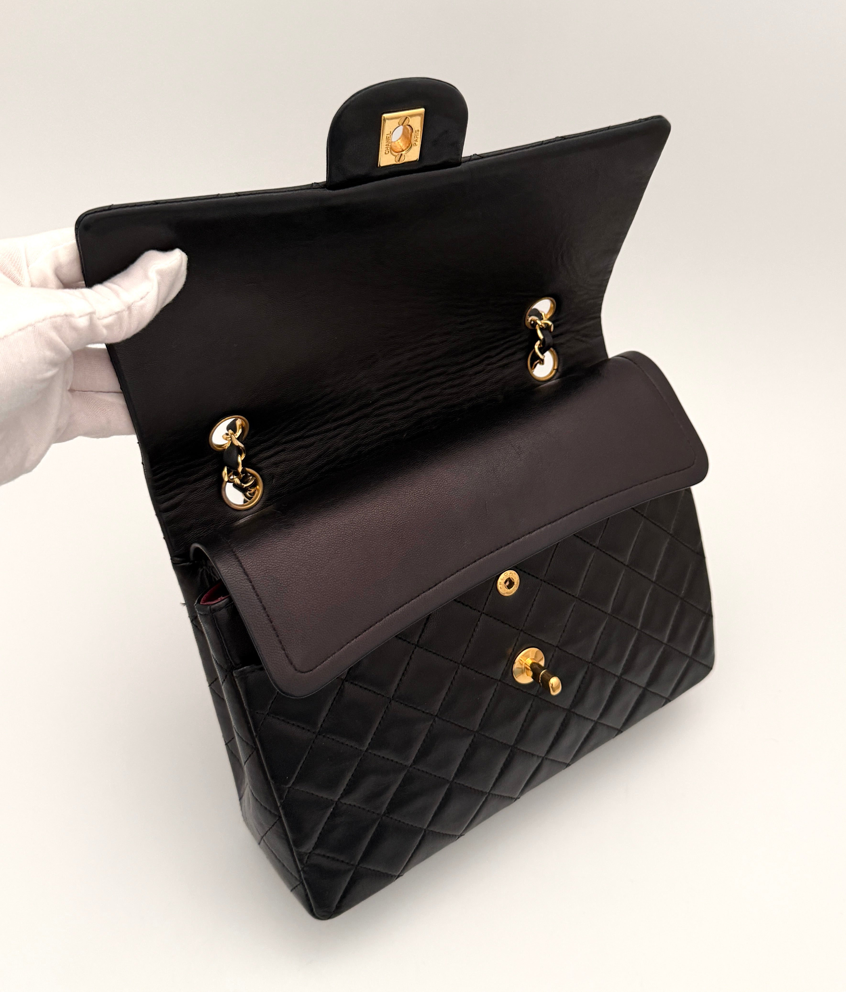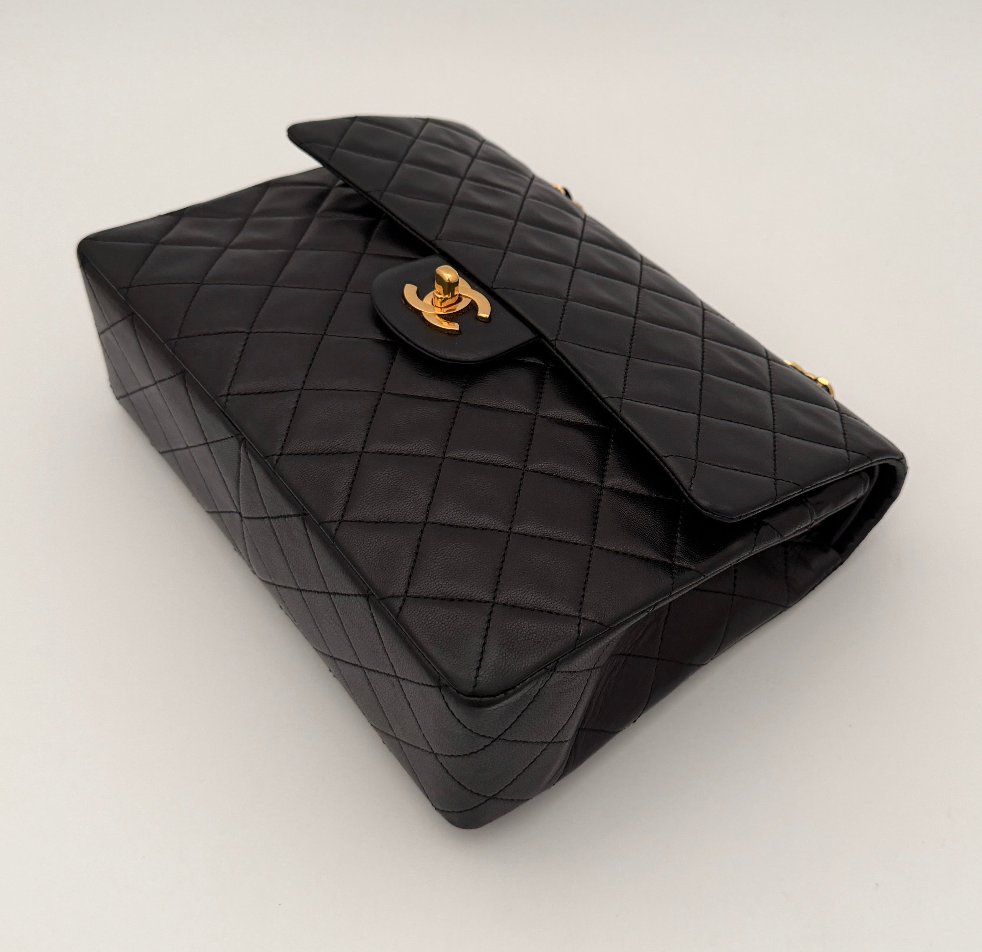 Bolso Chanel de doble solapa en cuero negro con detalles metálicos en dorado.