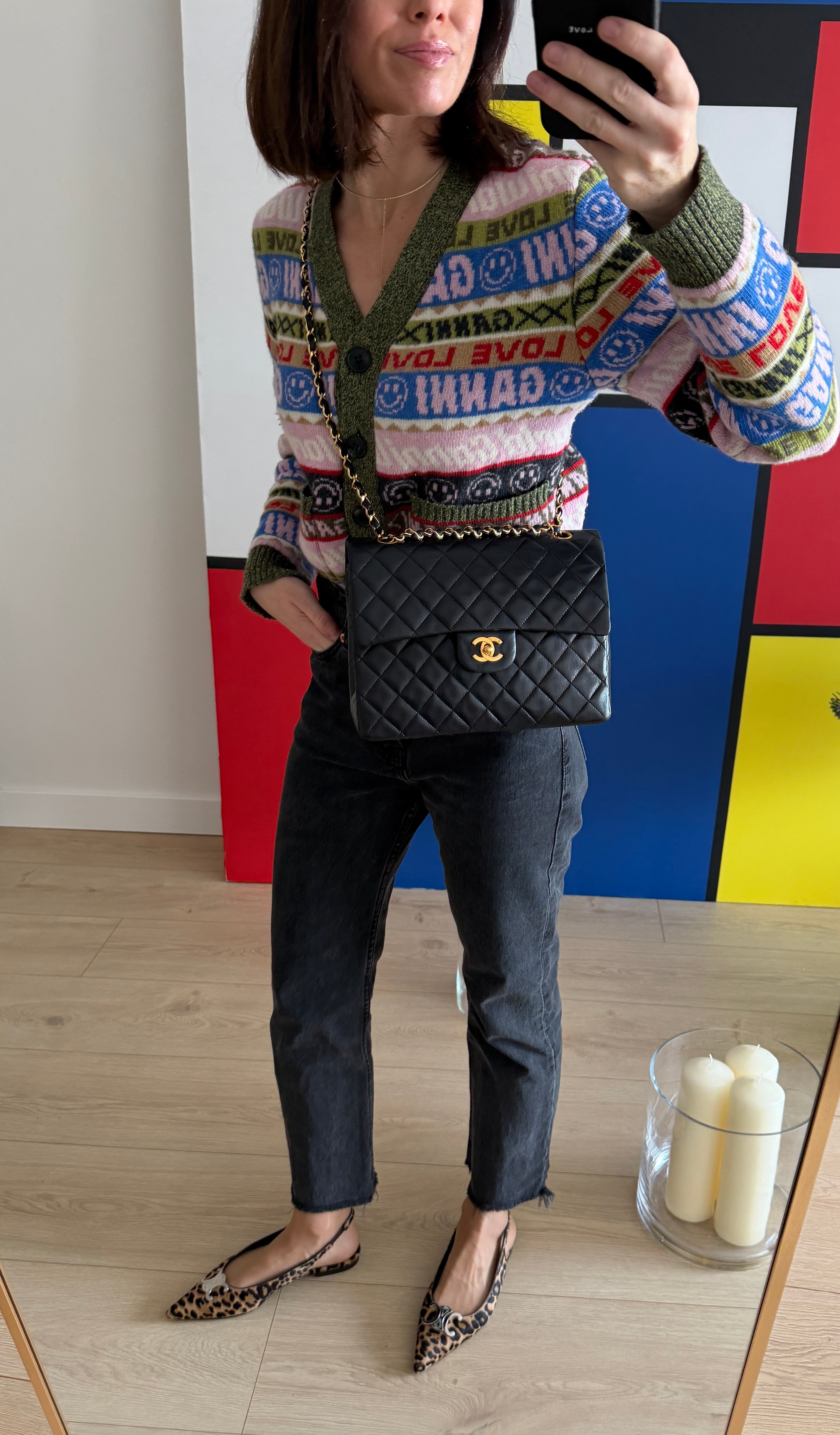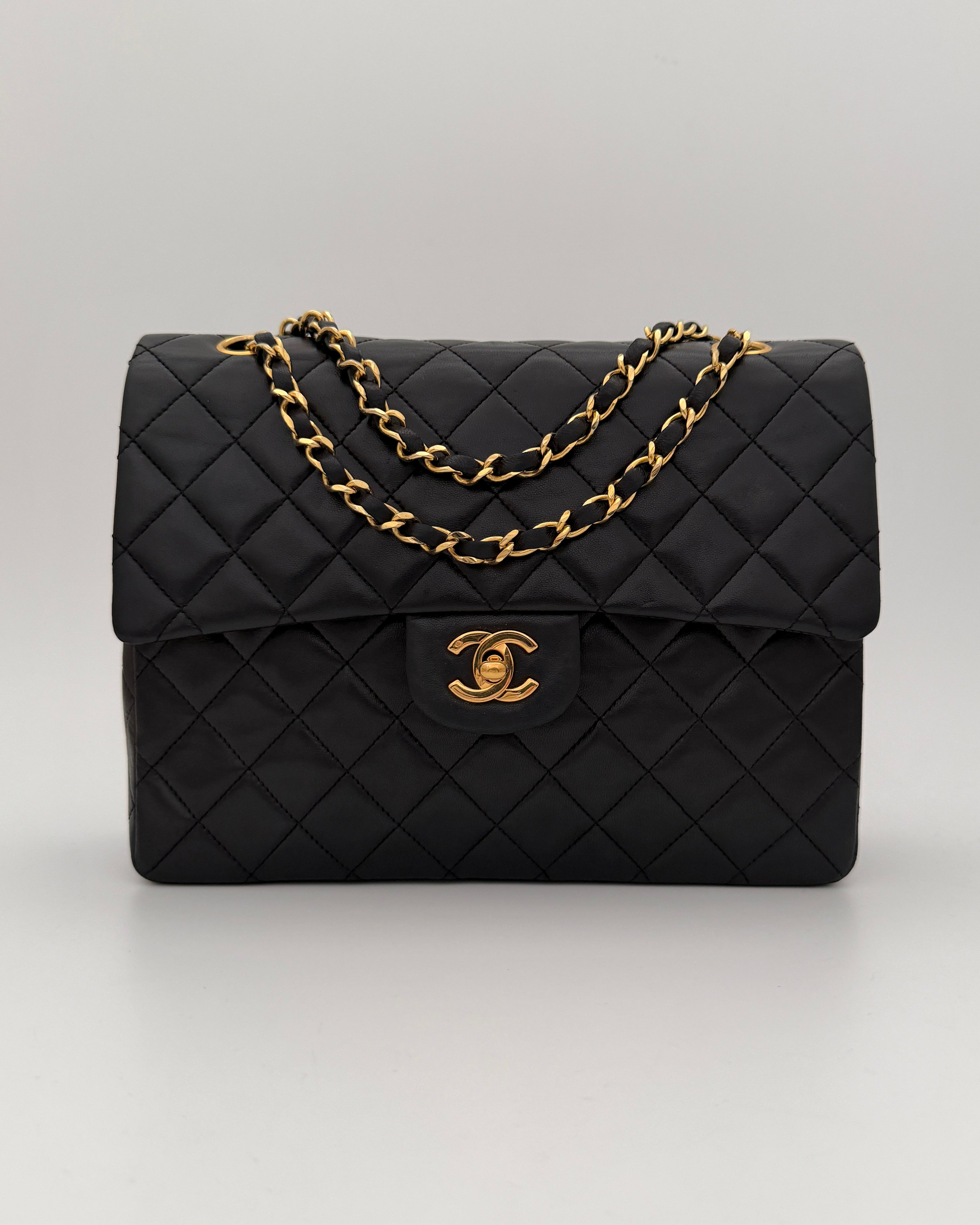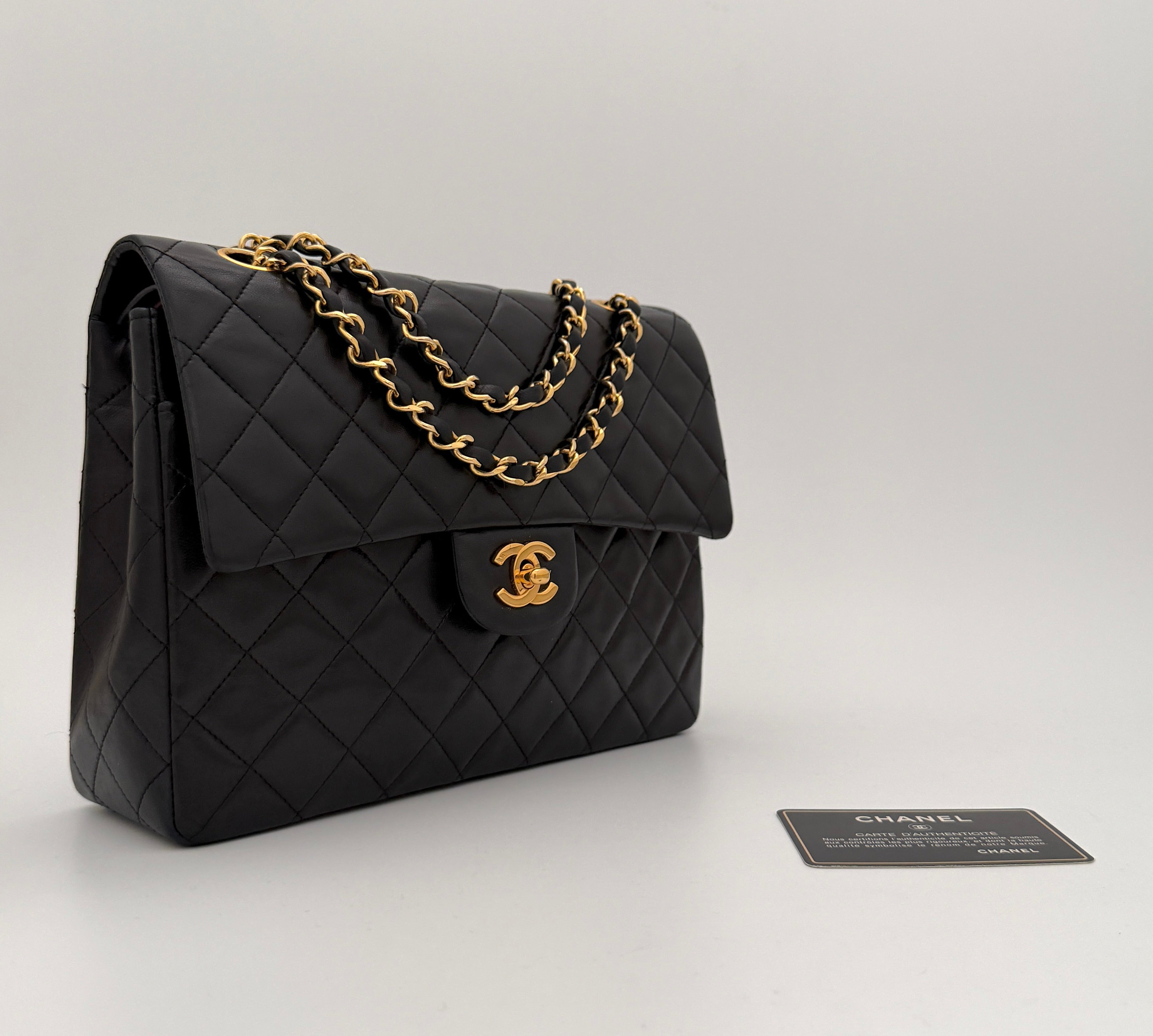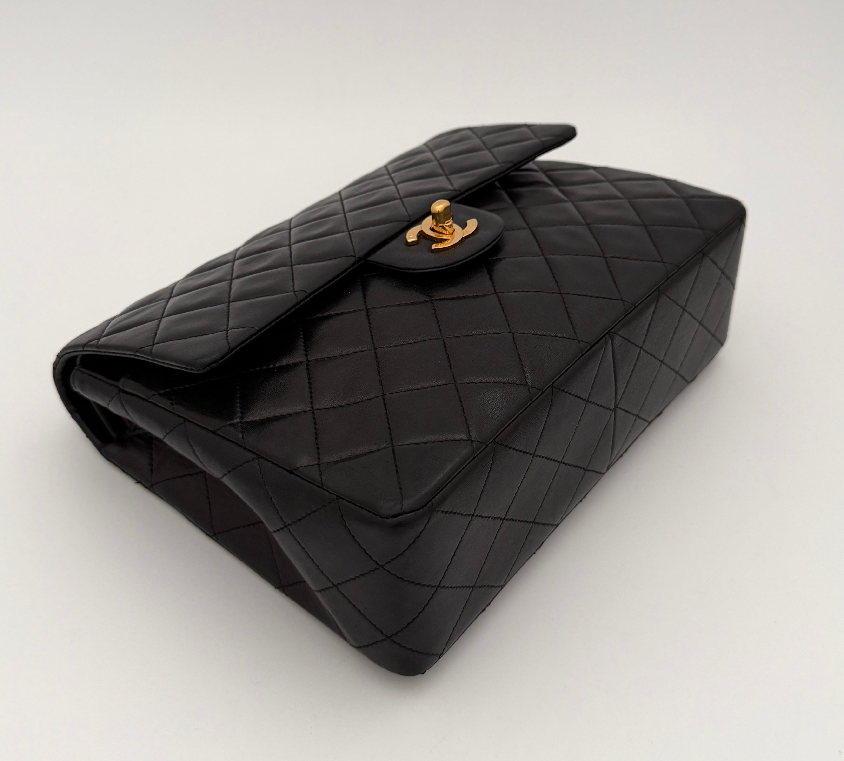 Bolso Chanel de doble solapa en cuero negro con detalles metálicos en dorado.