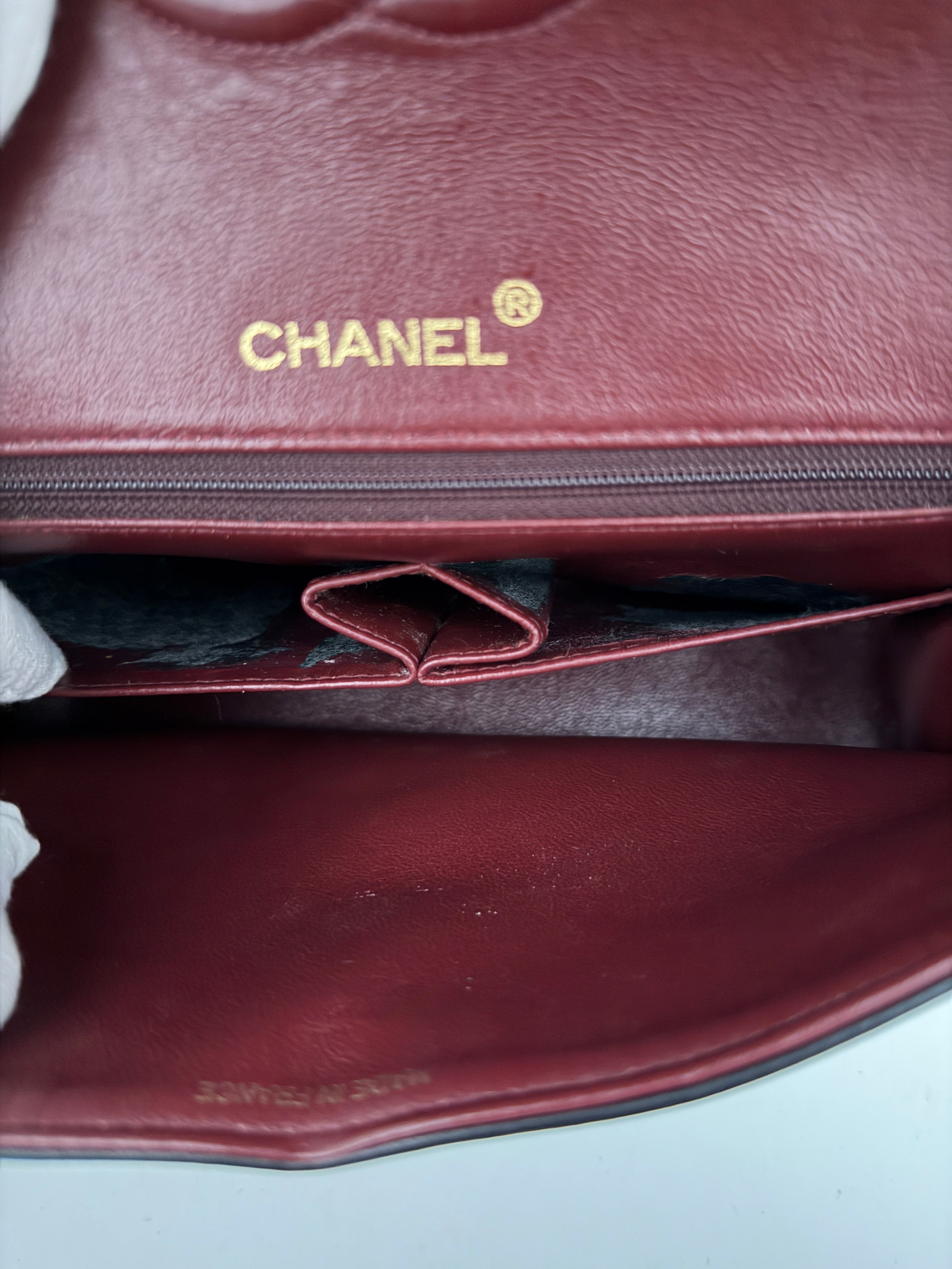 Interior: En cuero color burdeos, leves signos de uso en general, algunas ligeras manchas principalmente en la zona de la solapa, bien conservado. Los bolsillos pequeños internos están deteriorados.