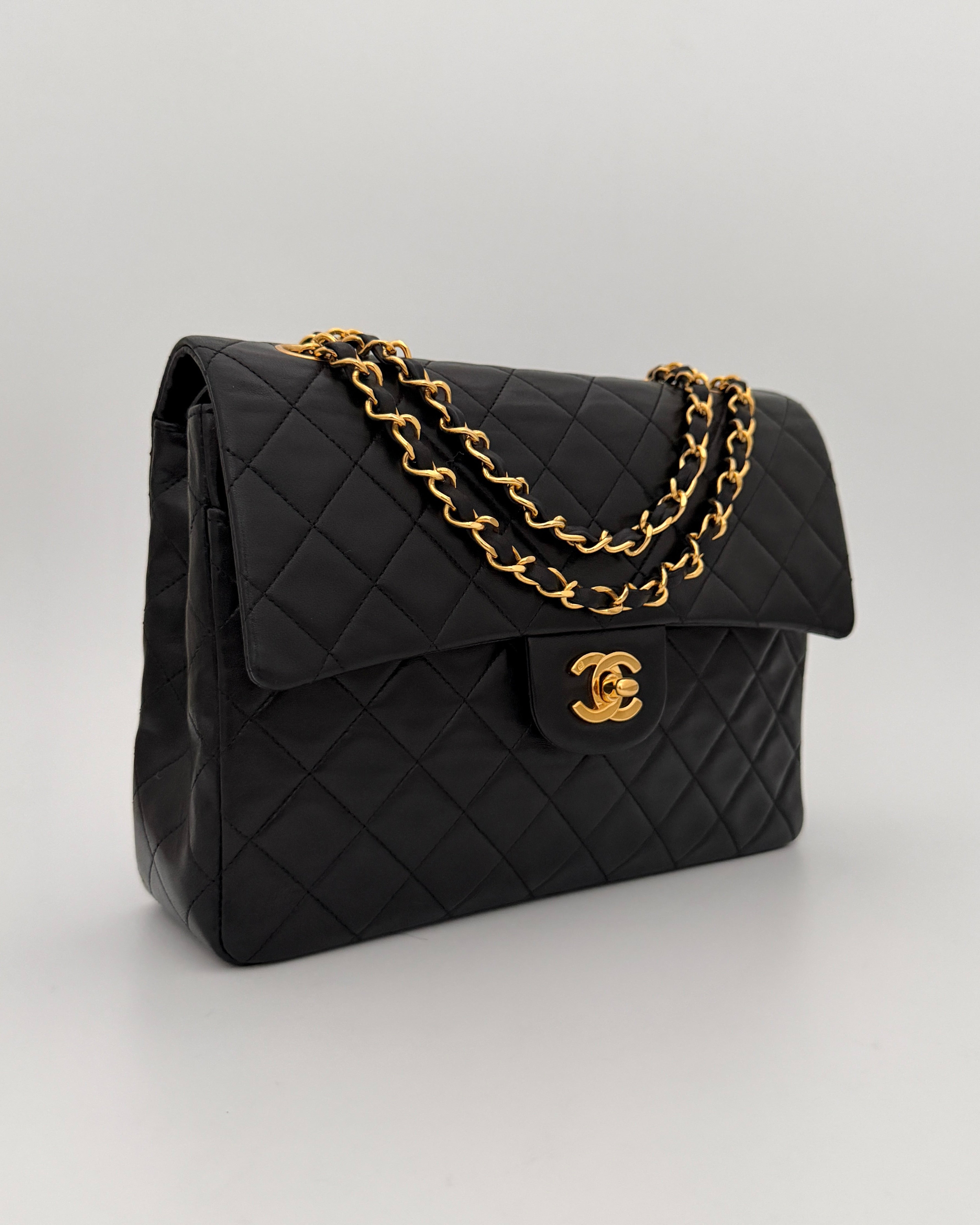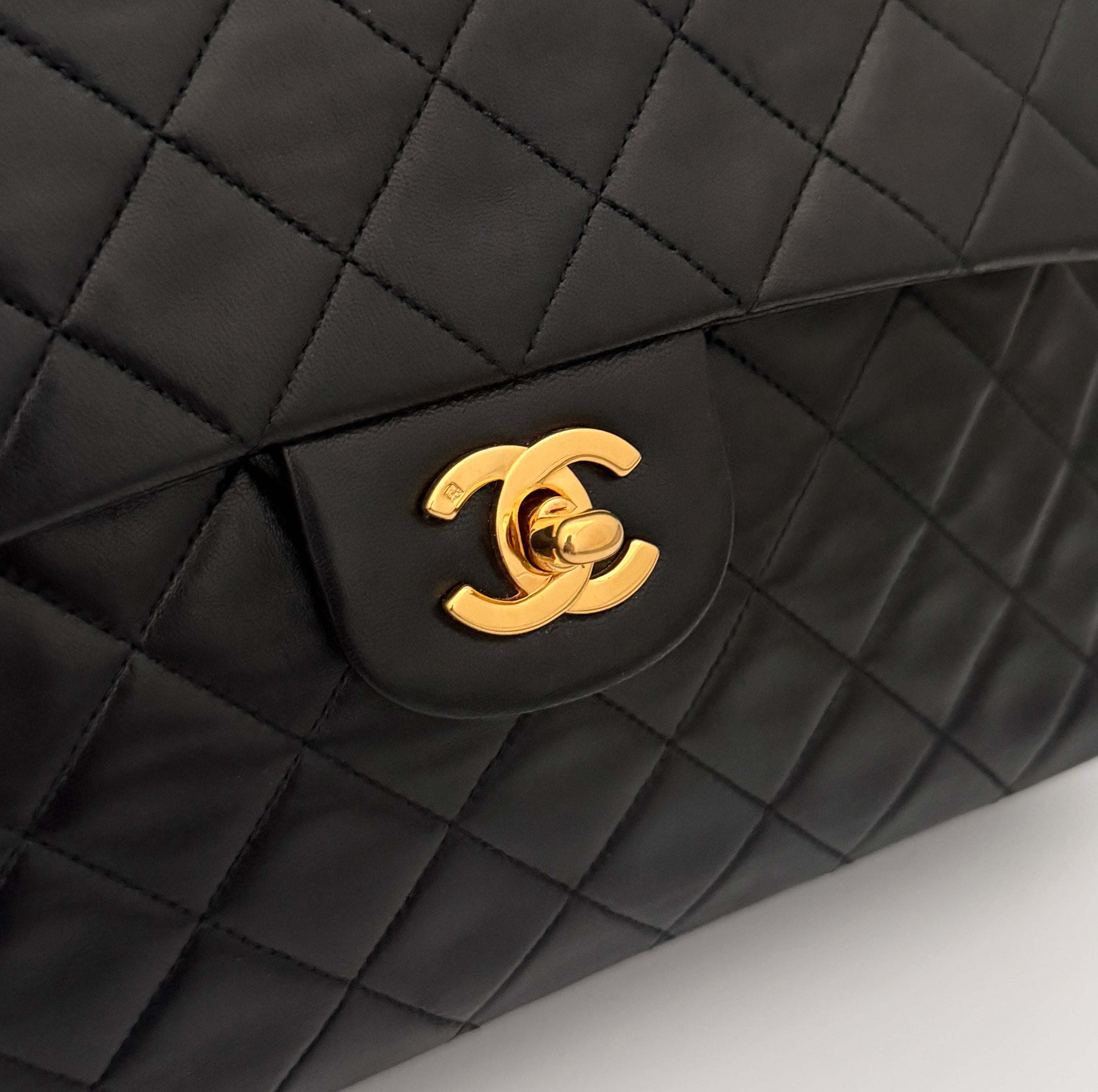 Bolso Chanel de doble solapa en cuero negro con detalles metálicos en dorado.
