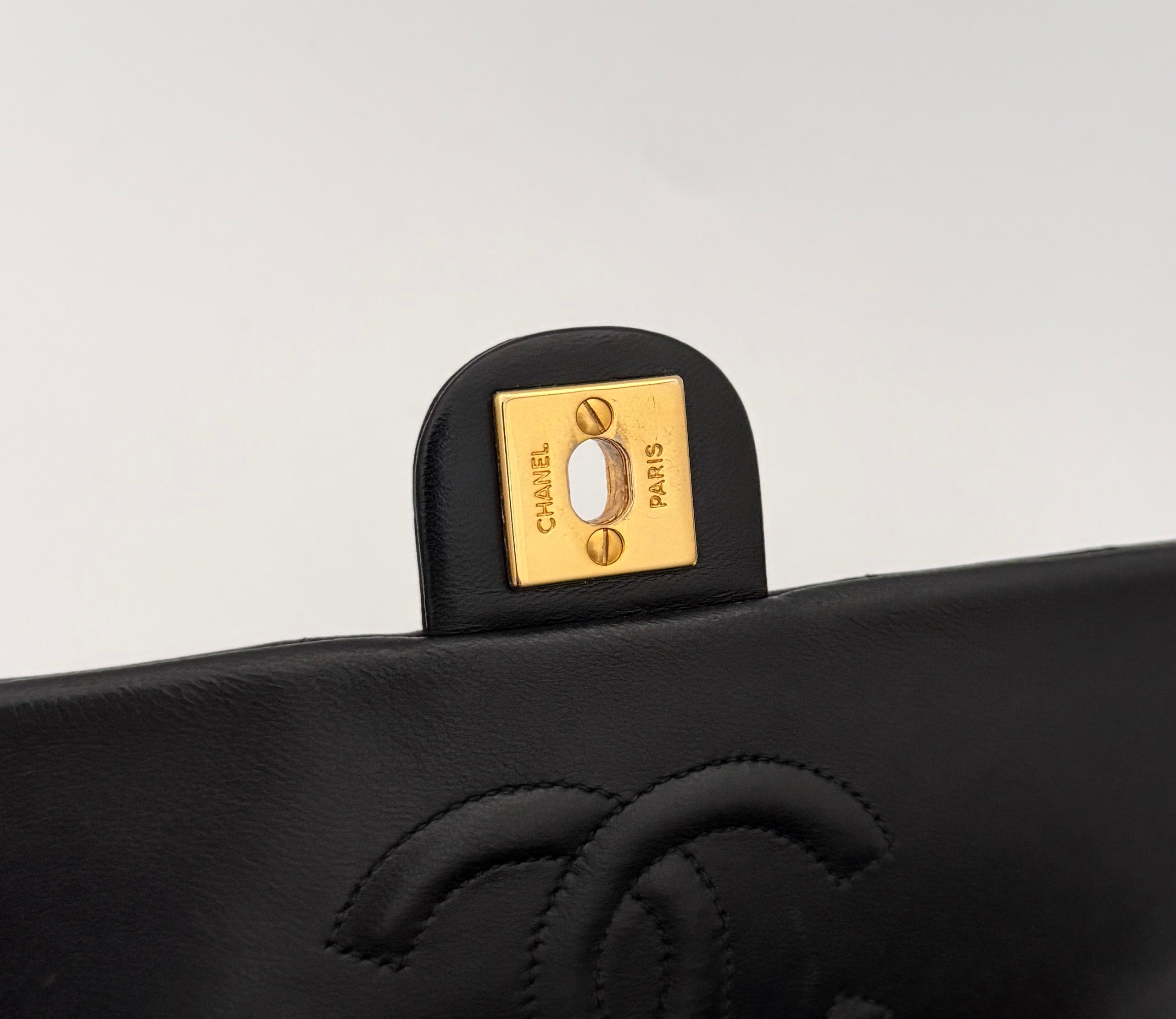 Bolso Chanel mid flap en cuero negro con detalles metálicos en dorado.