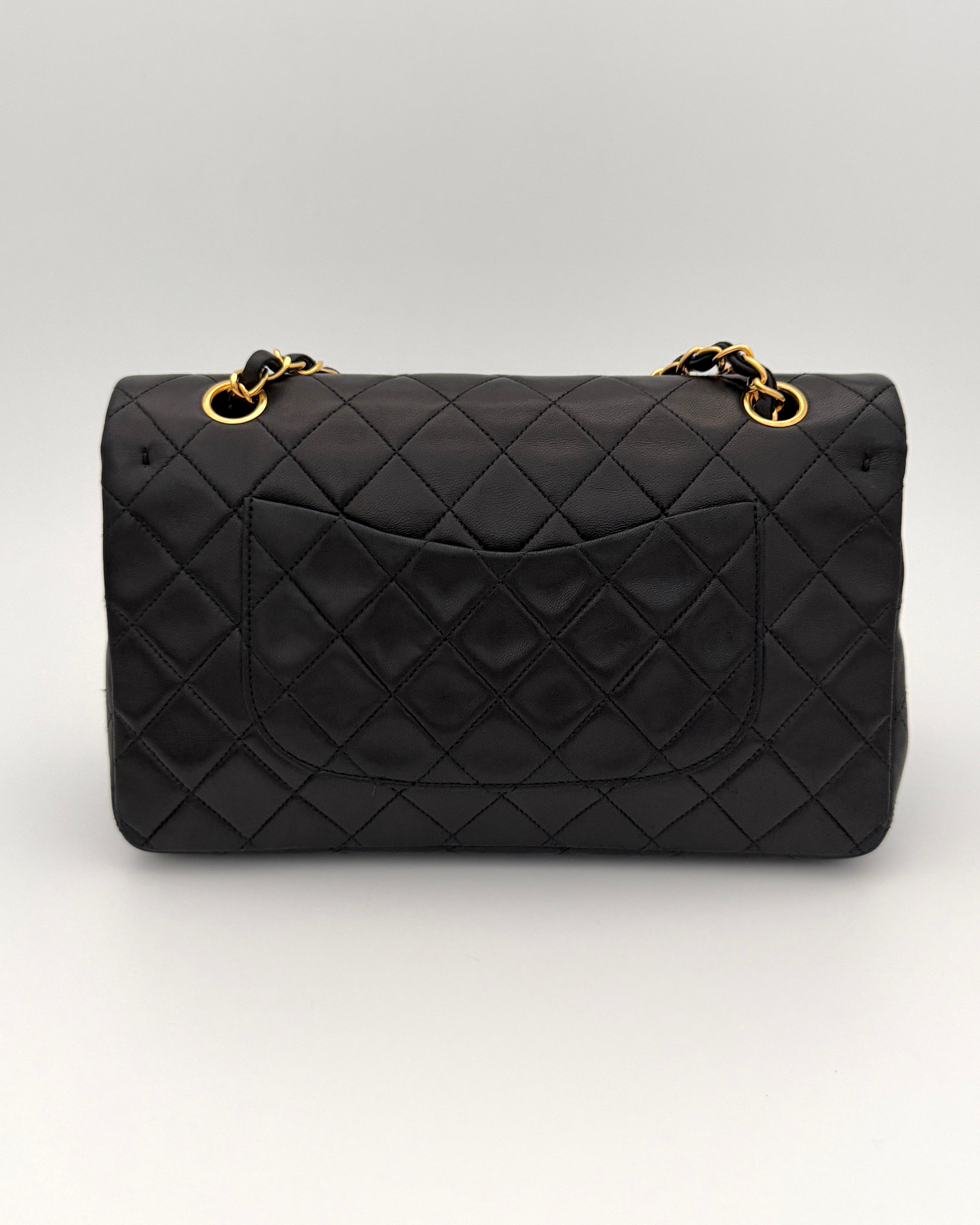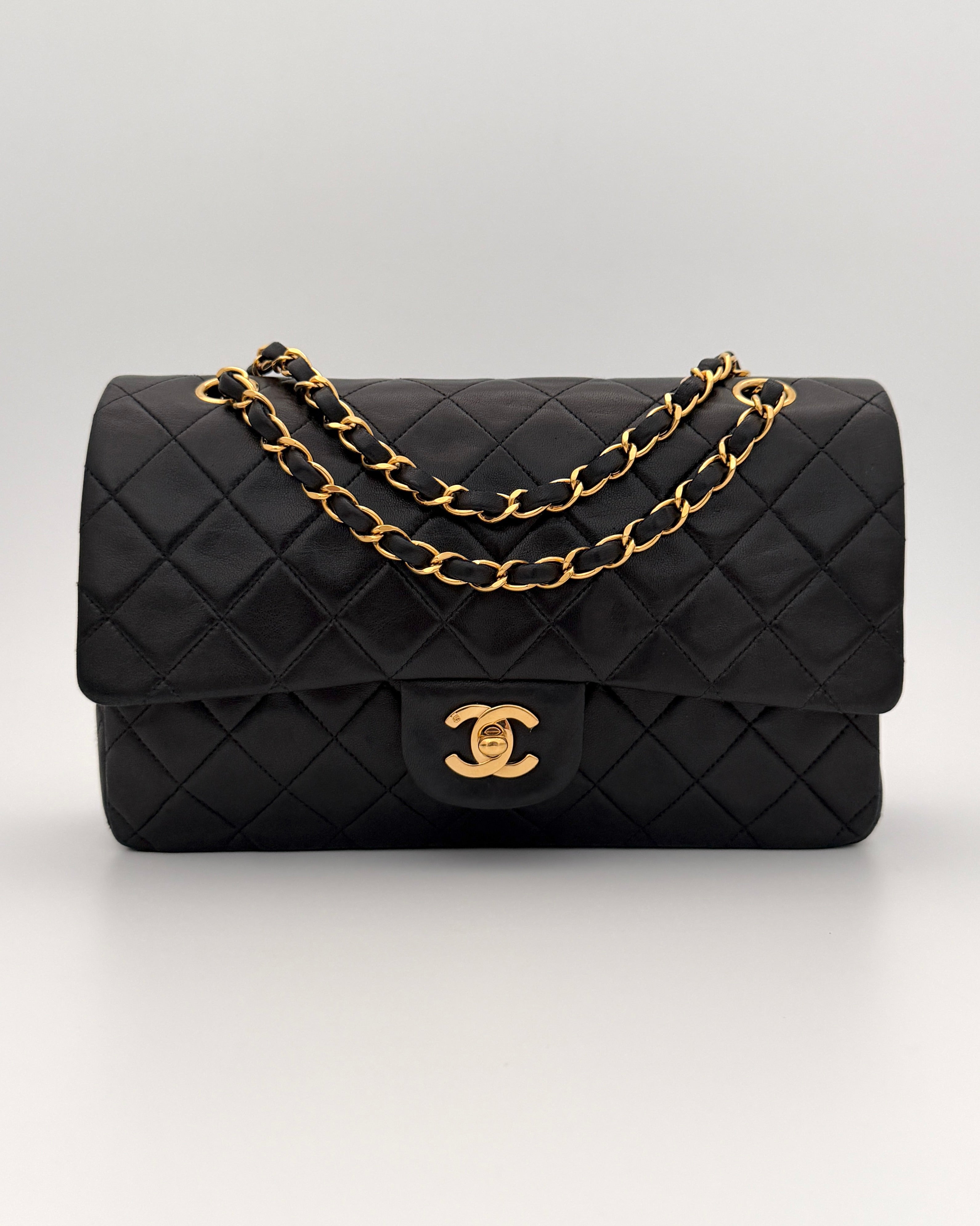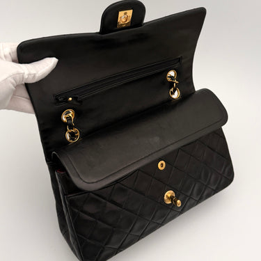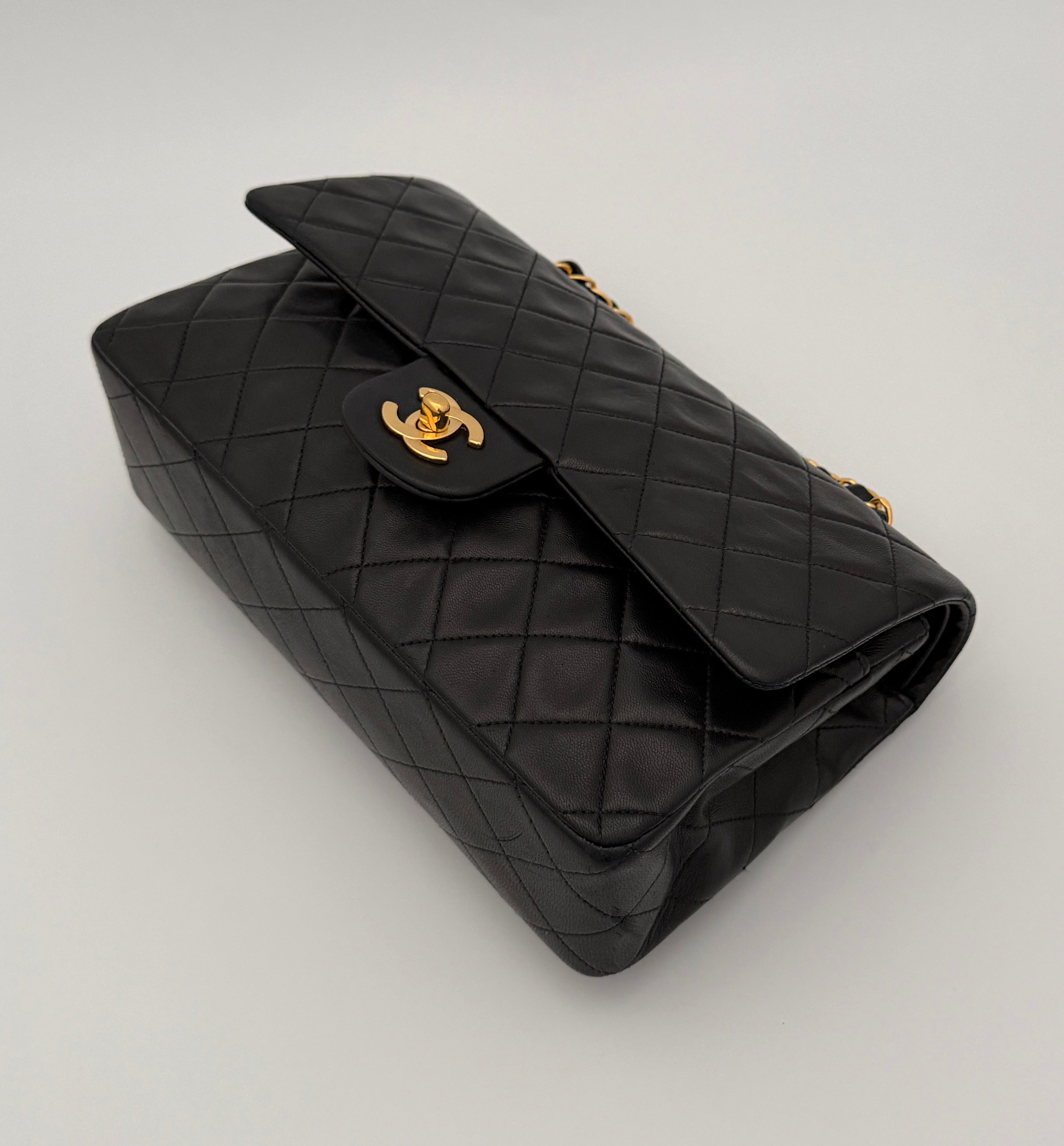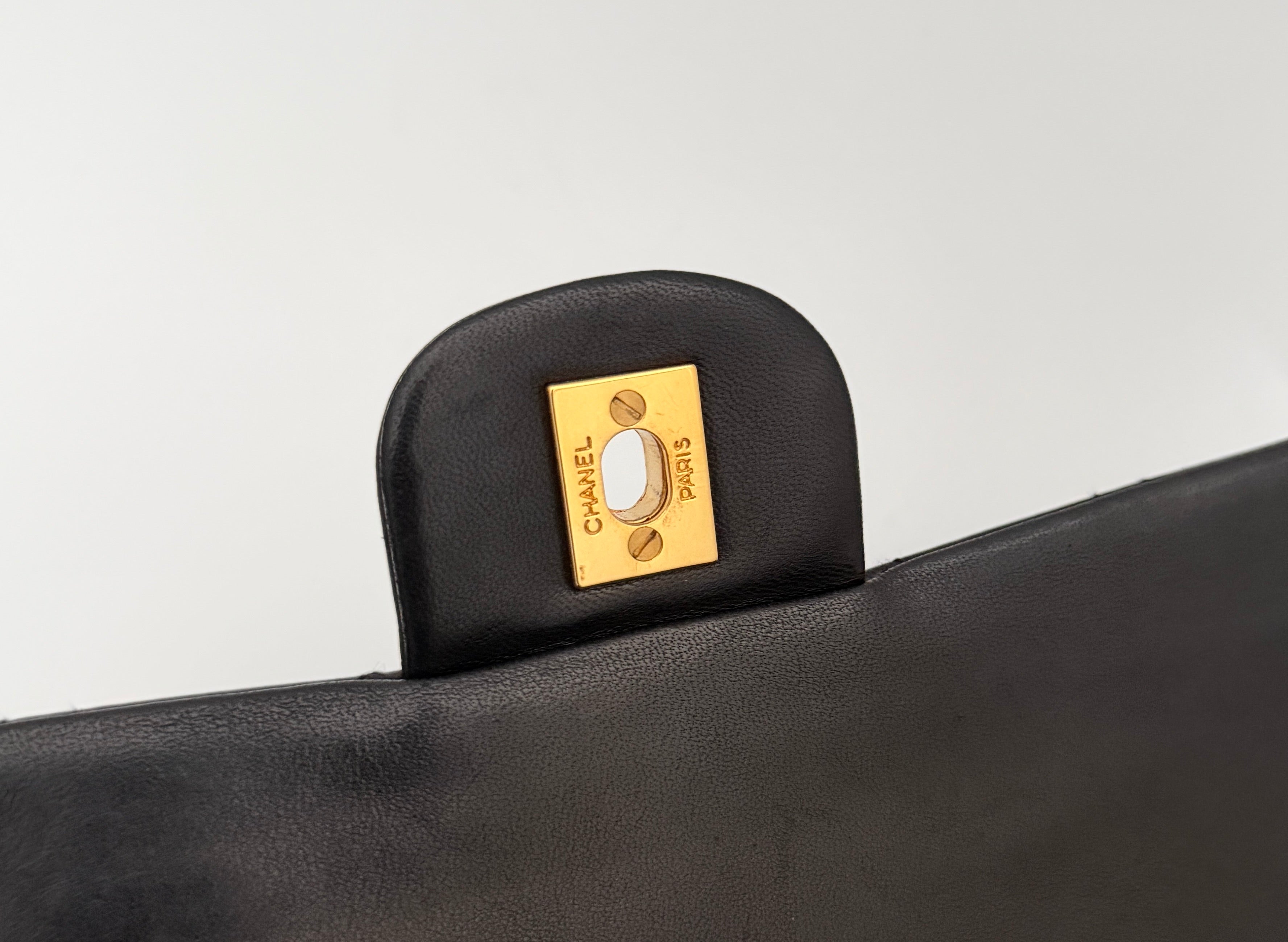 Bolso Chanel Timeless 25 de doble solapa en cuero negro con detalles metálicos en dorado.