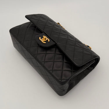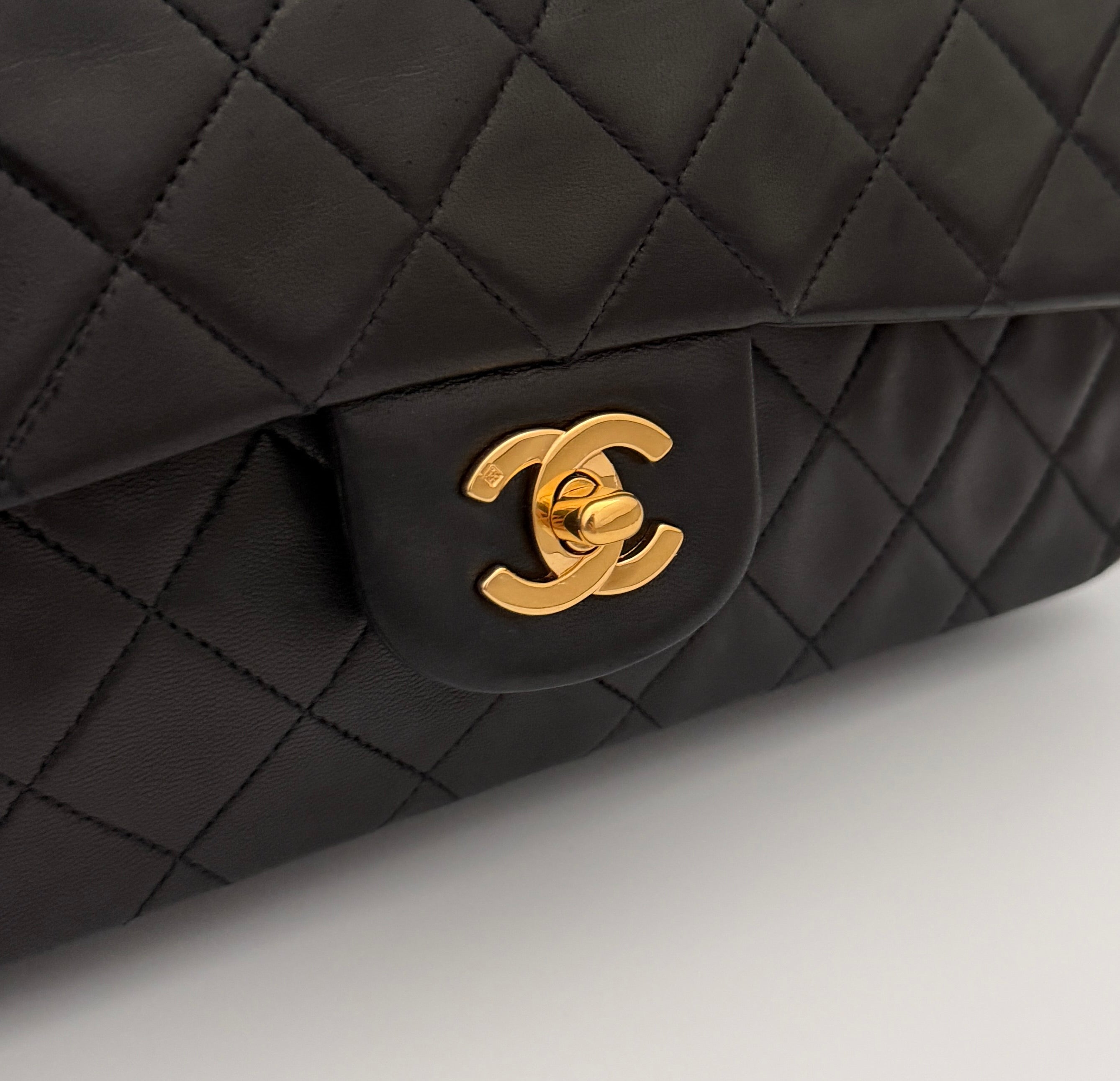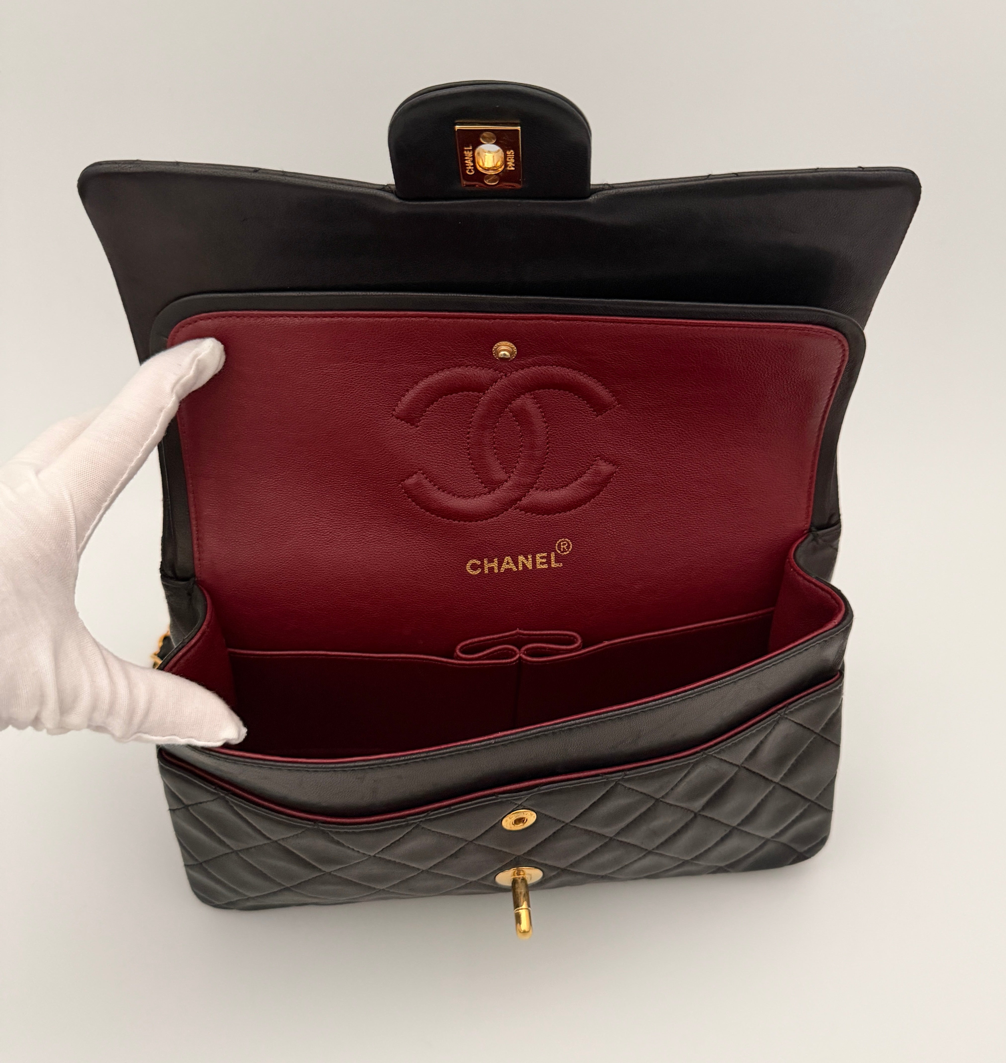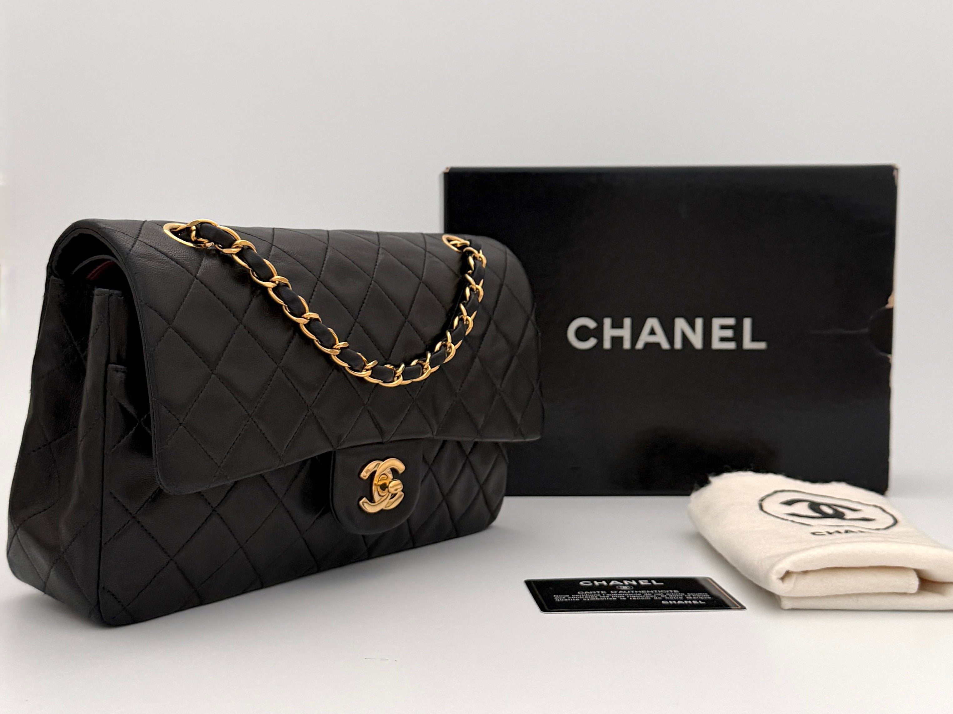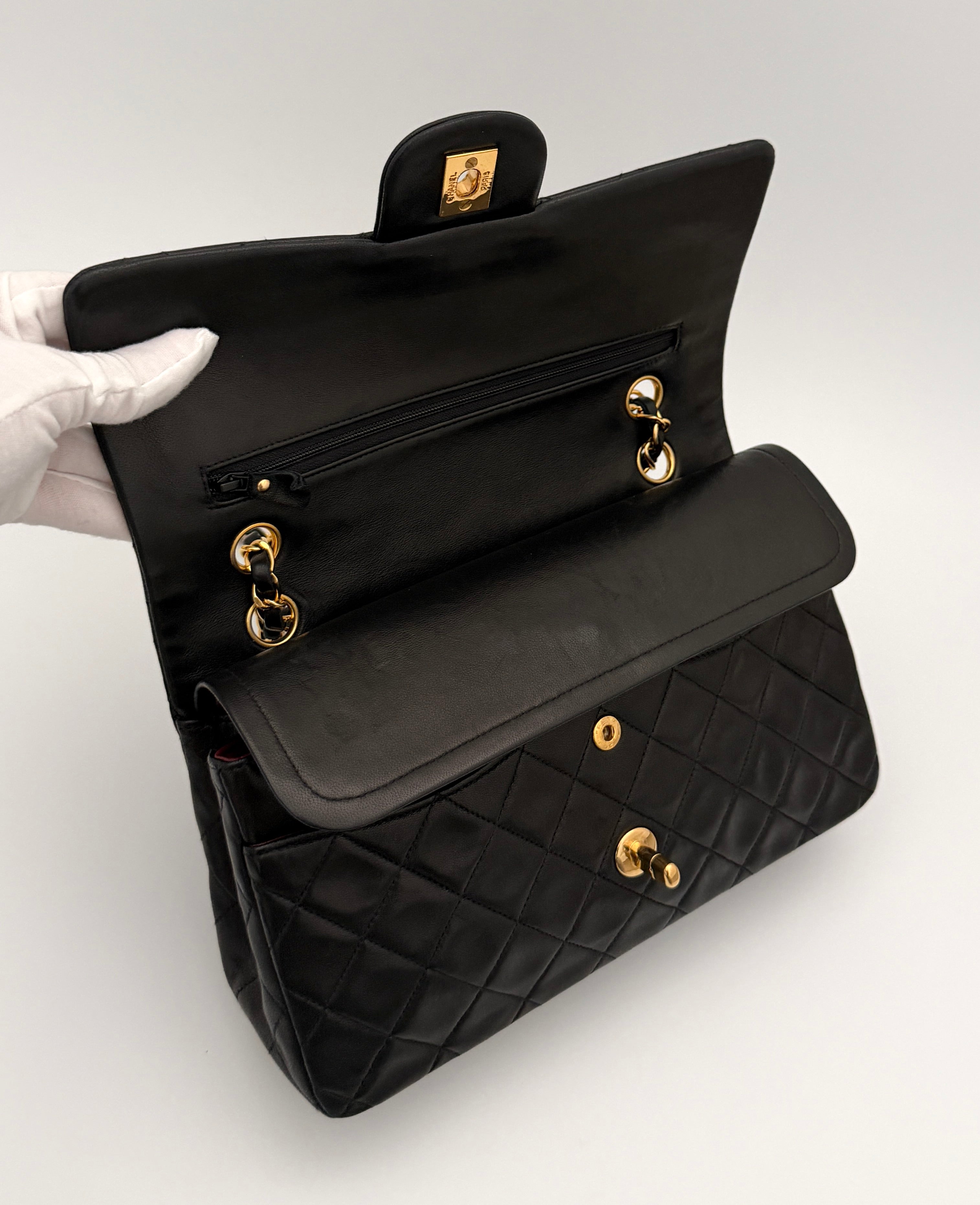 Bolso Chanel Timeless 25 de doble solapa en cuero negro con detalles metálicos en dorado.