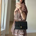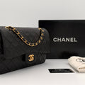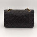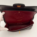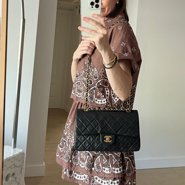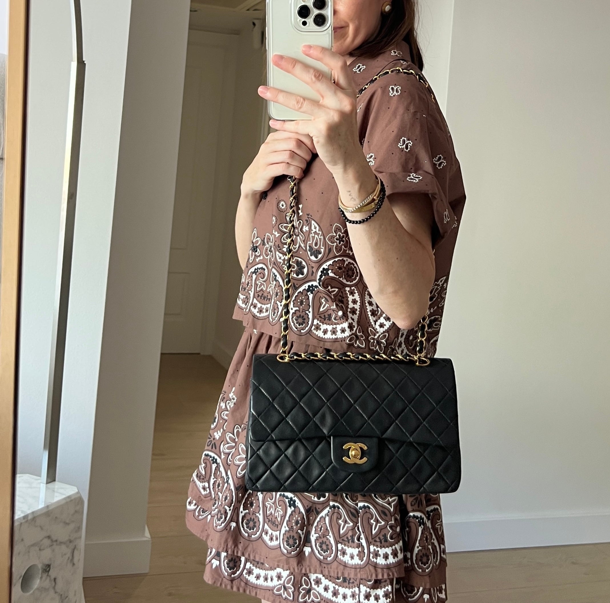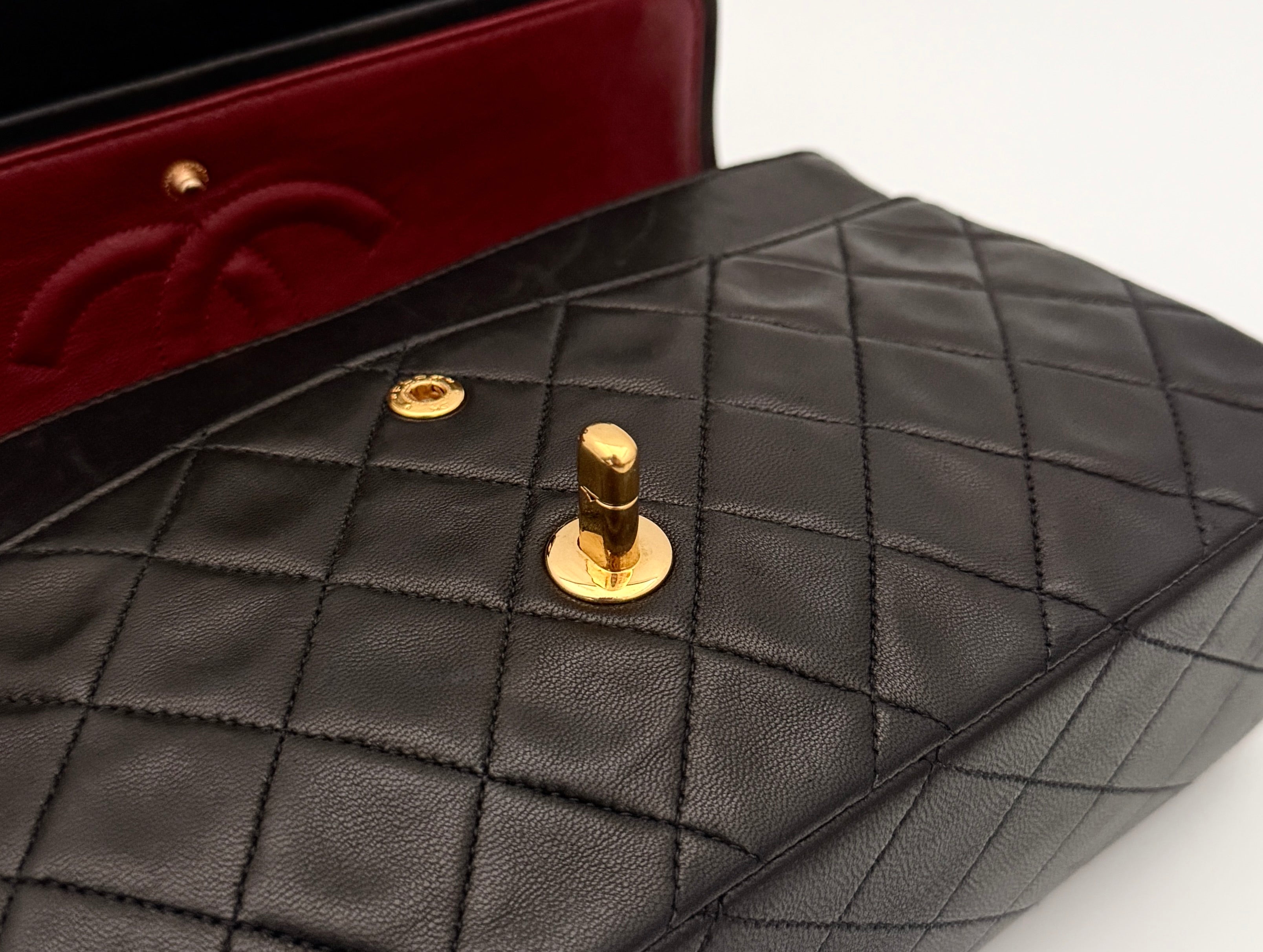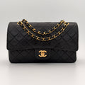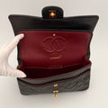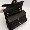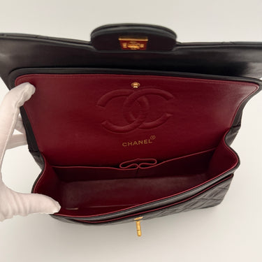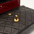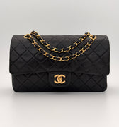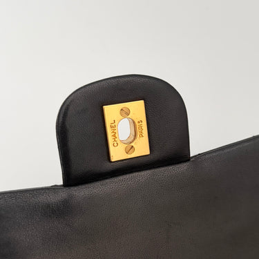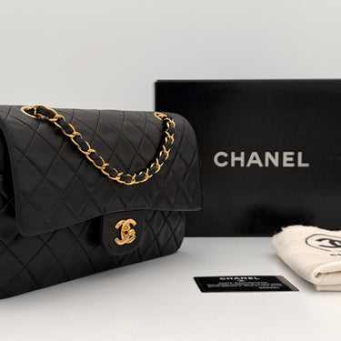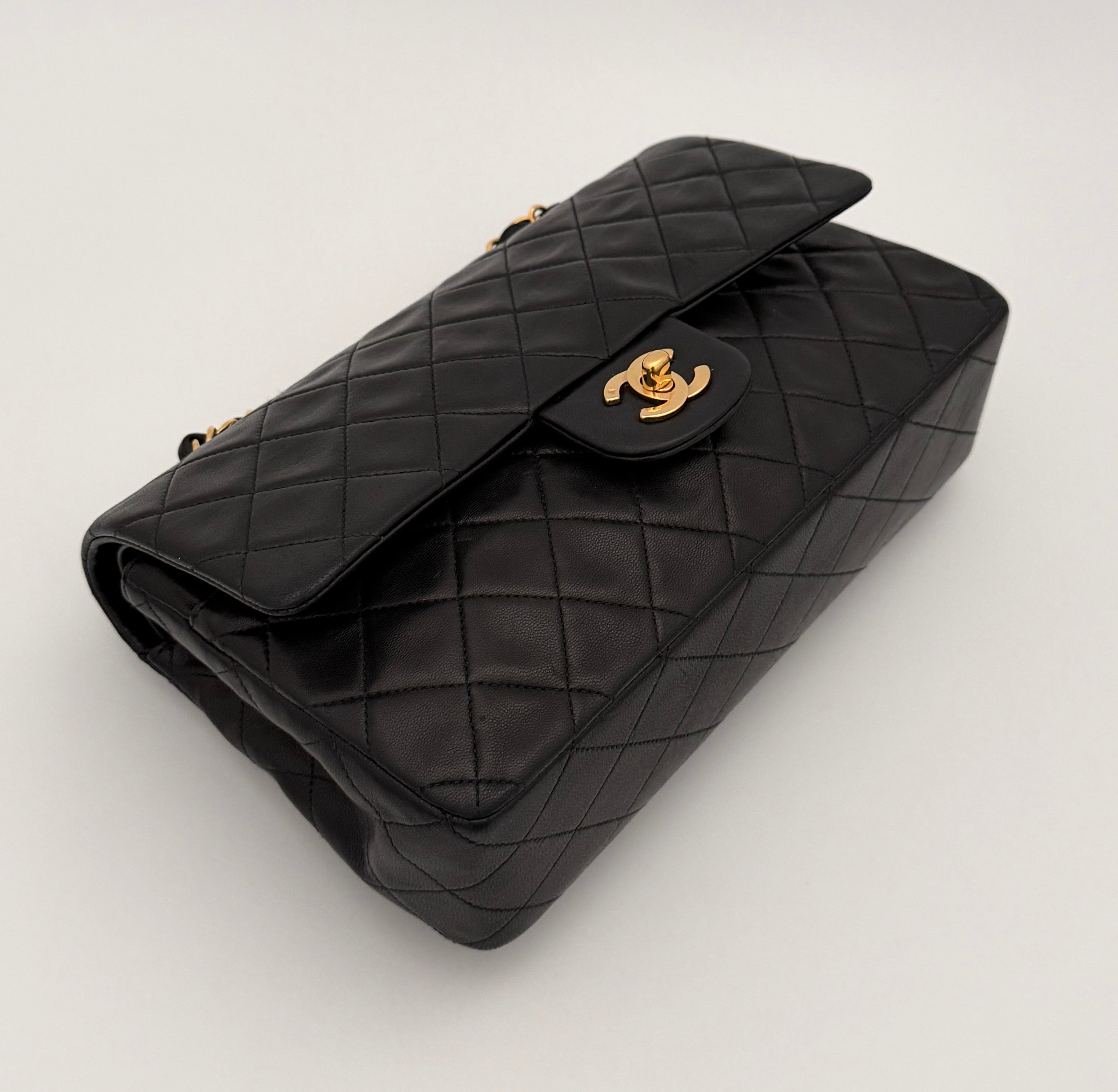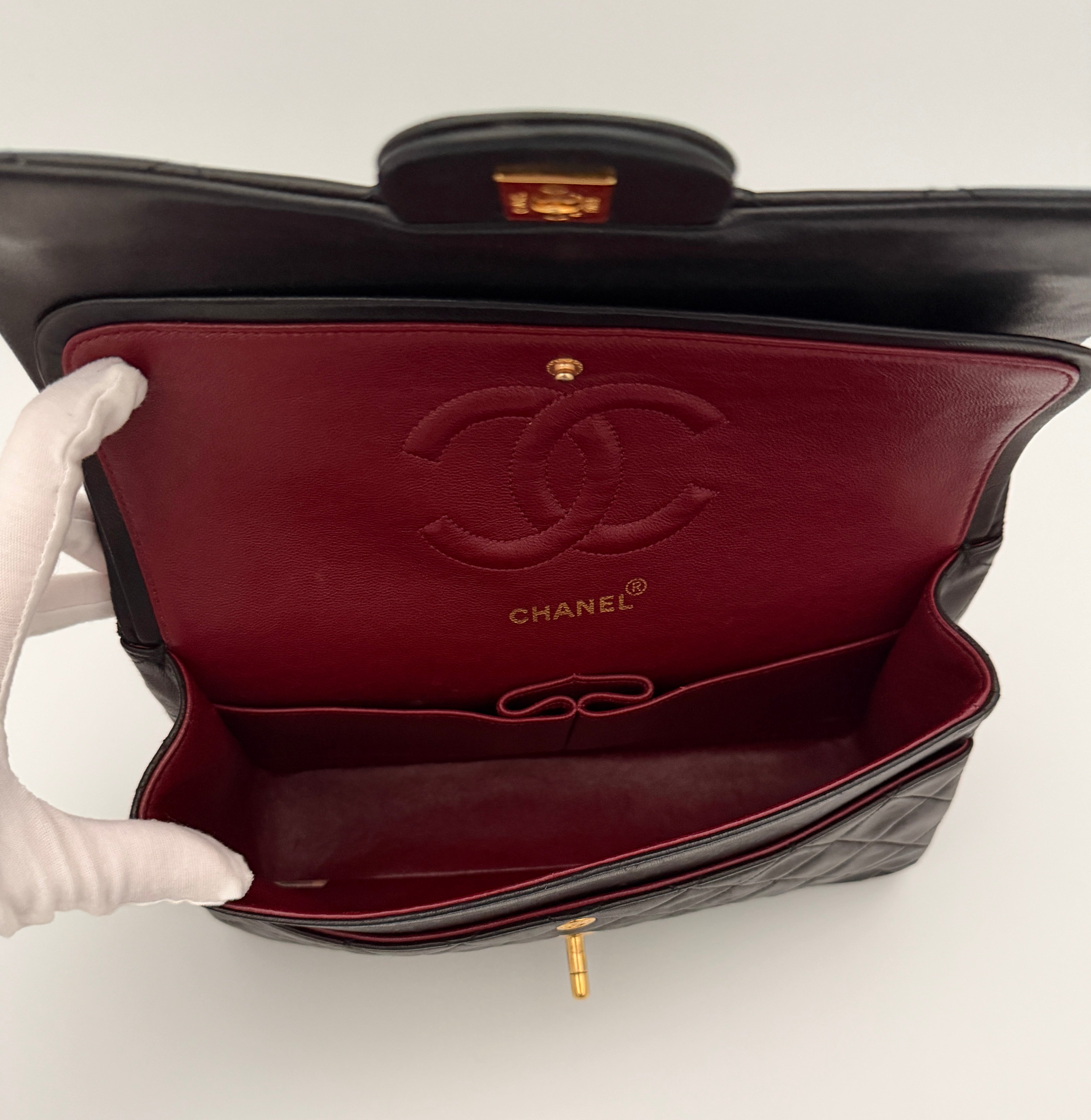 Bolso Chanel Timeless 25 de doble solapa en cuero negro con detalles metálicos en dorado.