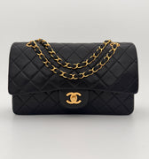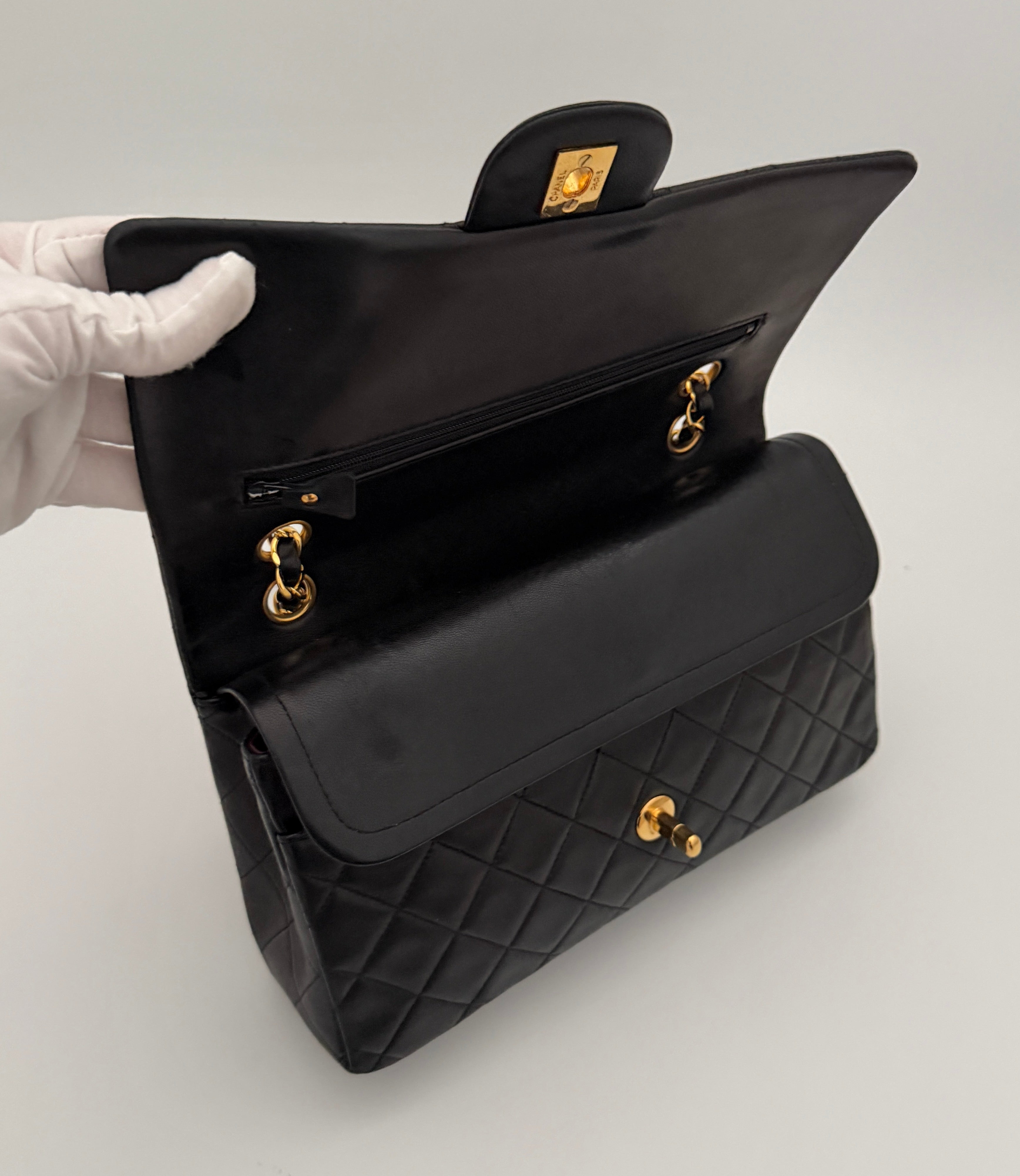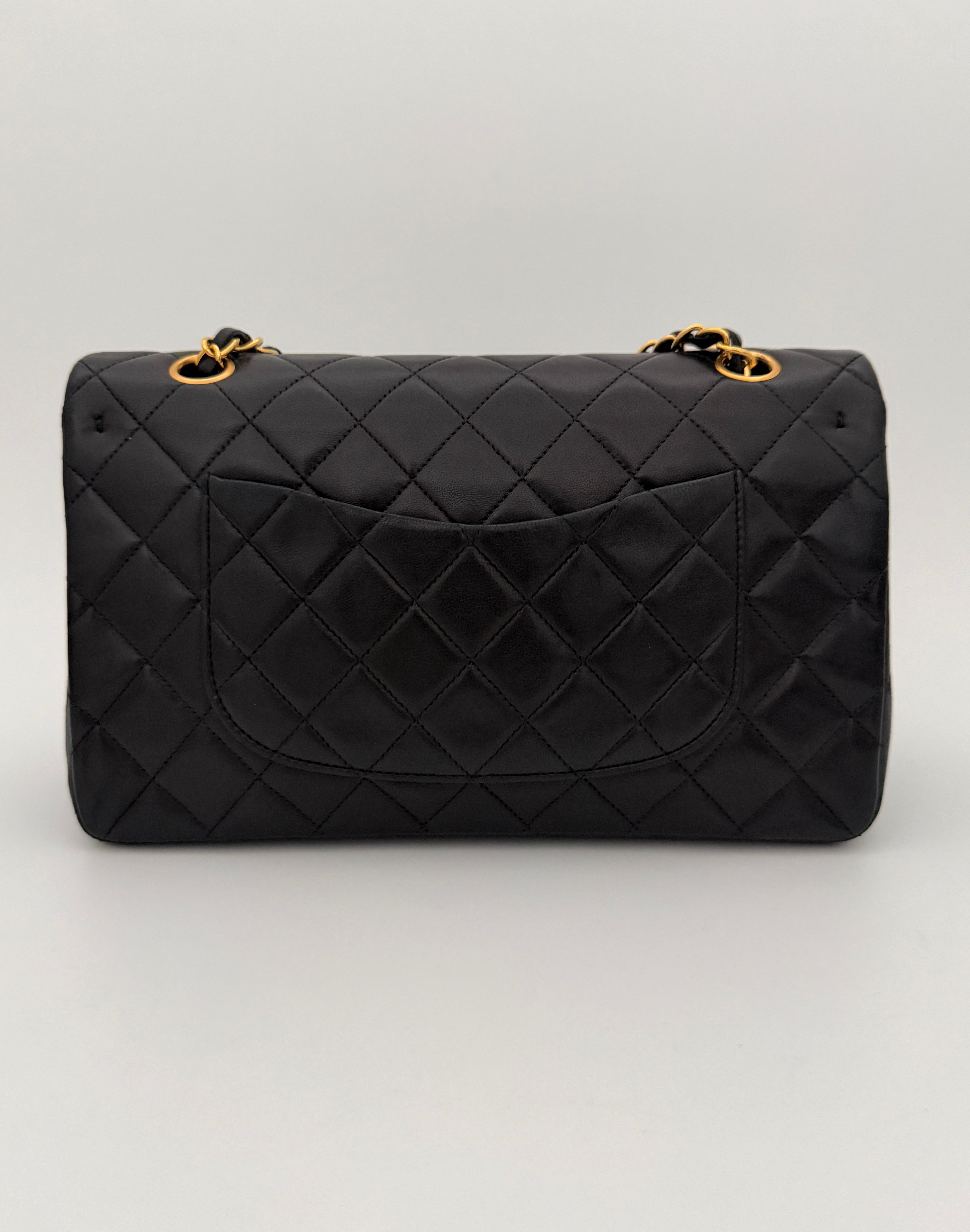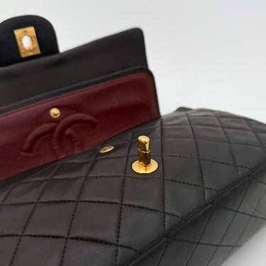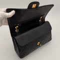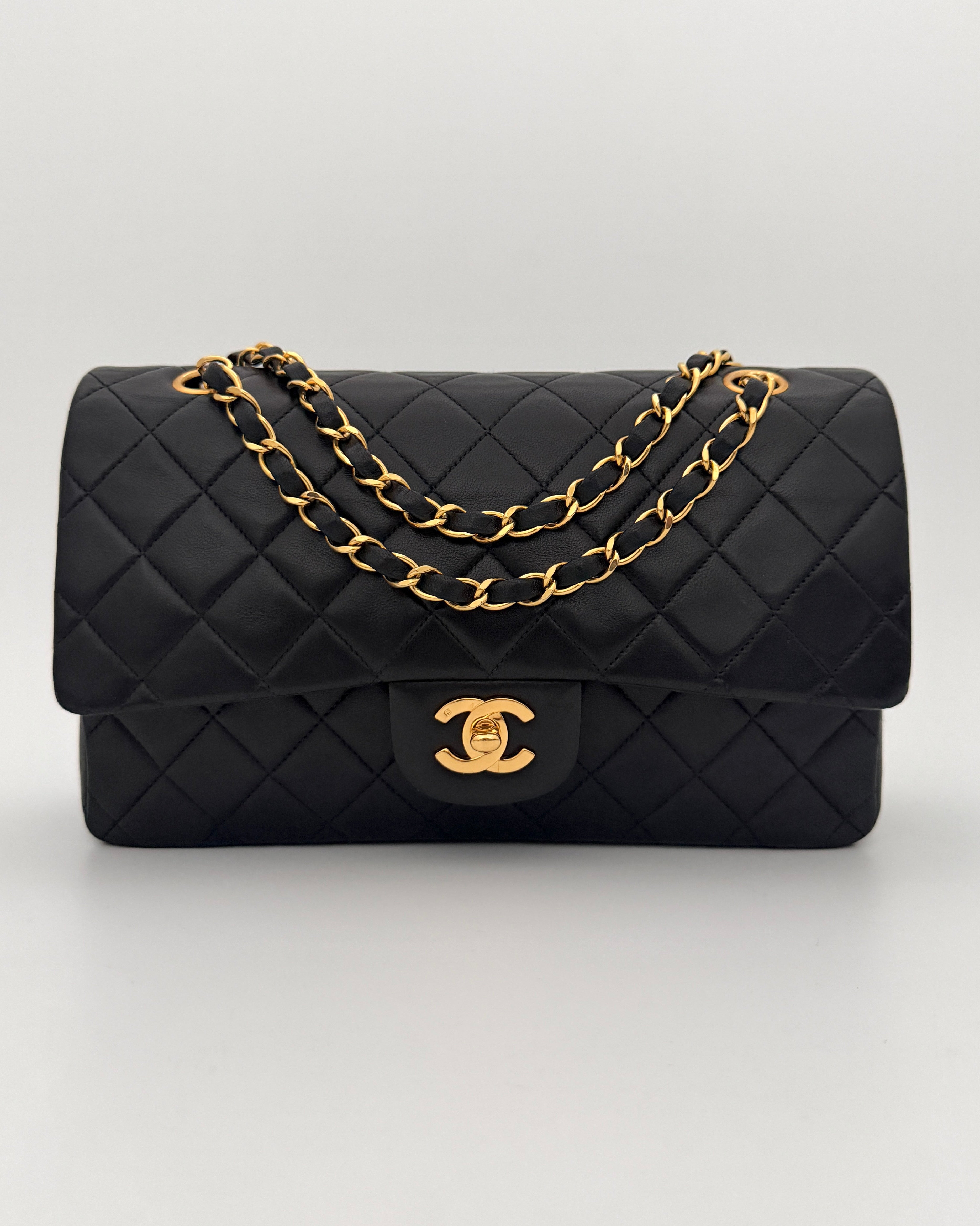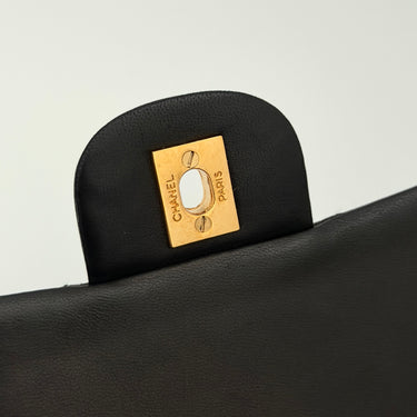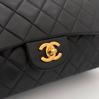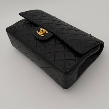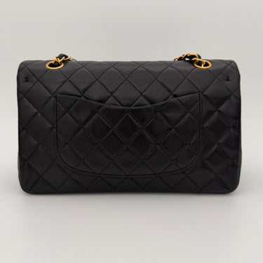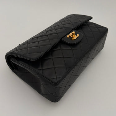 Bolso Chanel Timeless 25 de doble solapa en cuero negro con detalles metálicos en dorado.
