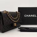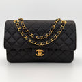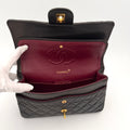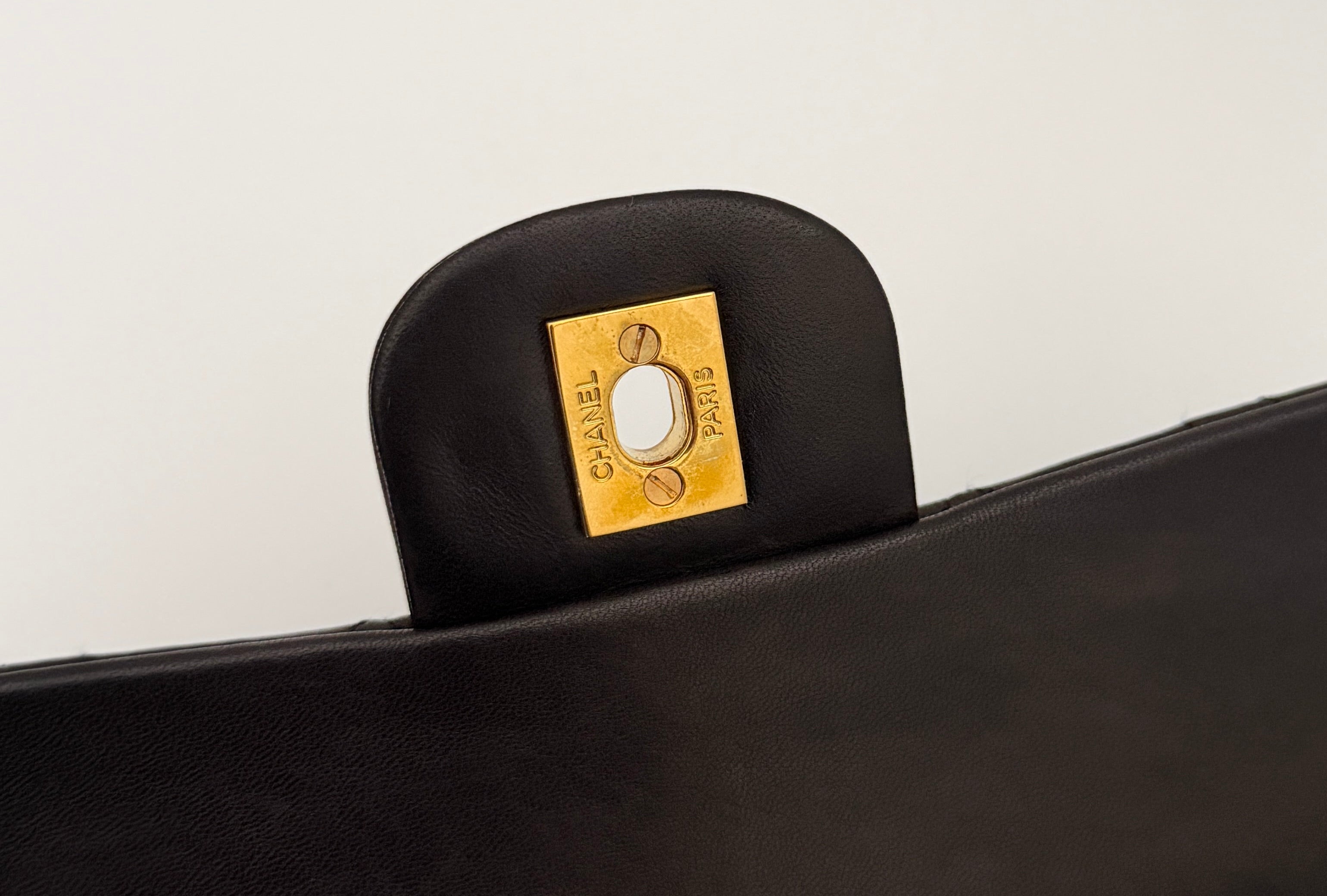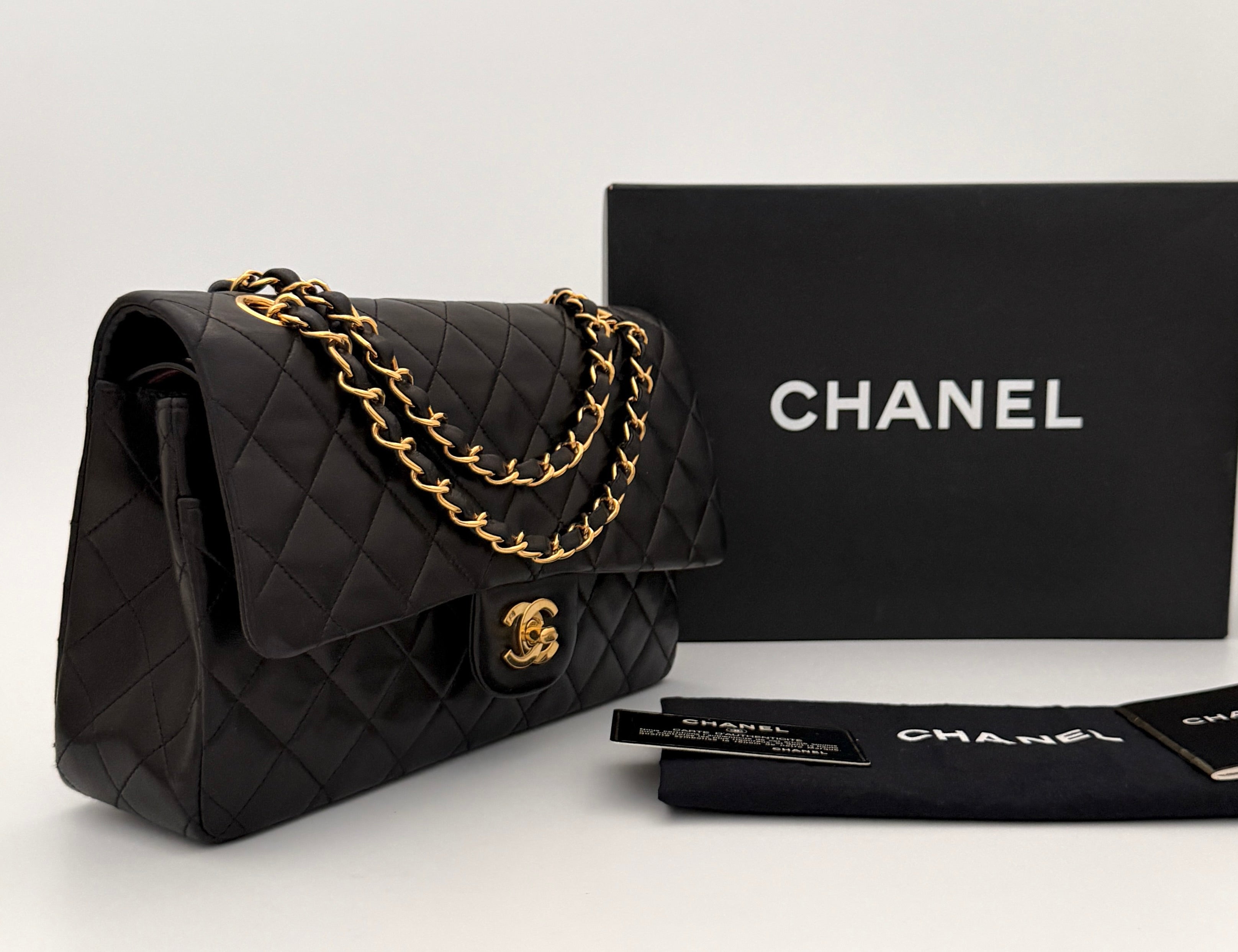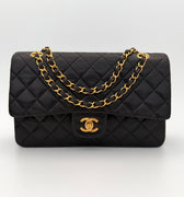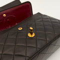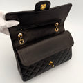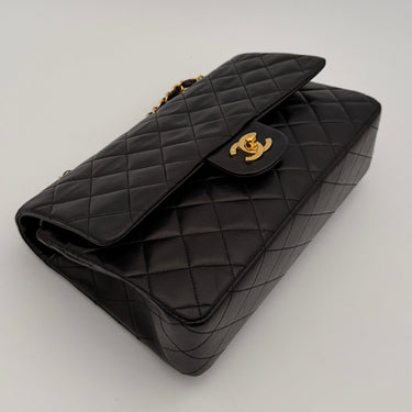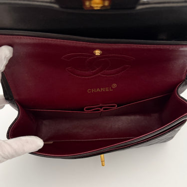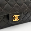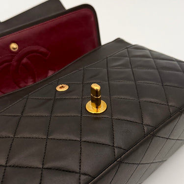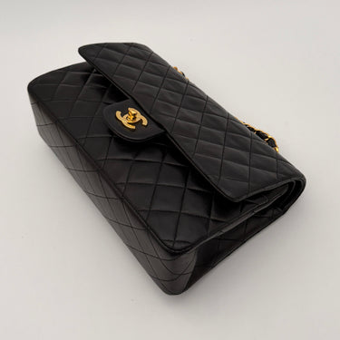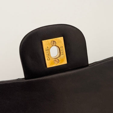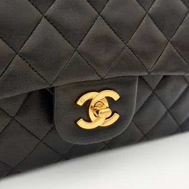 Bolso Chanel Timeless 25 de doble solapa en cuero negro con detalles metálicos en dorado.
