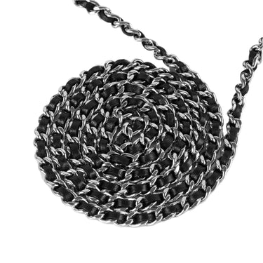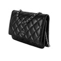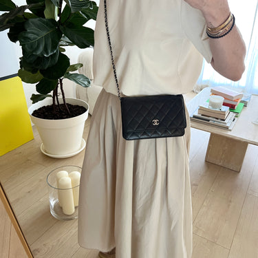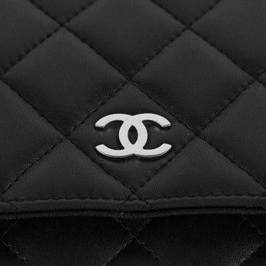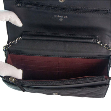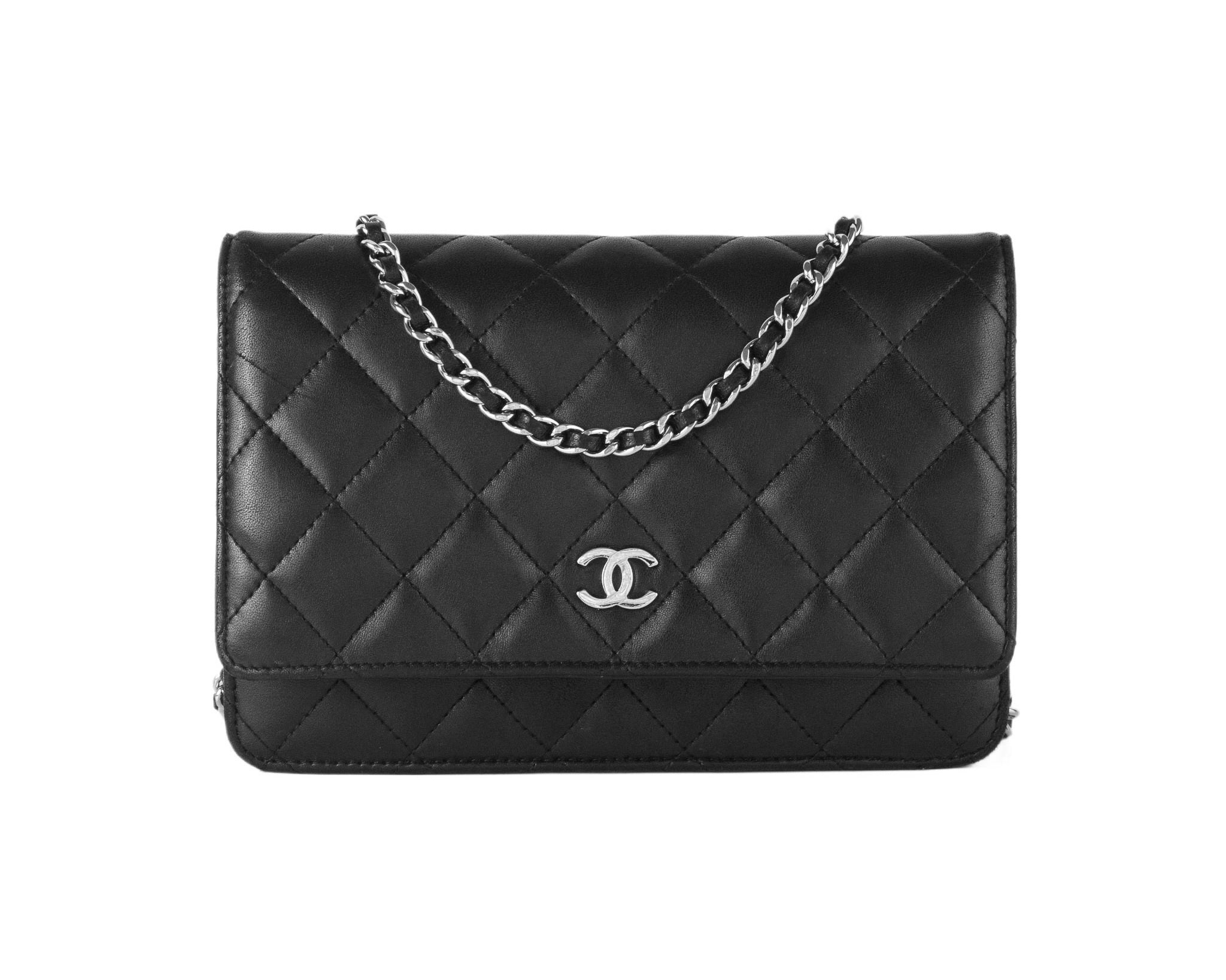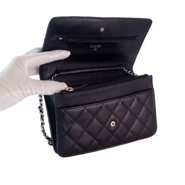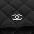 Chanel WOC en cuero negro con detalles metálicos en plateado.