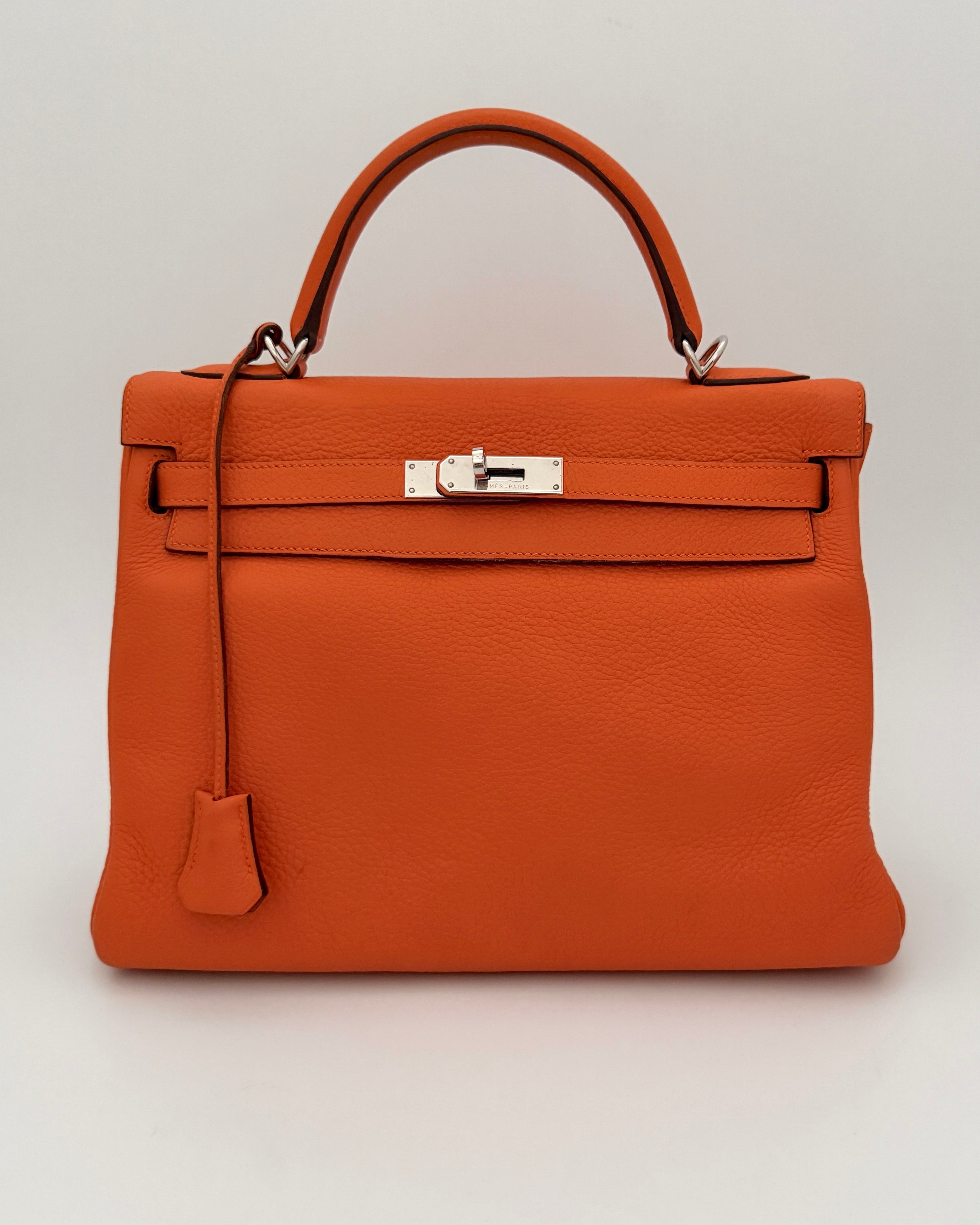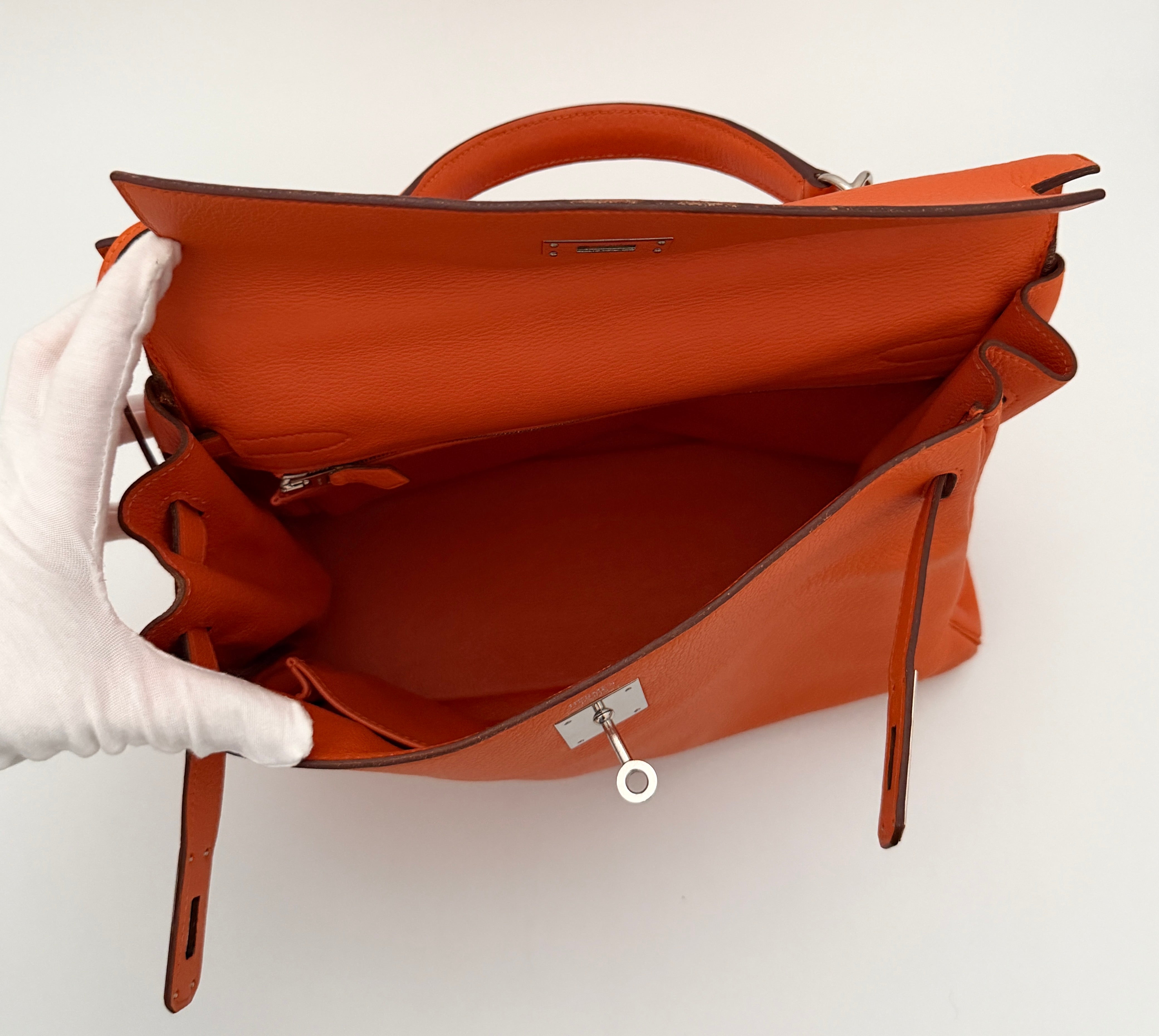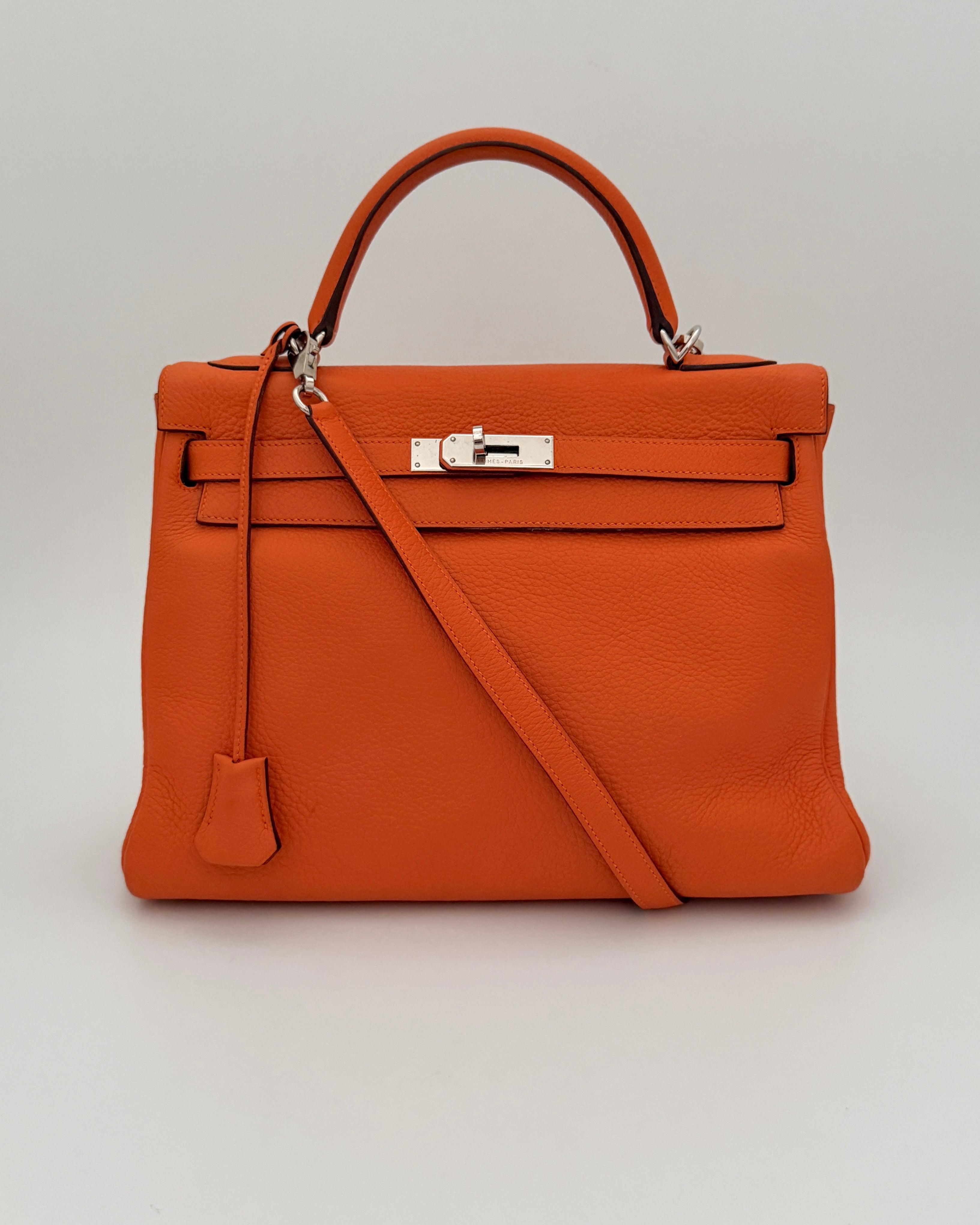 Bolso Hermès Kelly 32 en cuero color naranja y detalles metálicos en plateado.