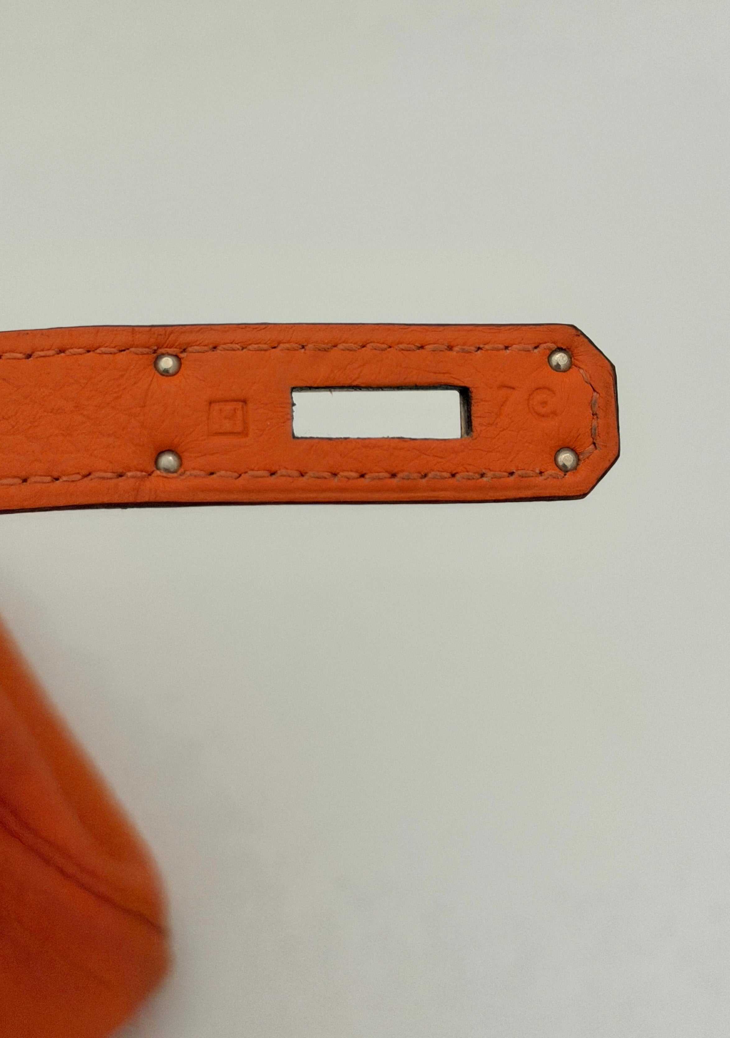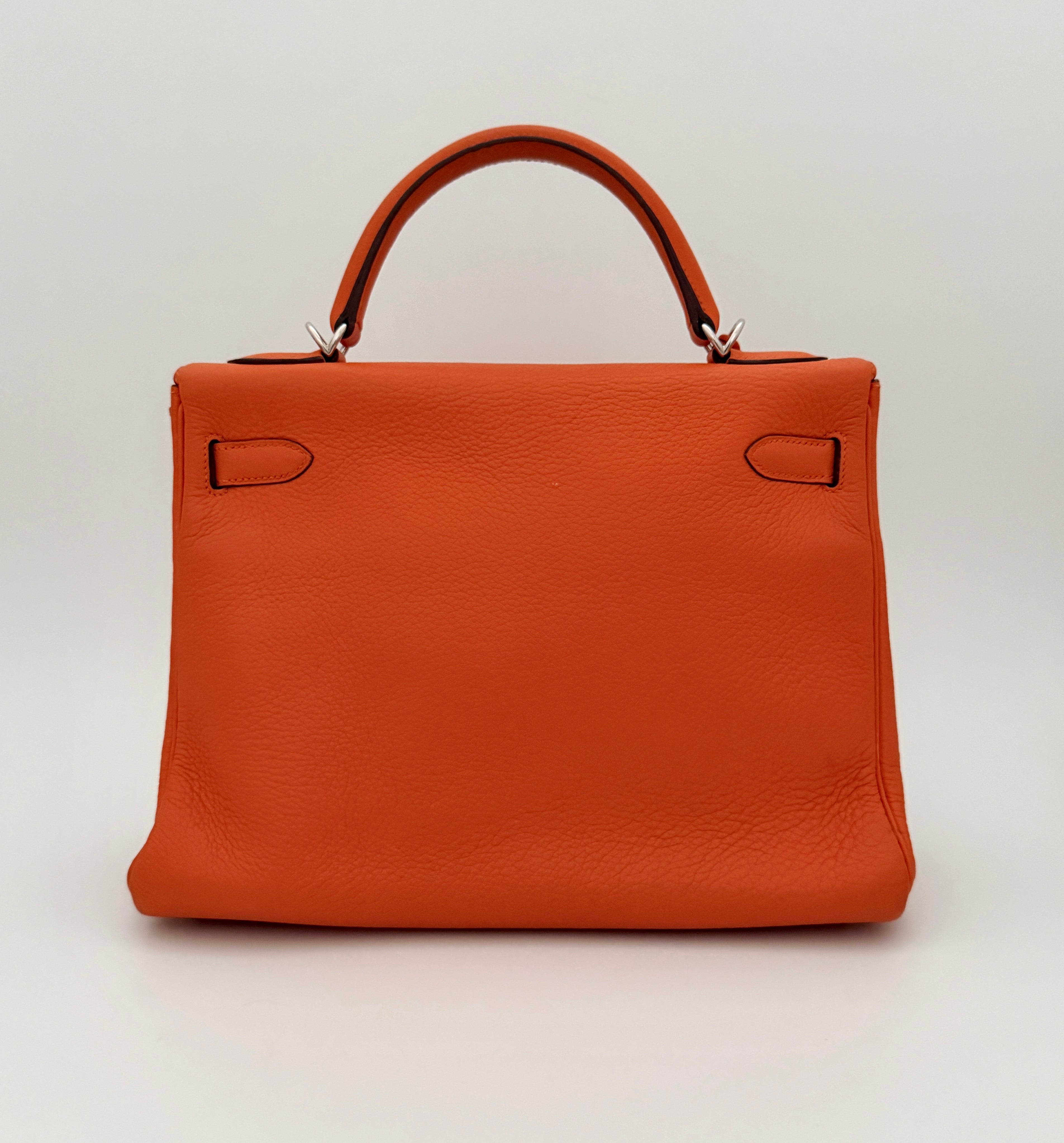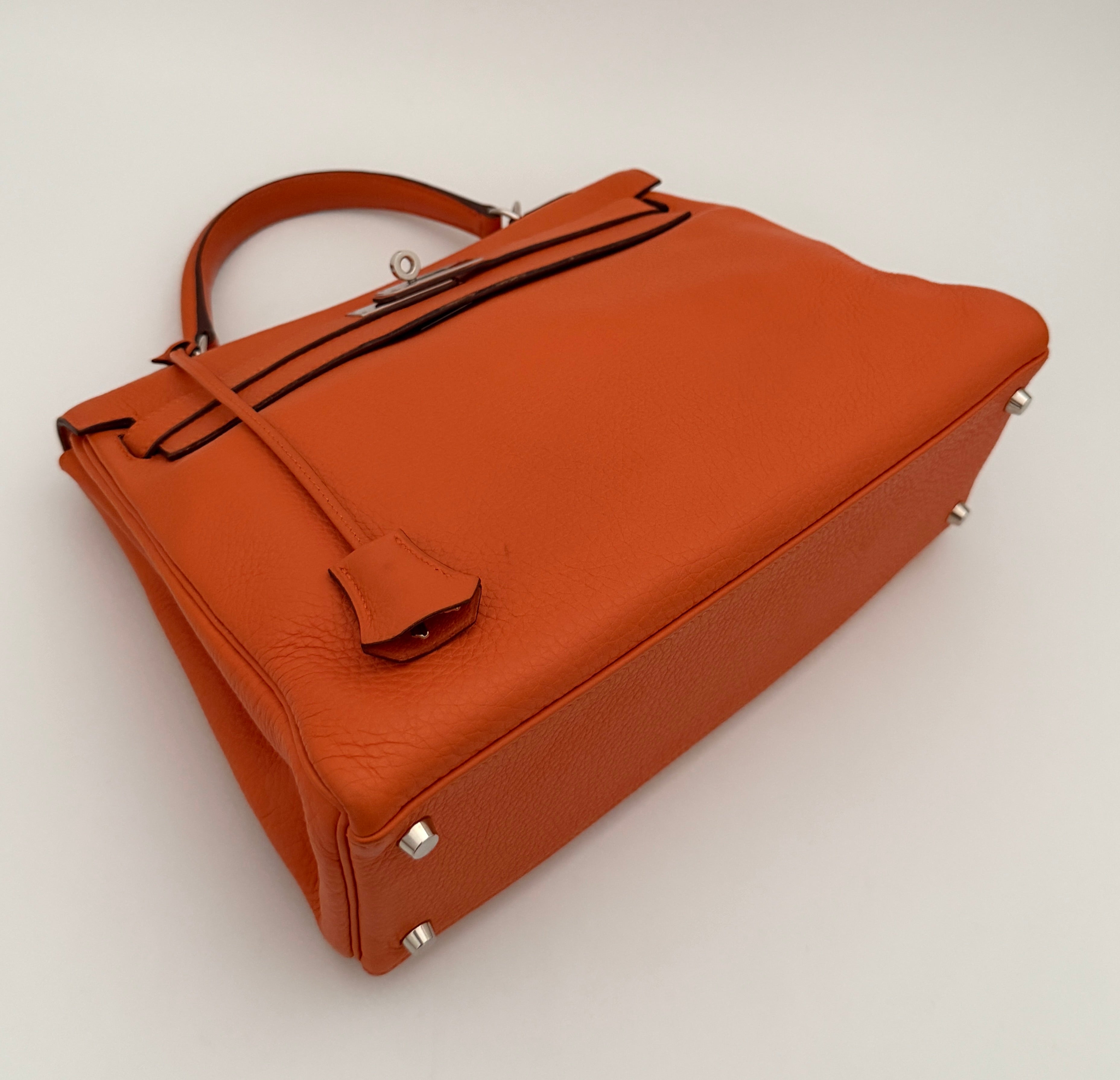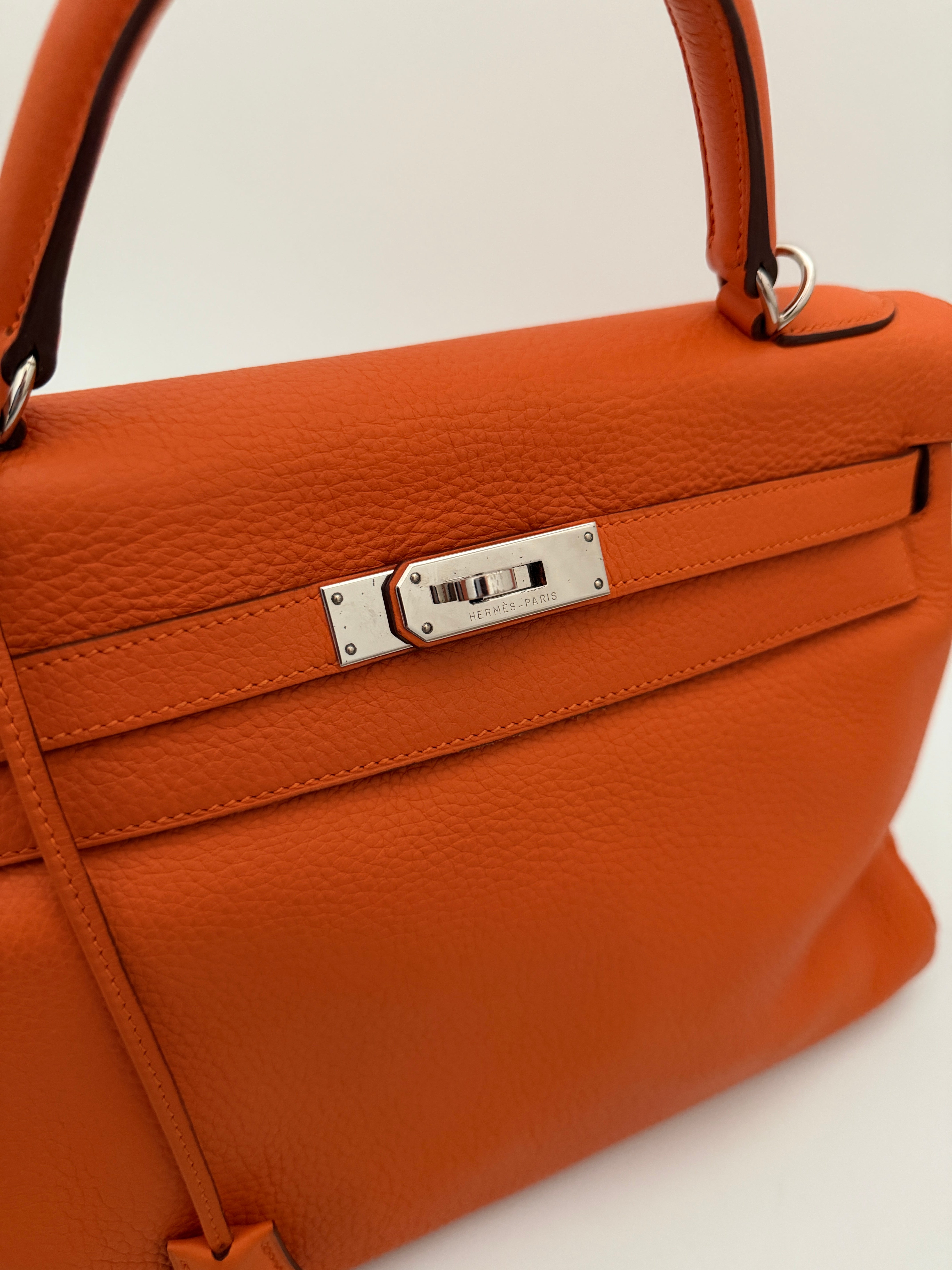 Bolso Hermès Kelly 32 en cuero color naranja y detalles metálicos en plateado.